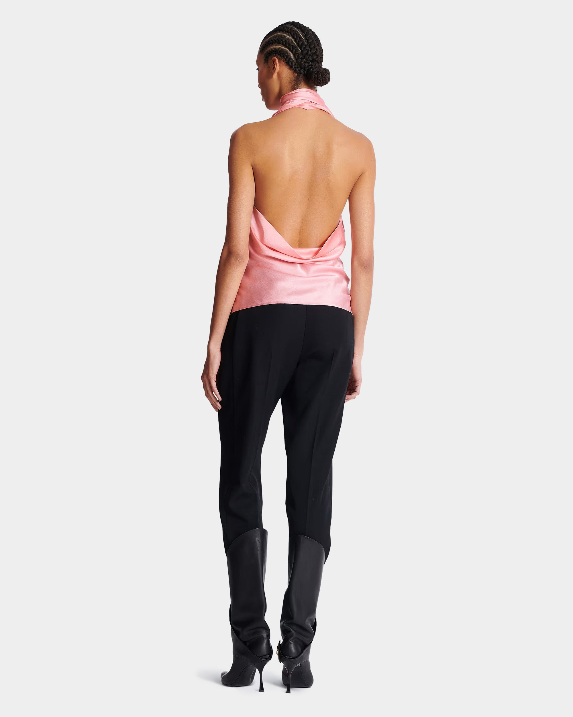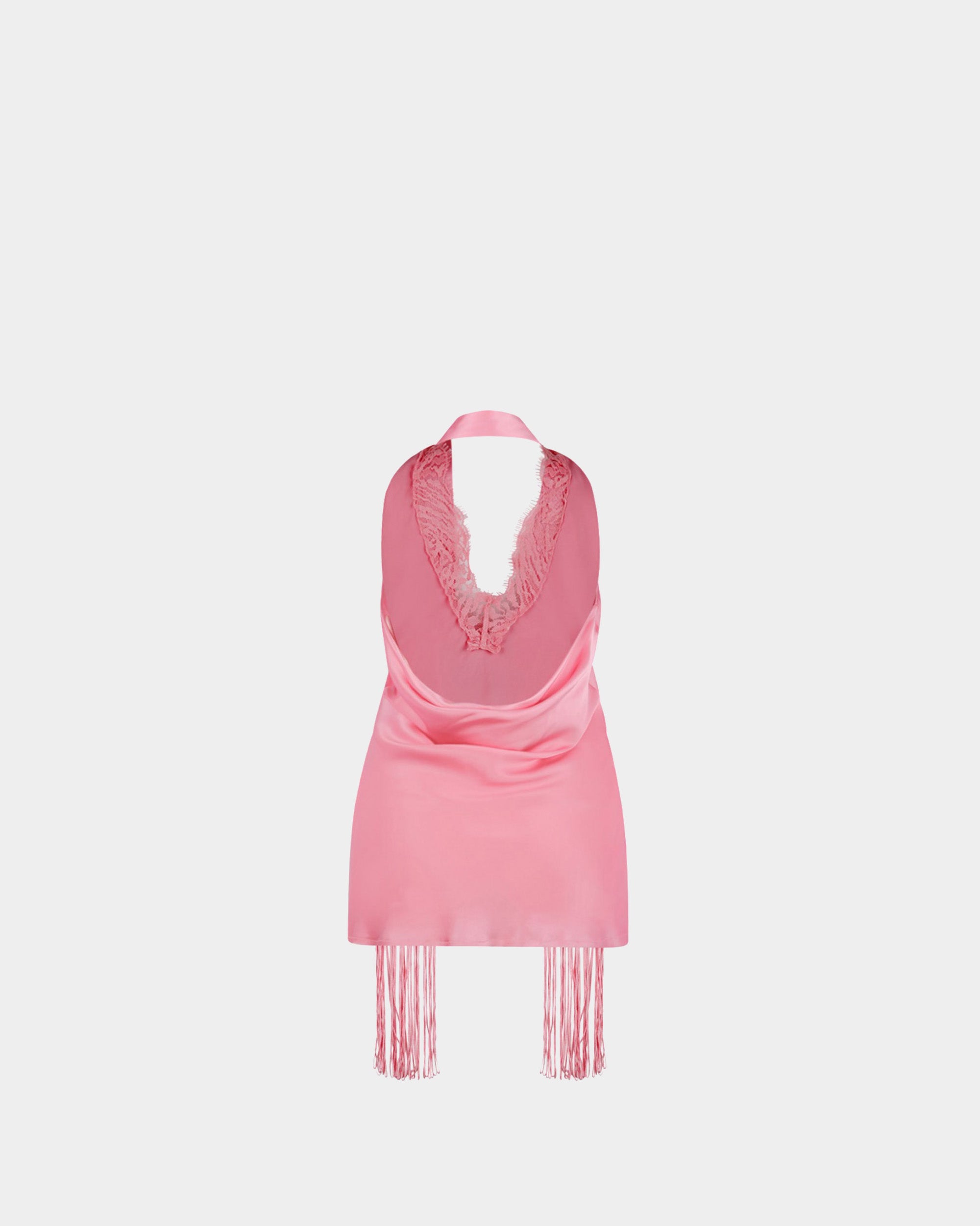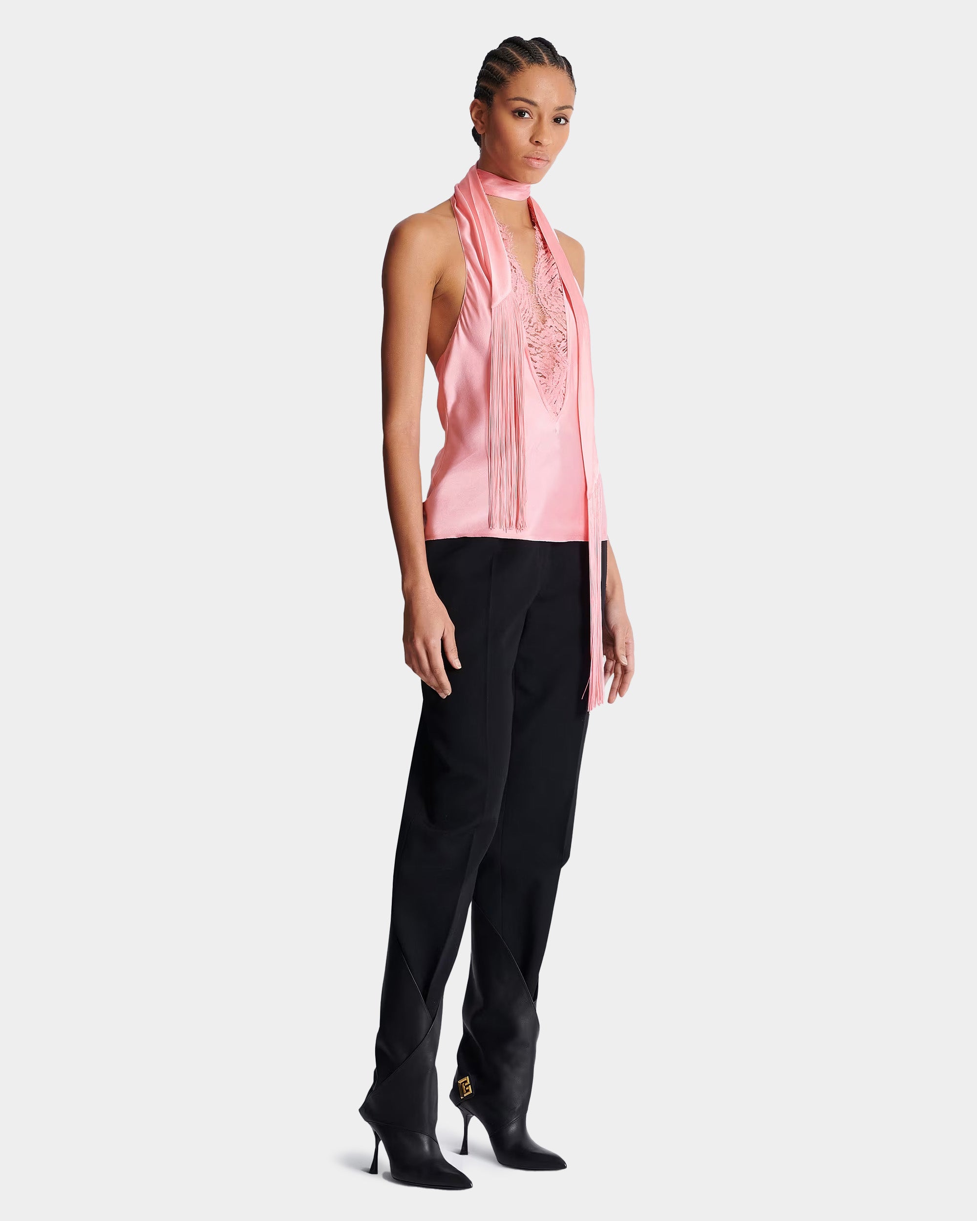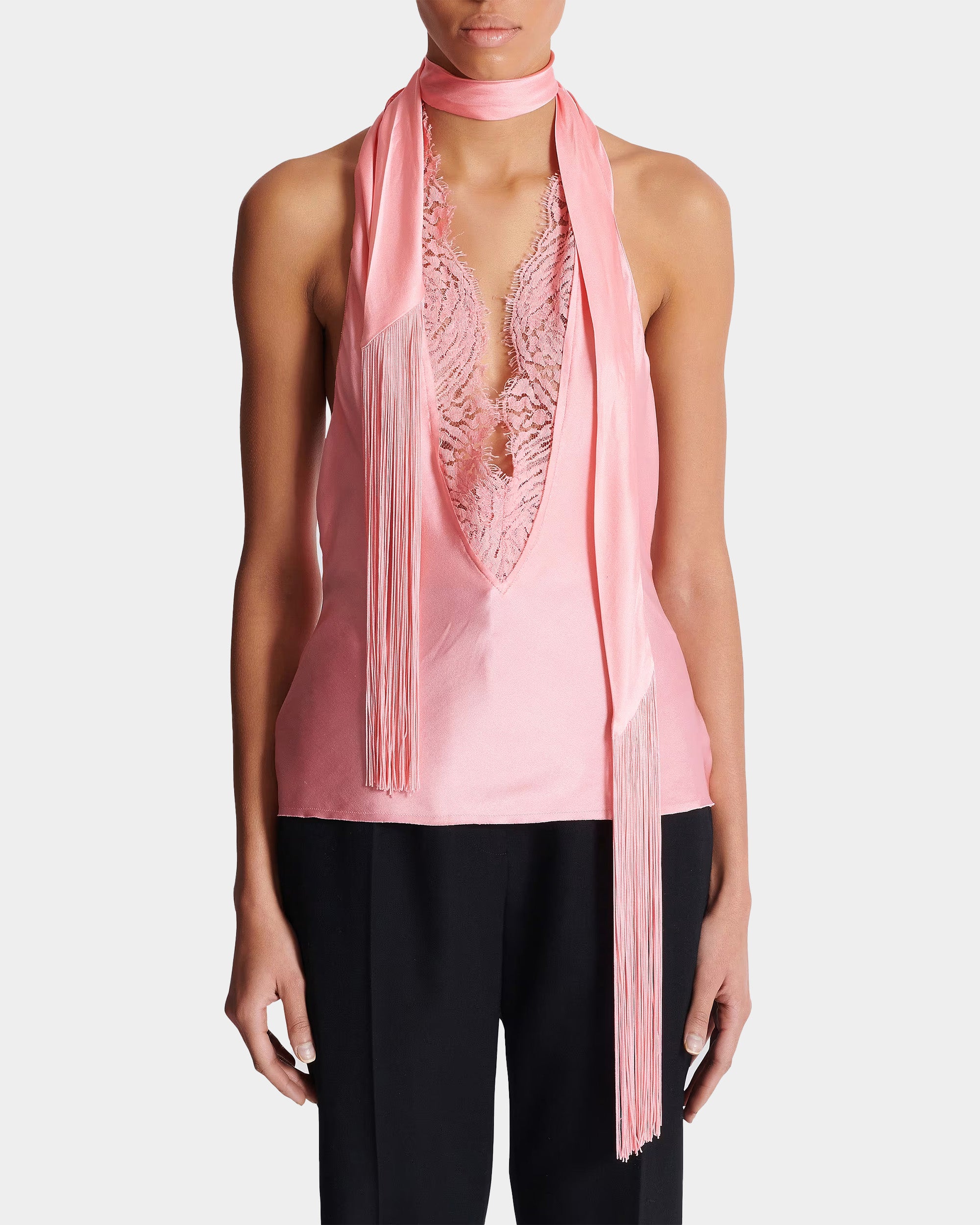 BALMAIN 粉色緞面流蘇露背上衣