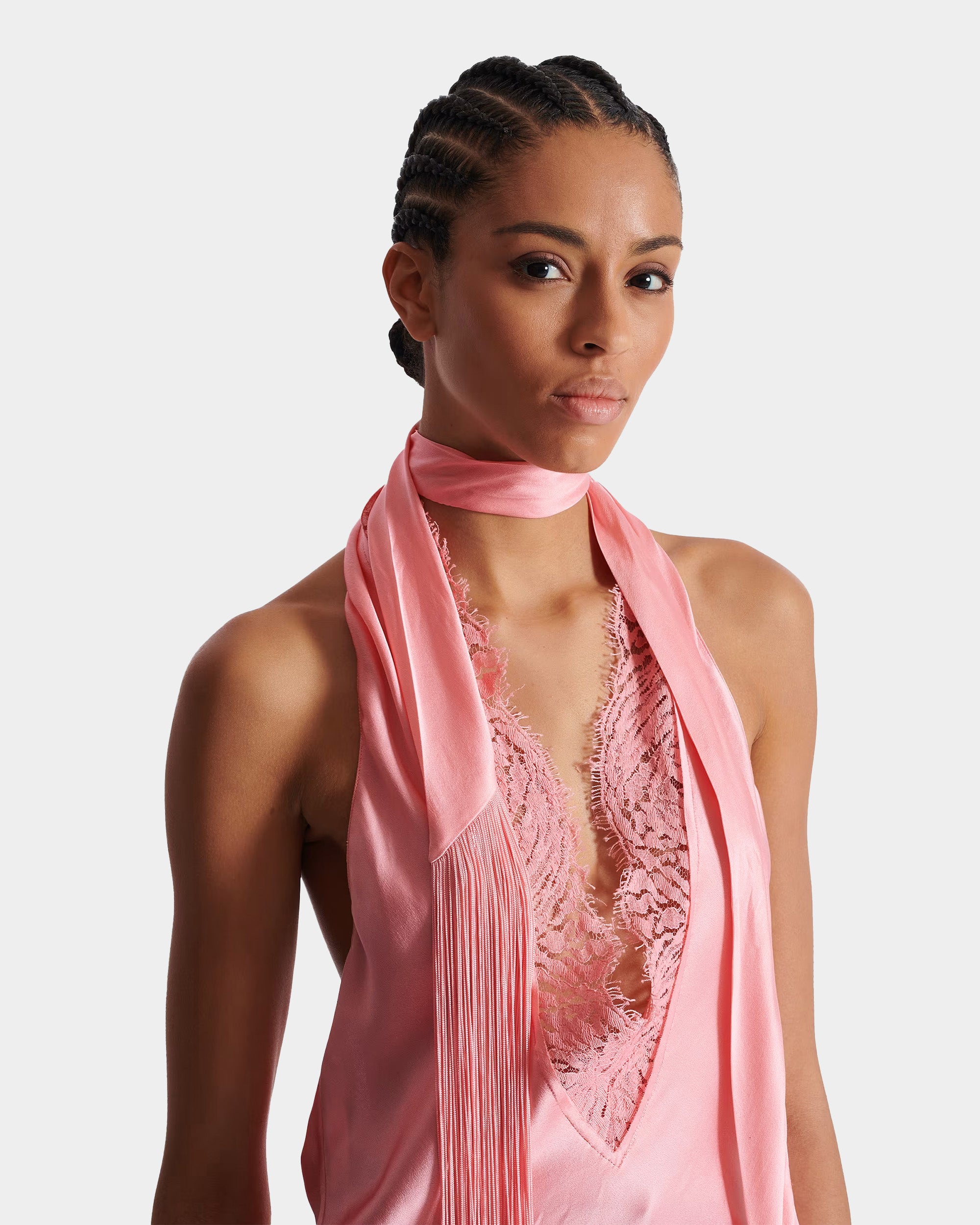 採用絲滑緞面布料打造,柔亮光澤感增添高級氛圍。深V領口拼接蕾絲細節,展現女性優雅線條;背部全露設計搭配長流蘇裝飾,隨步伐搖曳出俐落性感魅力。頸後綁帶方便調節,是派對或晚宴中吸睛的亮點單品。