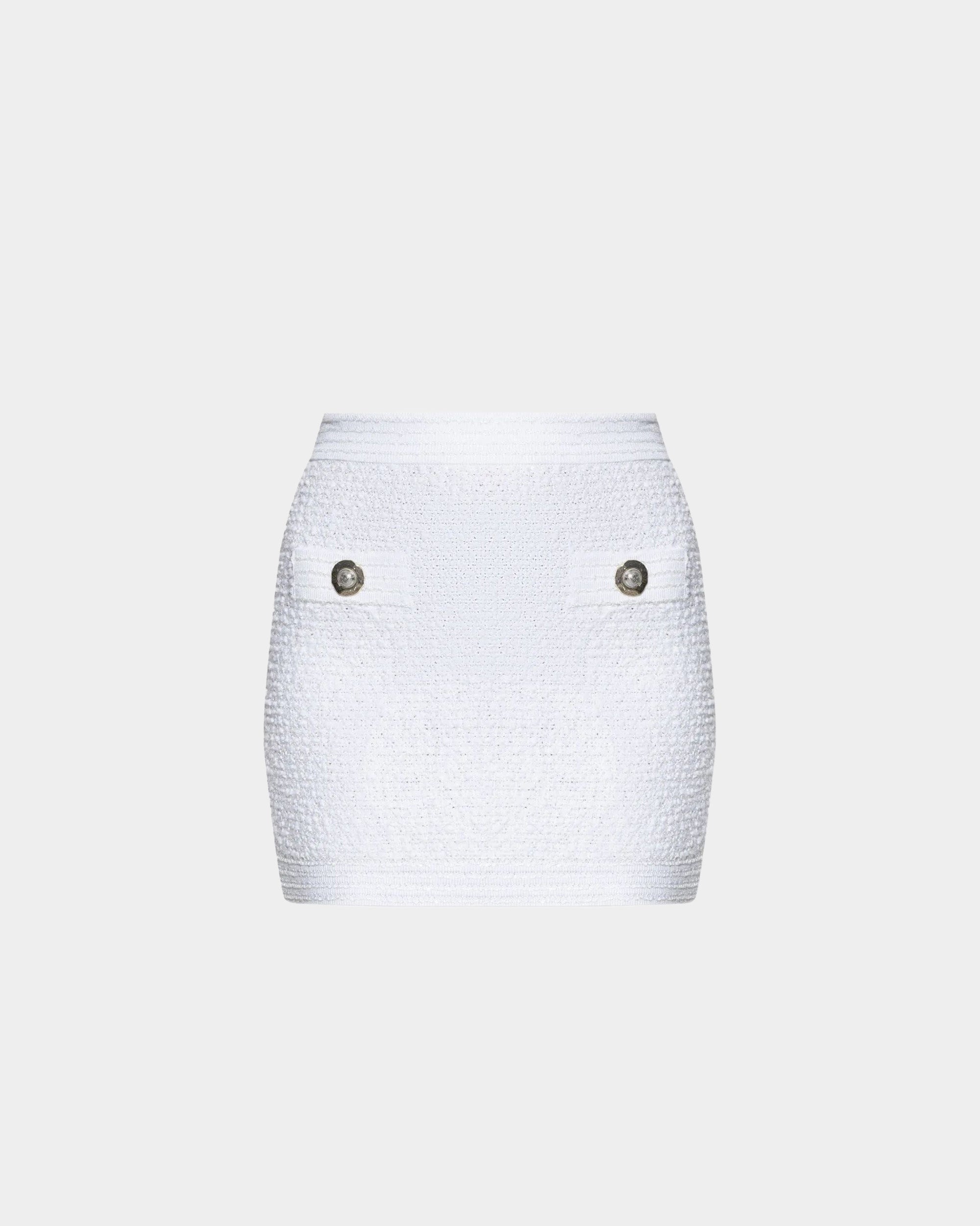 迷你裙於正面口袋處點綴品牌標誌性金屬獅頭扣,低調卻不失奢華。修身版型勾勒女性曲線,簡約純白設計展現高級質感,適合搭配同系列夾克或襯衫,營造摩登精緻套裝造型。