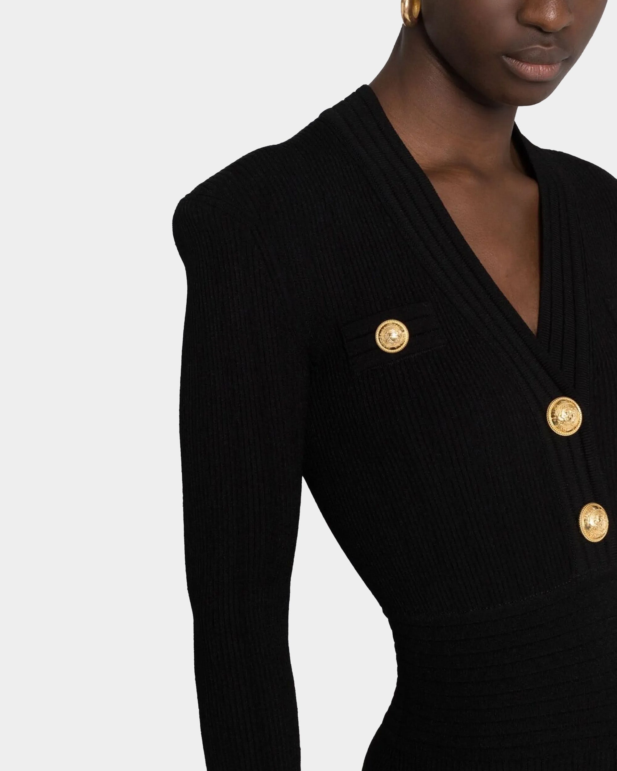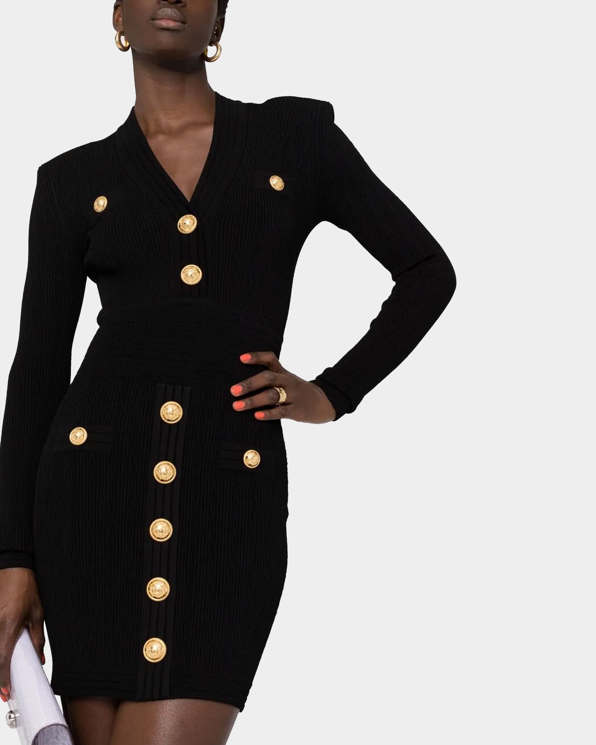 V-neck button detail knit dress, made of knit material, with embossed brand buttons, backless zipper design and shoulder pads, highlighting the modern and sophisticated sense. Simple yet elegant, it can be easily controlled for daily or formal occasions.