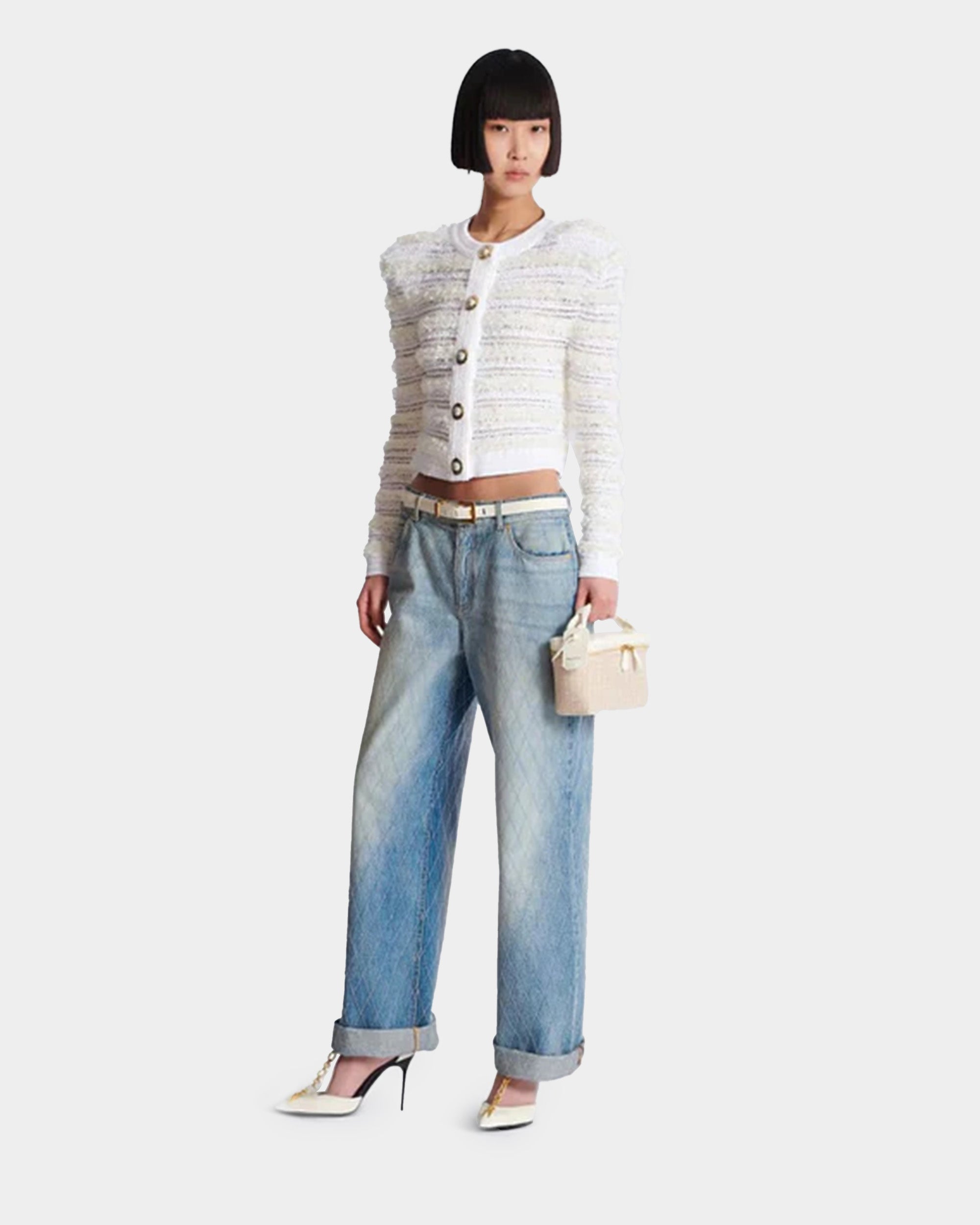 經典菱格紋壓紋設計,搭配淺藍水洗色調與直筒剪裁,呈現俐落中帶有優雅的復古氣息。