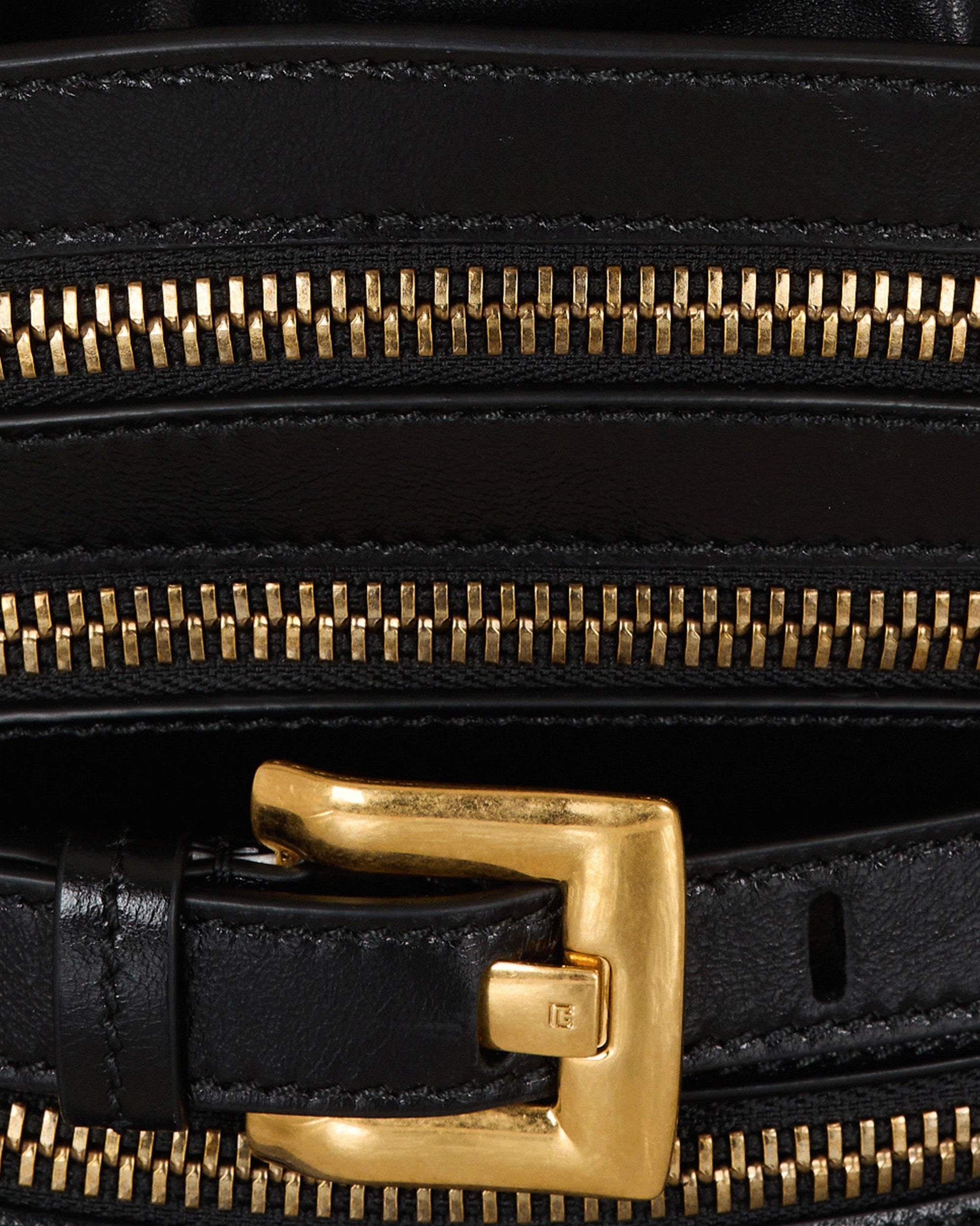 小牛皮迷你造型個性包,搭配金色腰帶式扣環與可拆式肩背帶,可手提、肩背或斜背,展現 BALMAIN 的結構感與奢華氣質。