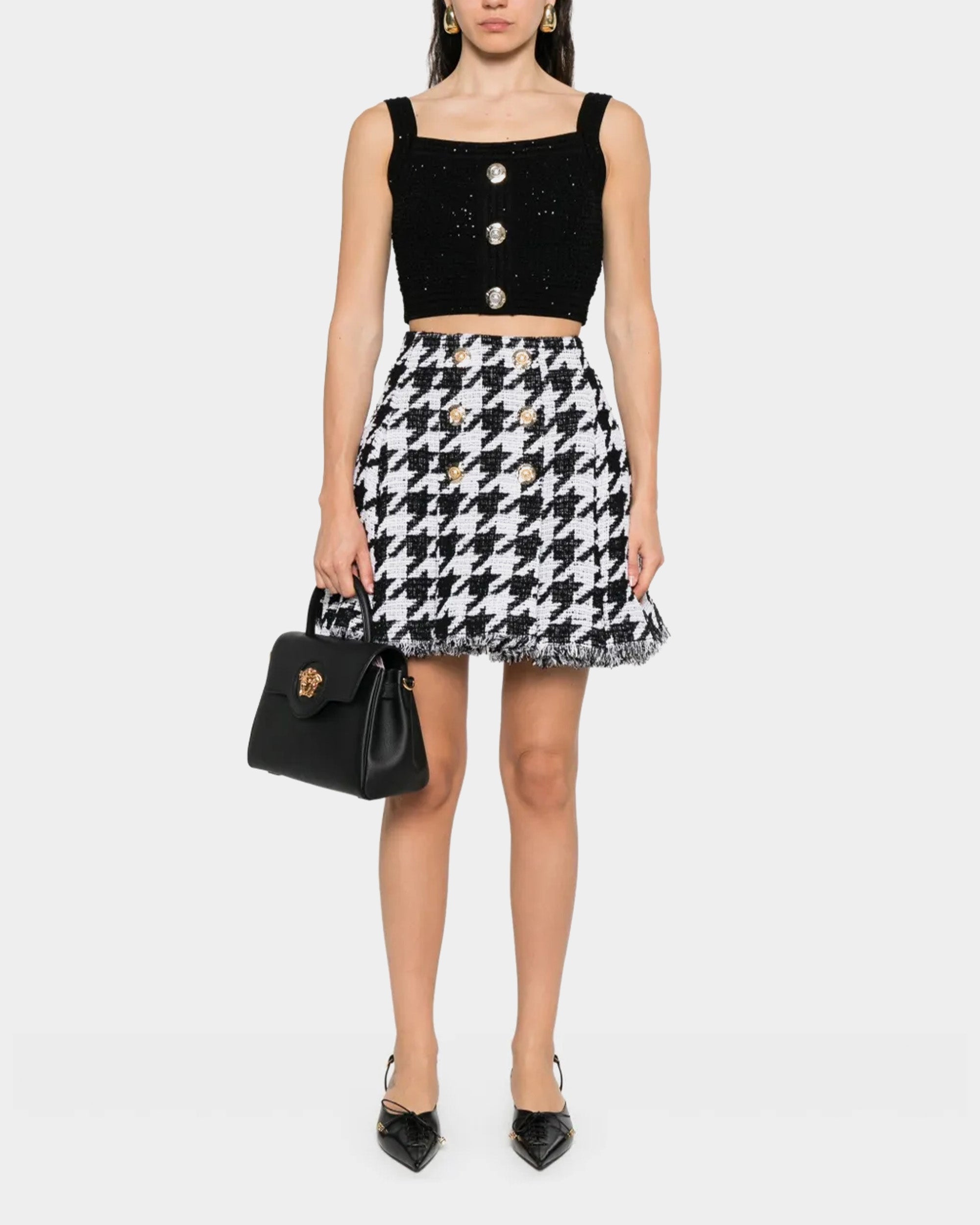 以挺的針織布料製成,短版設計凸顯俐落比例。方形領口搭配寬肩帶,展現簡約大方的線條感。前排飾有 Balmain 經典金色徽章釦,增添品牌辨識度。適合單穿或搭配高腰下裝,營造時尚摩登造型。
