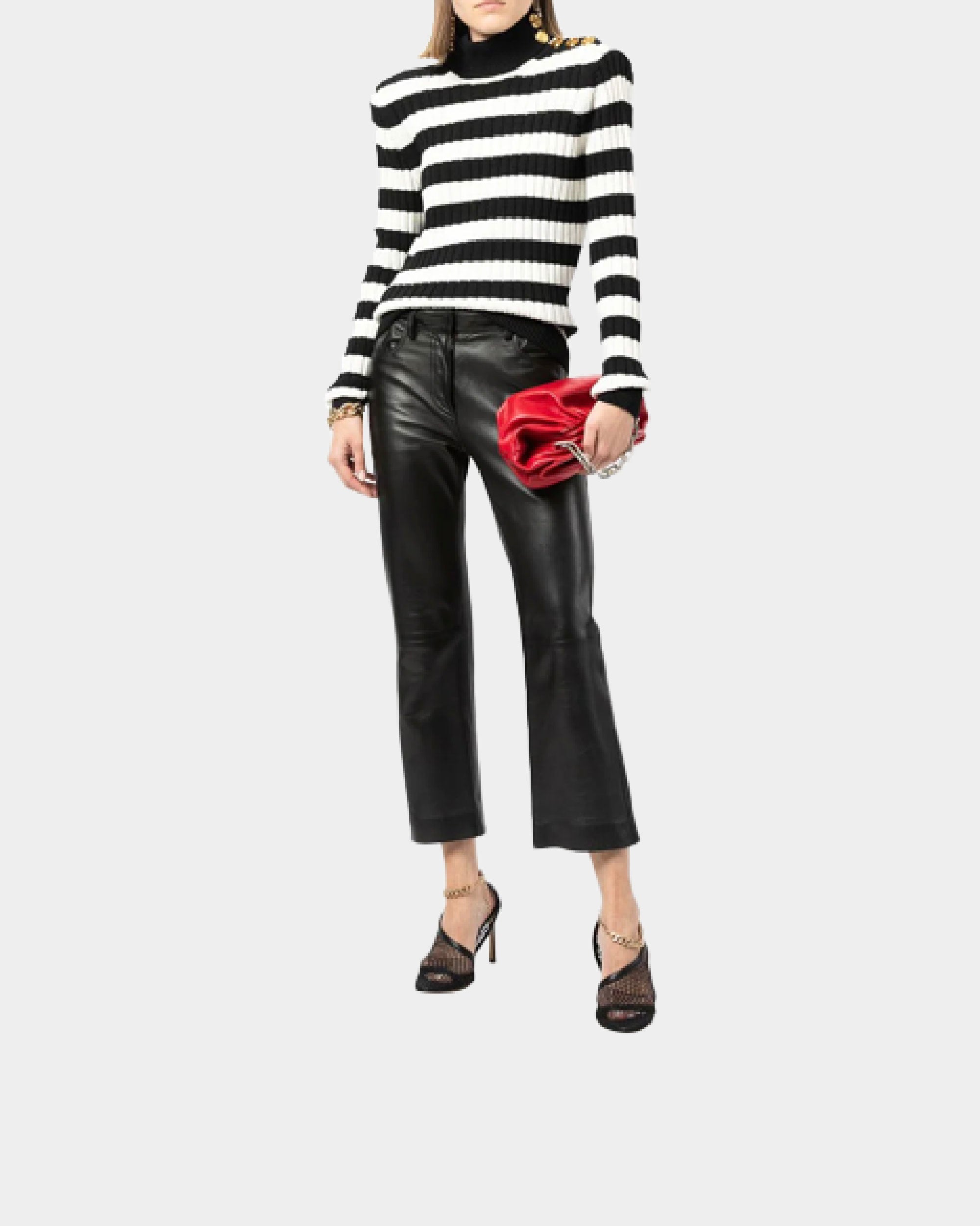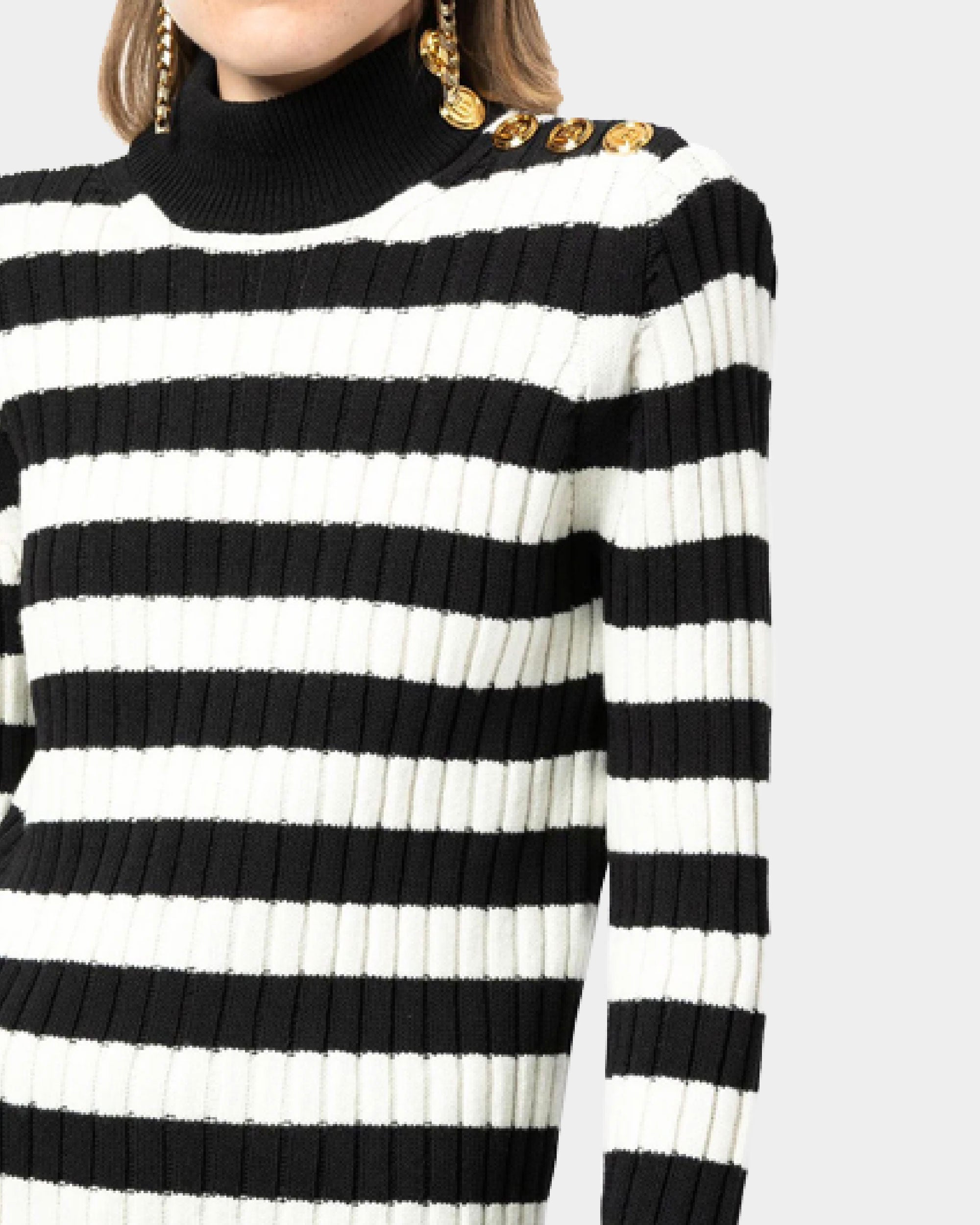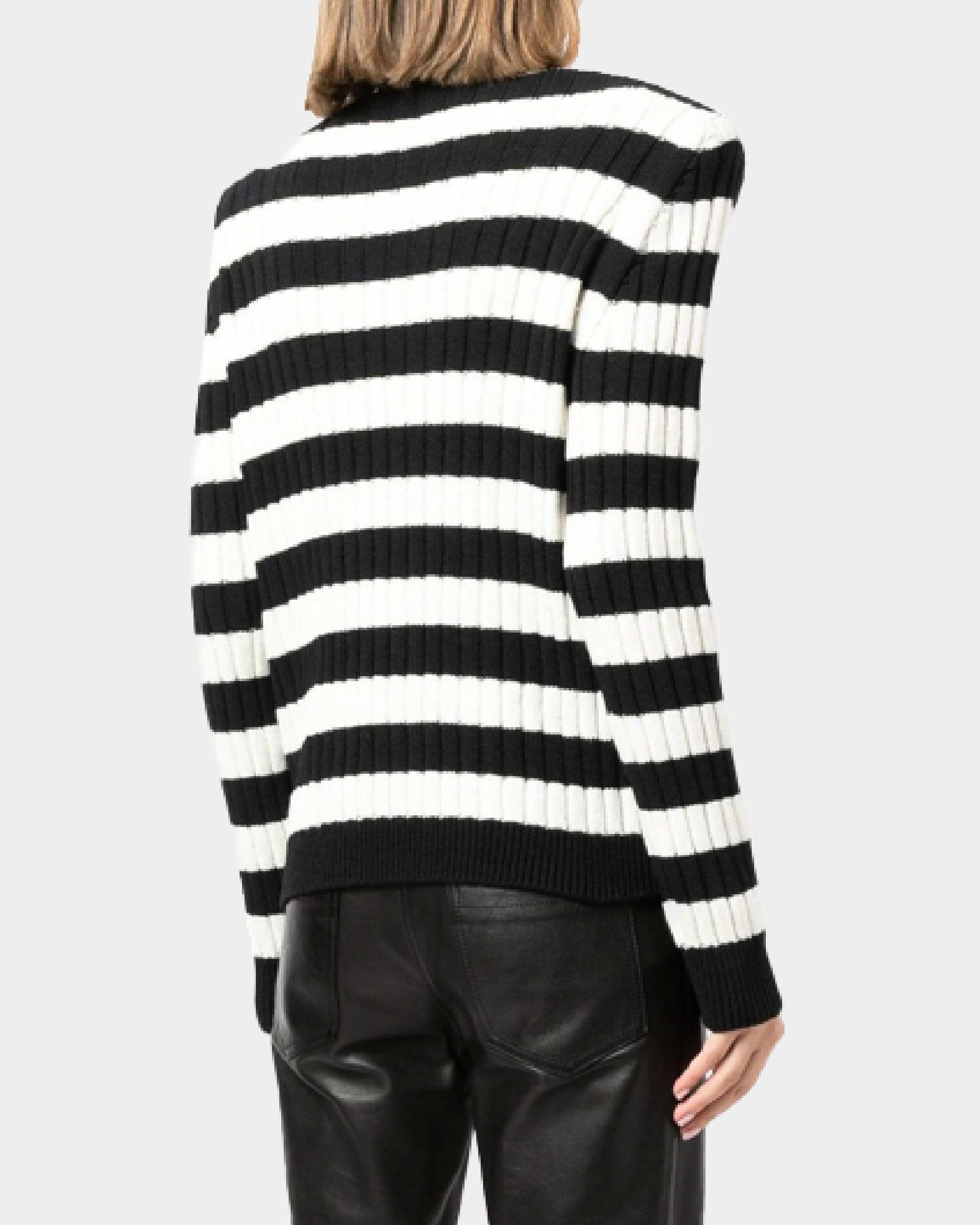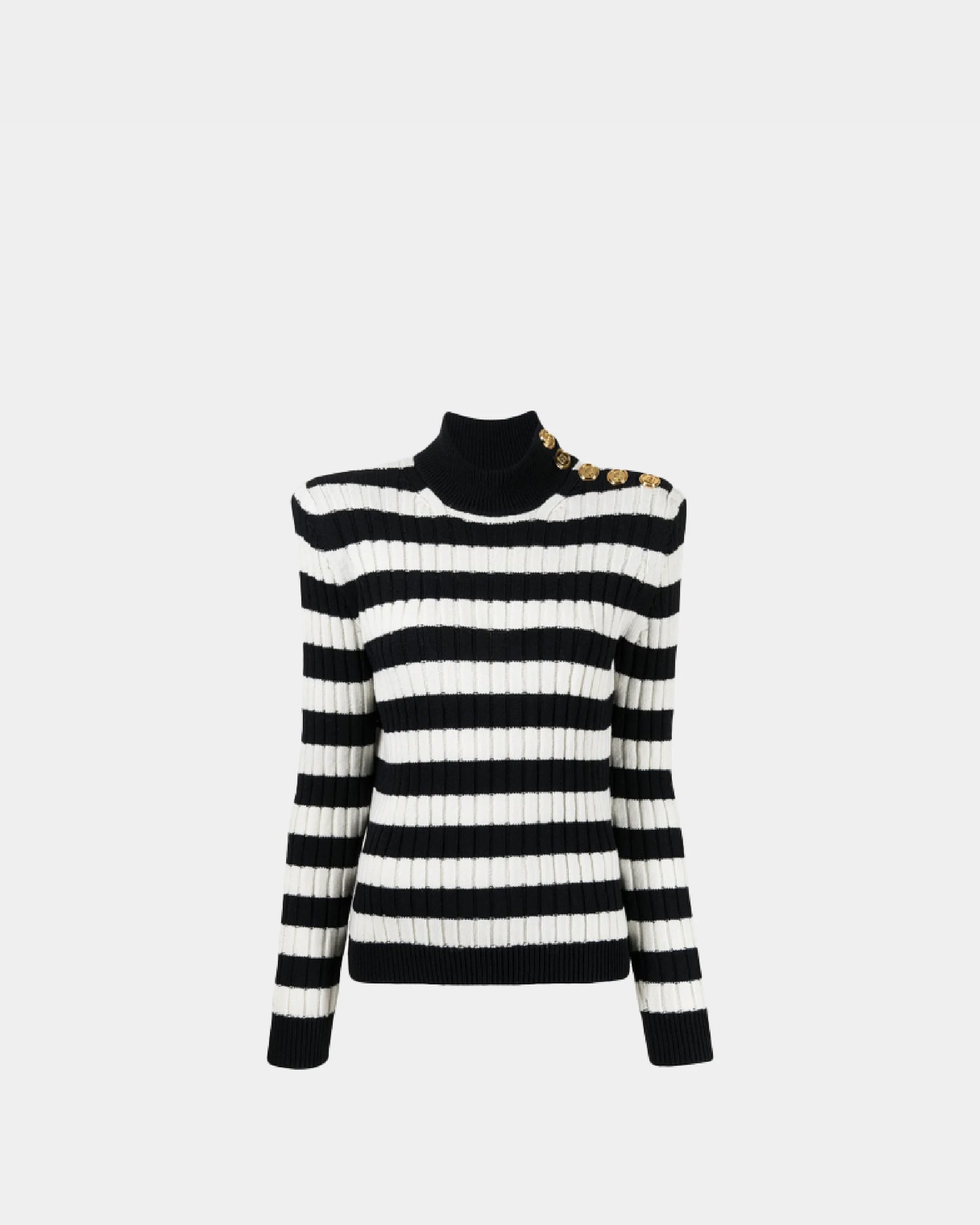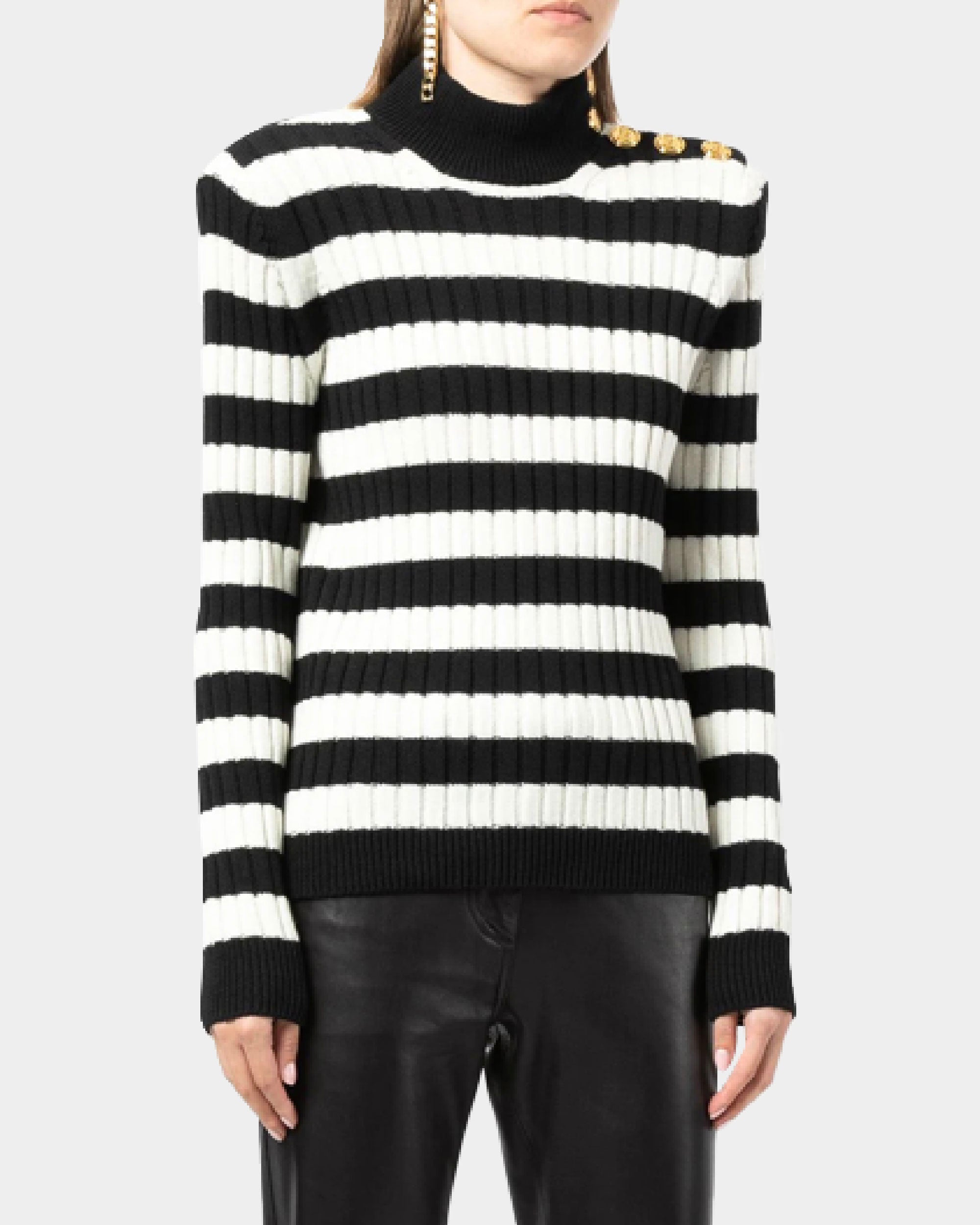This black and white virgin wool blend striped ribbed knit sweater from Balmain features a horizontal striped pattern, shoulder pads, button closures at the shoulders and long sleeves.
