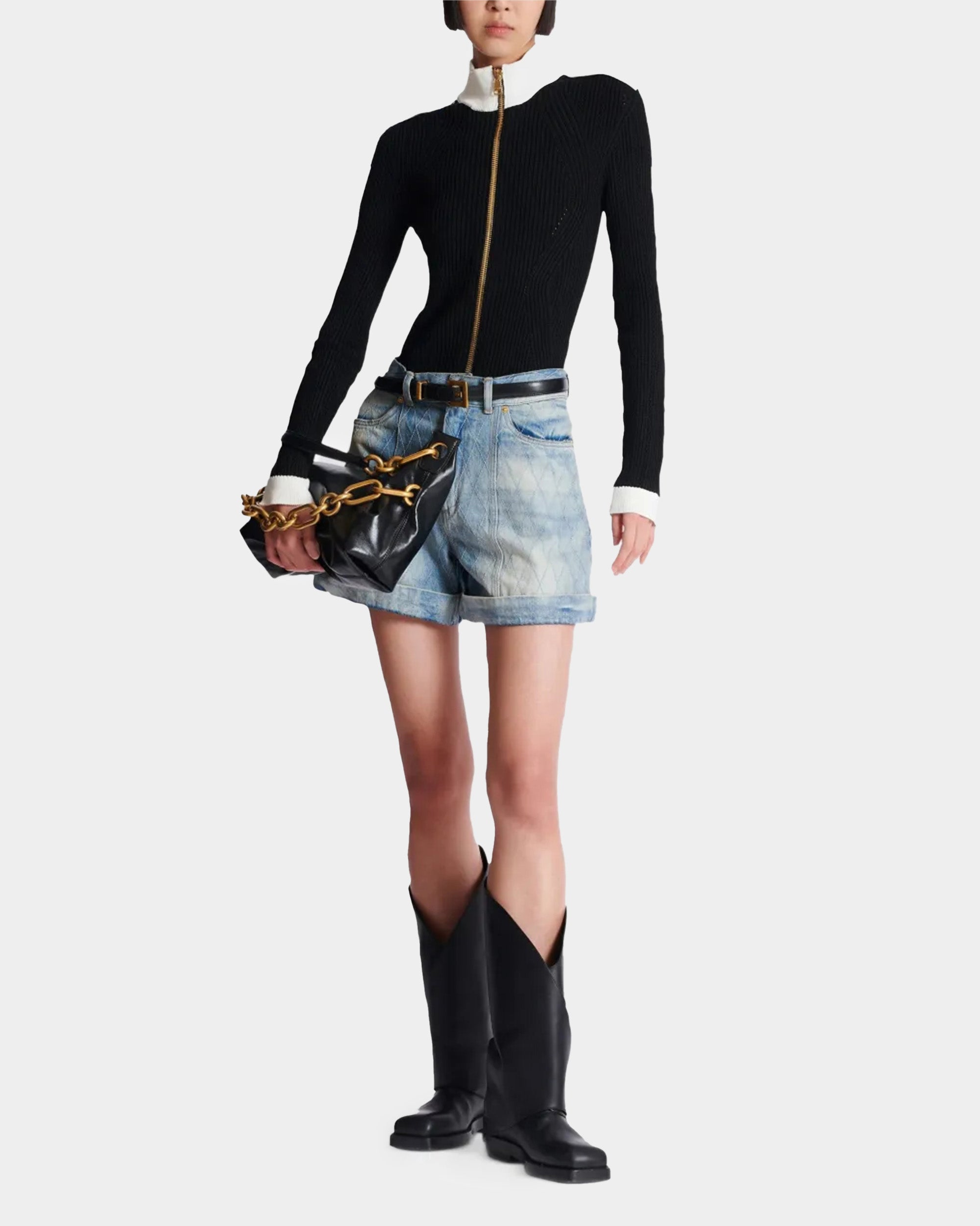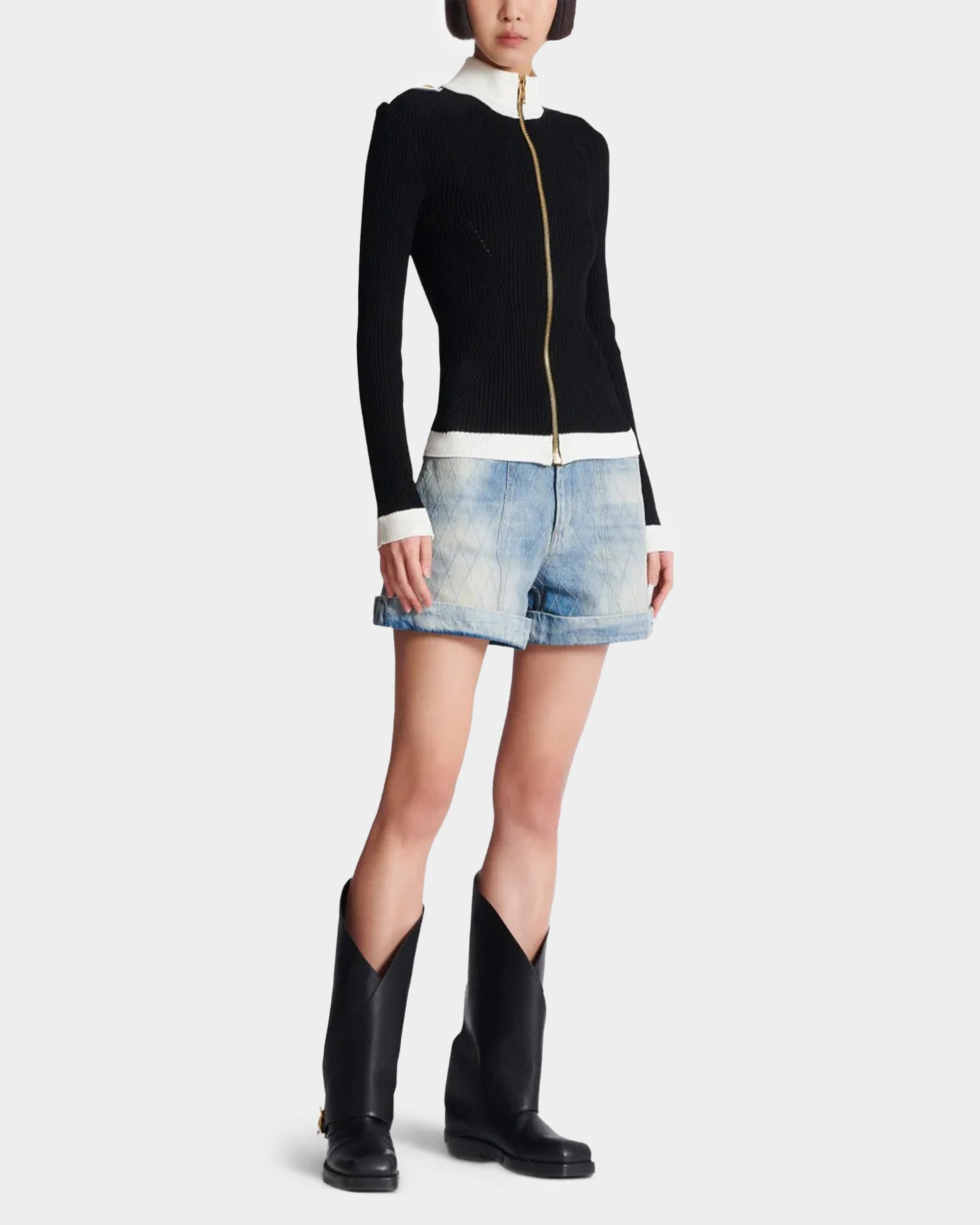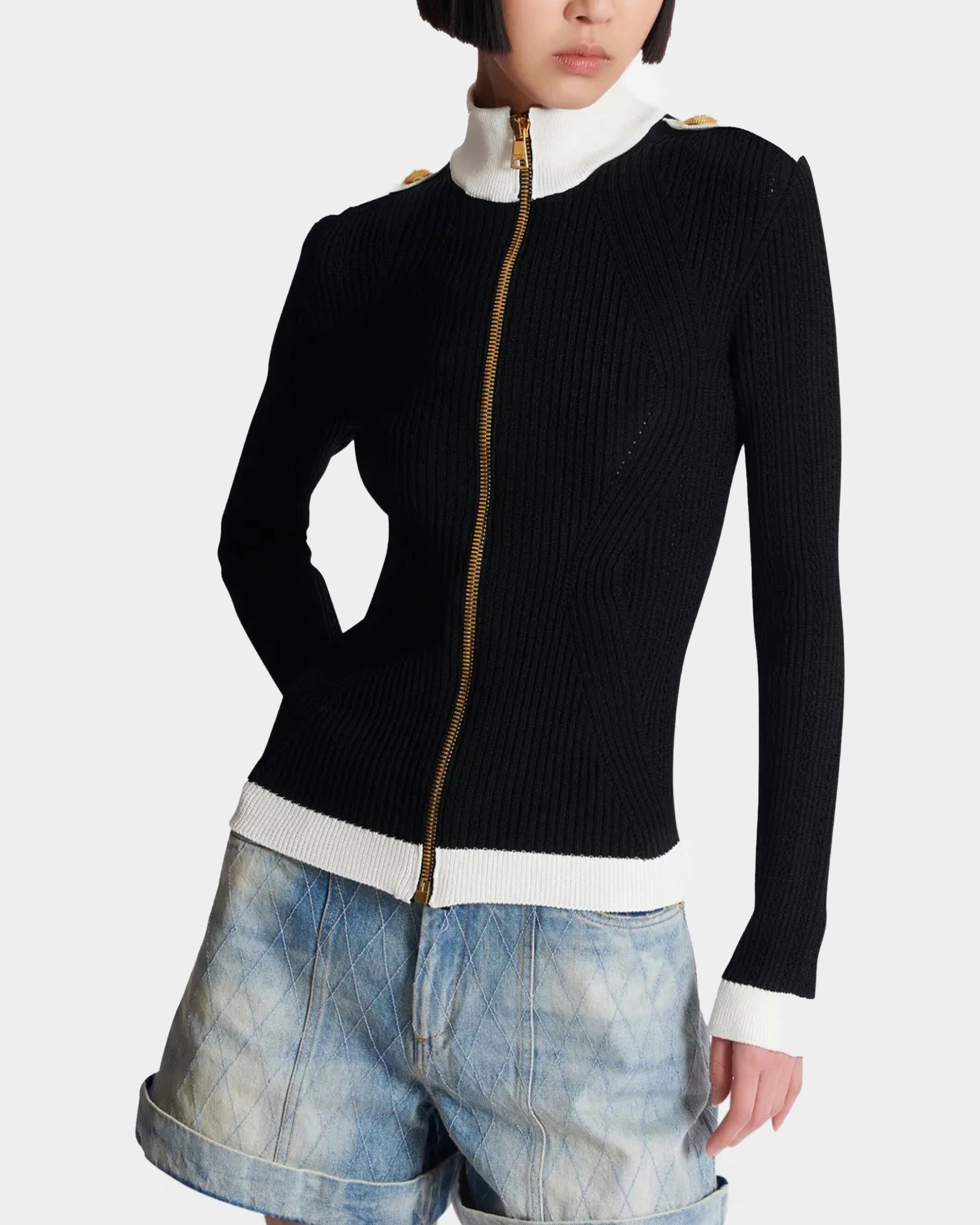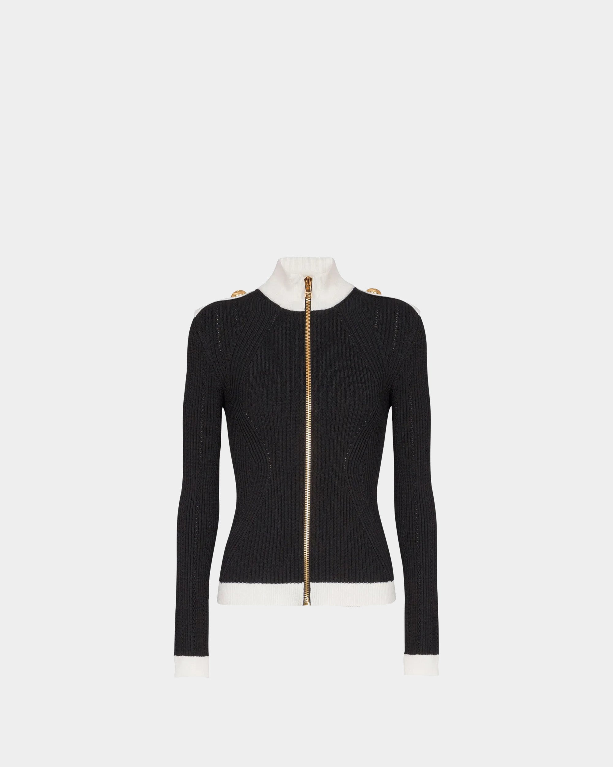 羅紋針織布料打造,修身剪裁展現俐落身形。黑白撞色設計營造鮮明對比,前中金屬拉鍊與肩部金色徽章釦細節,呼應品牌標誌性元素。高領與長袖設計兼具保暖與時尚感,適合日常或正式場合穿搭。