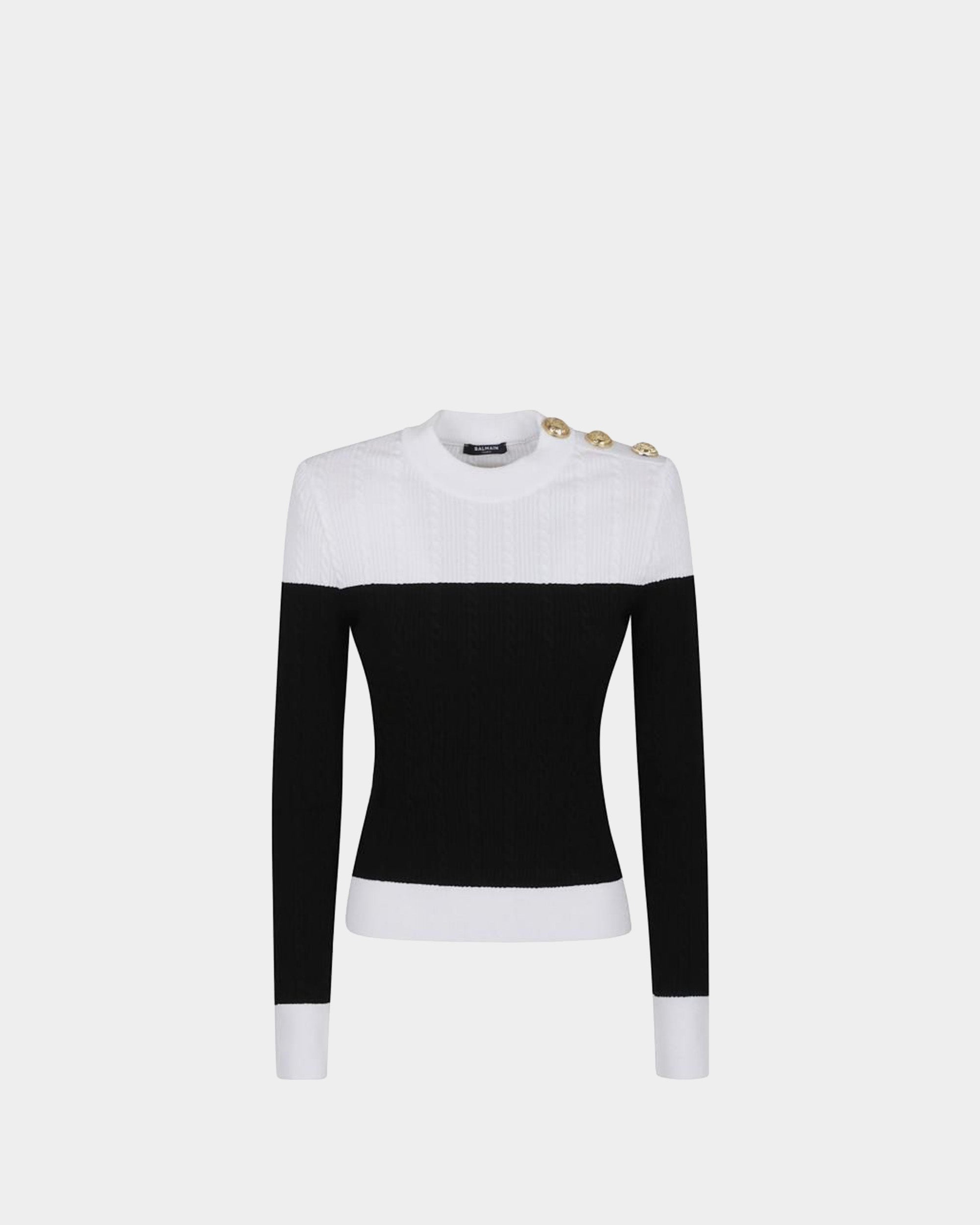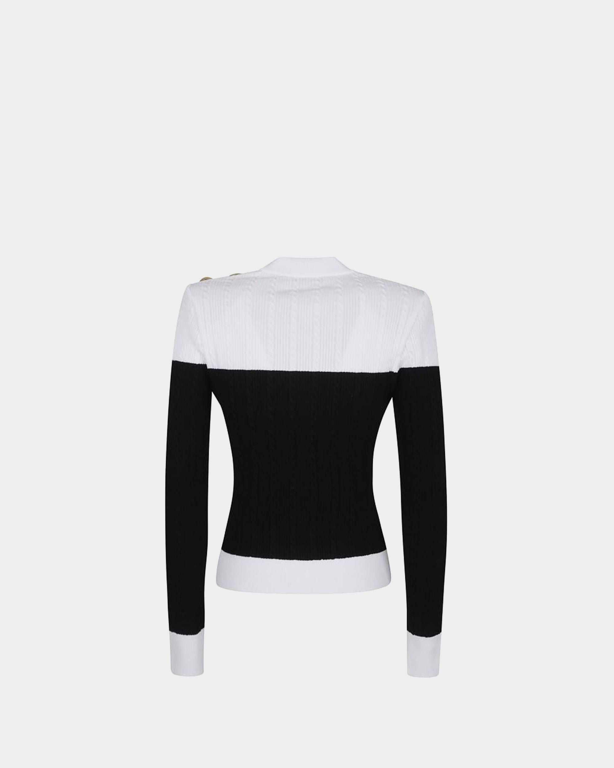 黑白拼接設計搭配標誌性金色肩扣,BALMAIN 以簡潔線條凸顯高級摩登感。