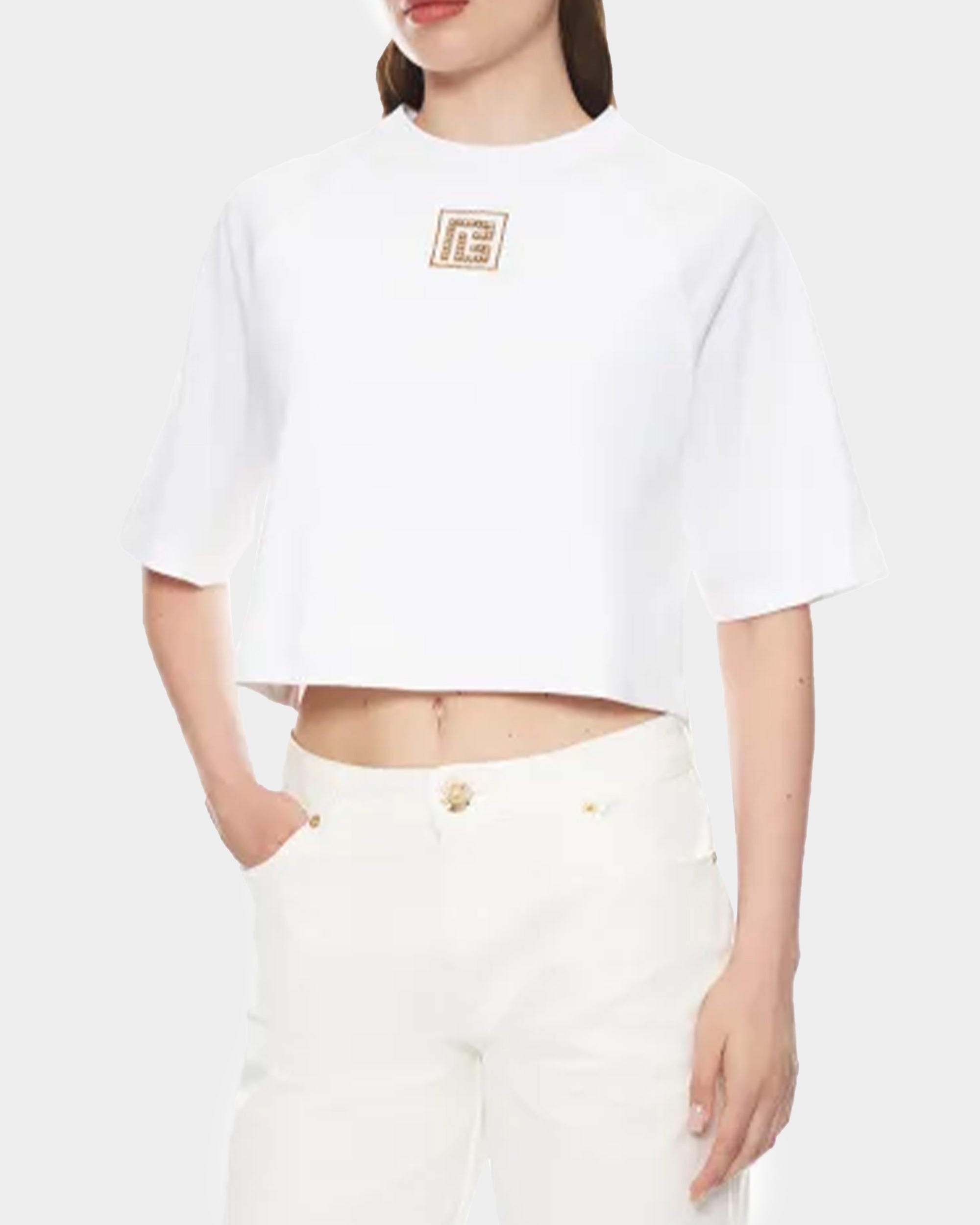簡約俐落的短版設計,胸前金色幾何徽章彰顯品牌 DNA,修身比例拉長腰線,展現巴黎女性的摩登態度。