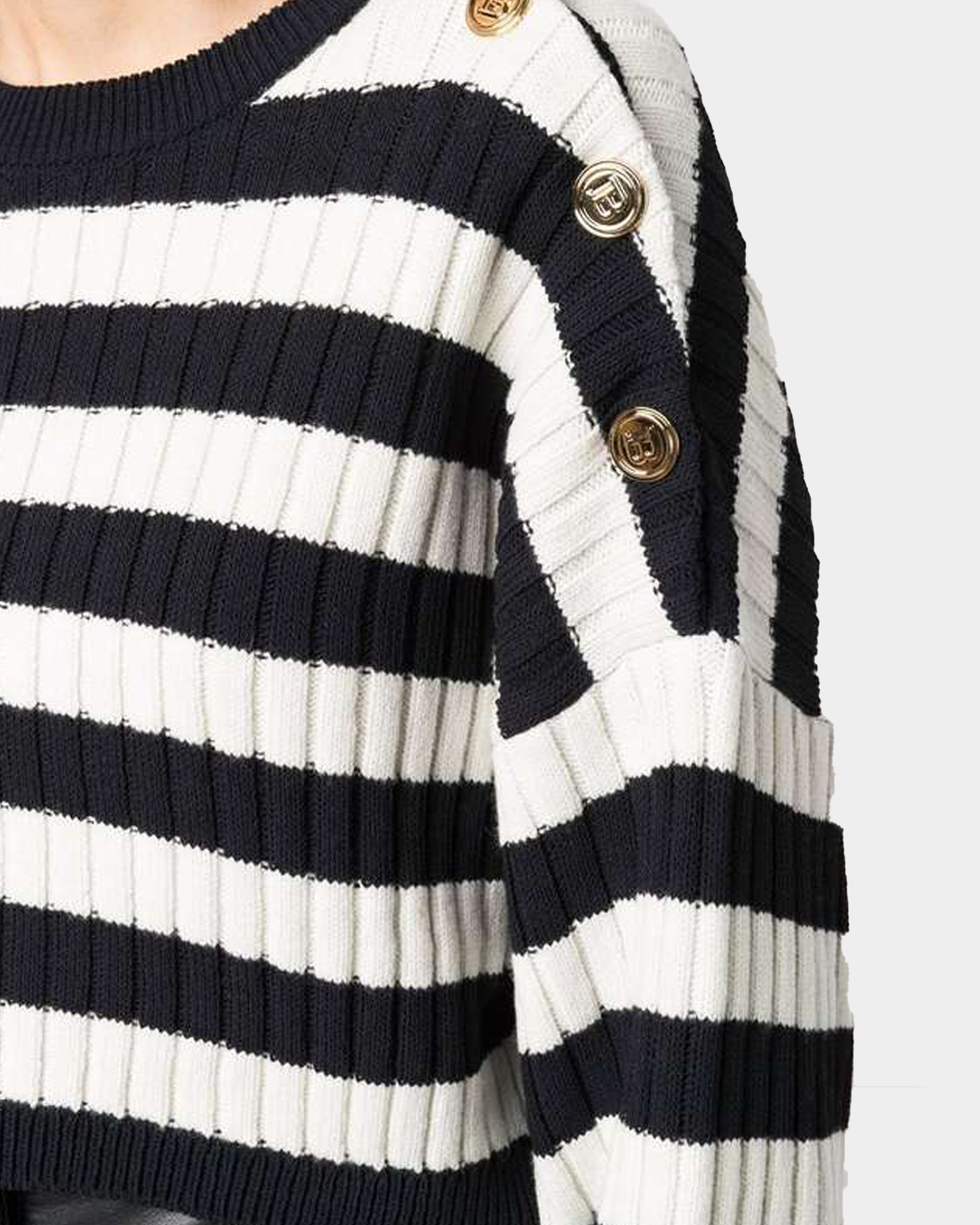 Balmain black and white wool pullover with long sleeves, ribbed crew neck and gold buttons with the Balmain logo on the right and left shoulders. These unique details reflect the brand's luxurious style.