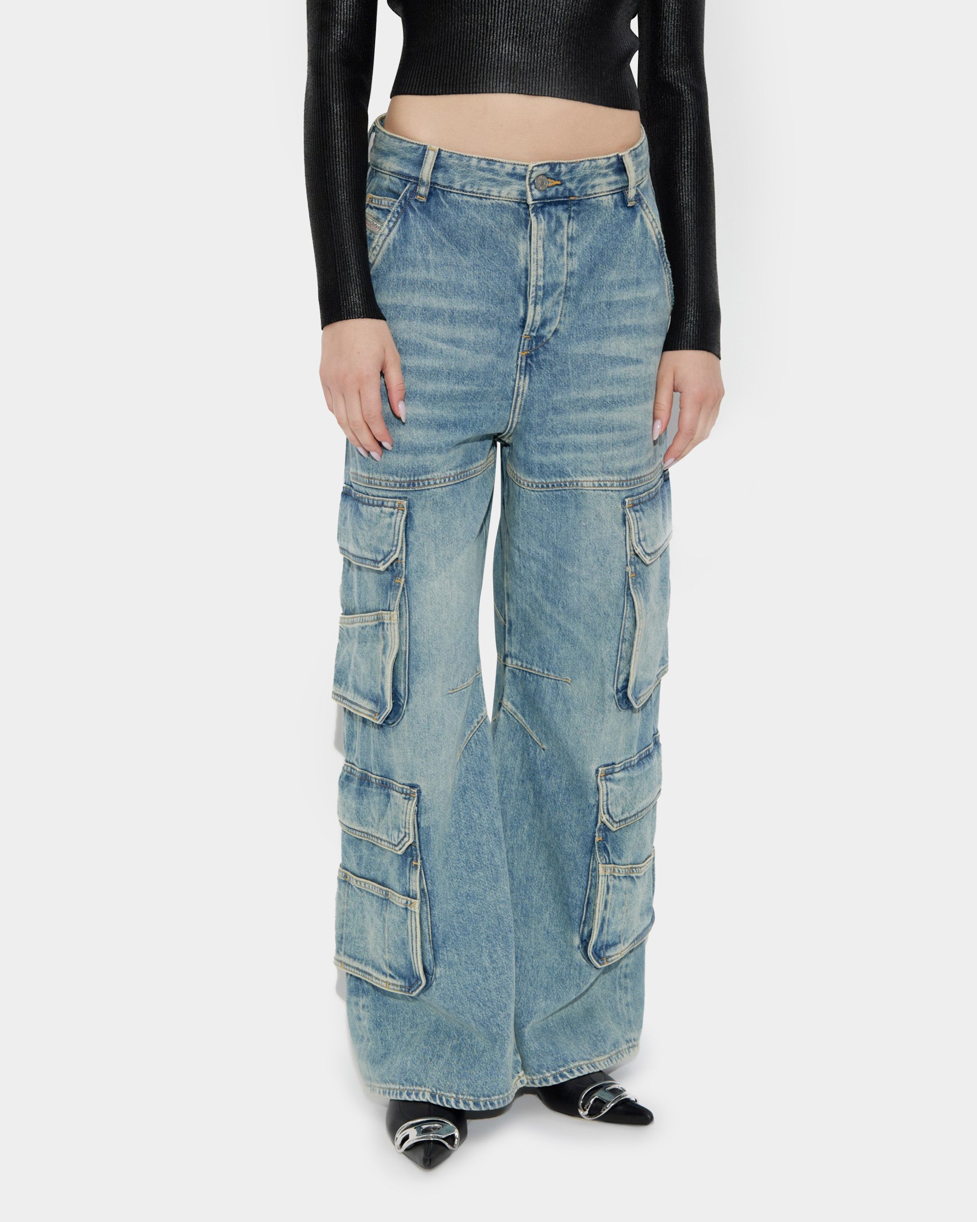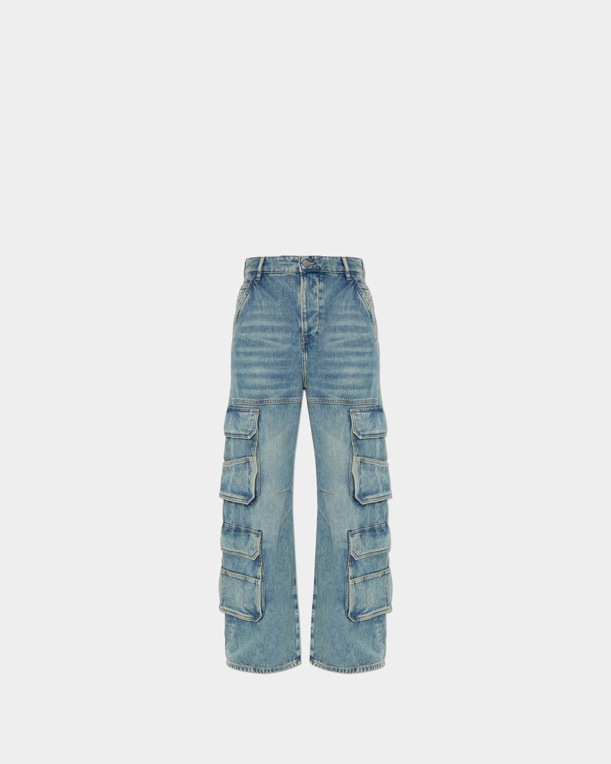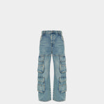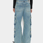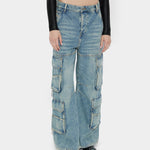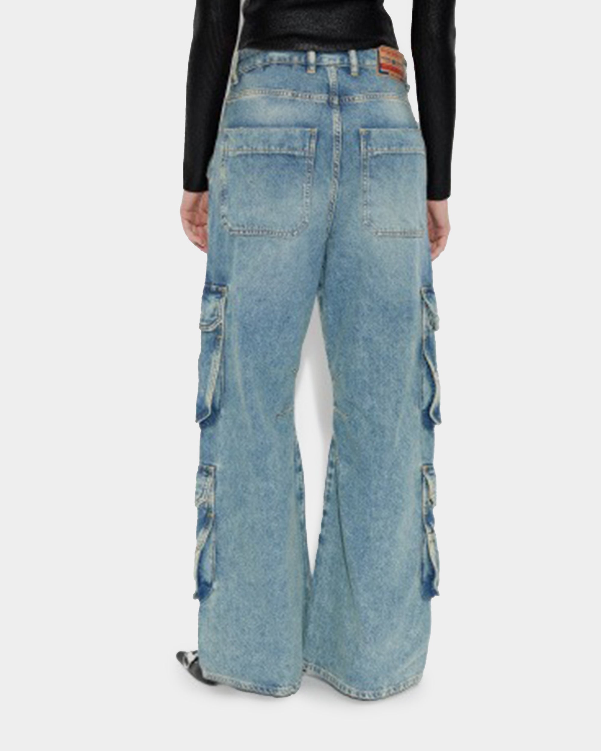 這款牛仔褲褲型採寬鬆版型,搭配多口袋設計,增添實用性與時尚感。褲腳經過剪裁處理,展現出不對稱的設計風格,增添整體造型的時尚感。