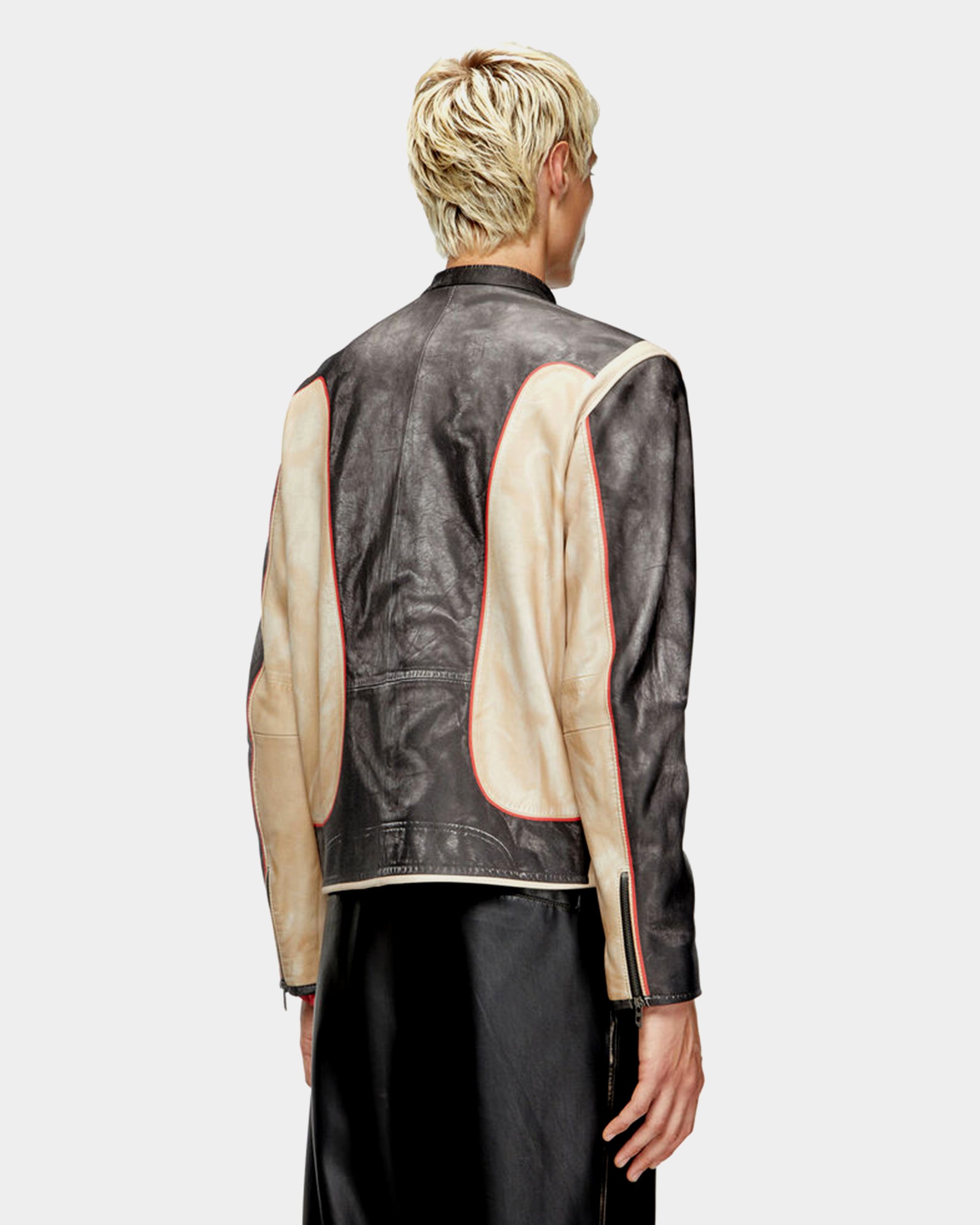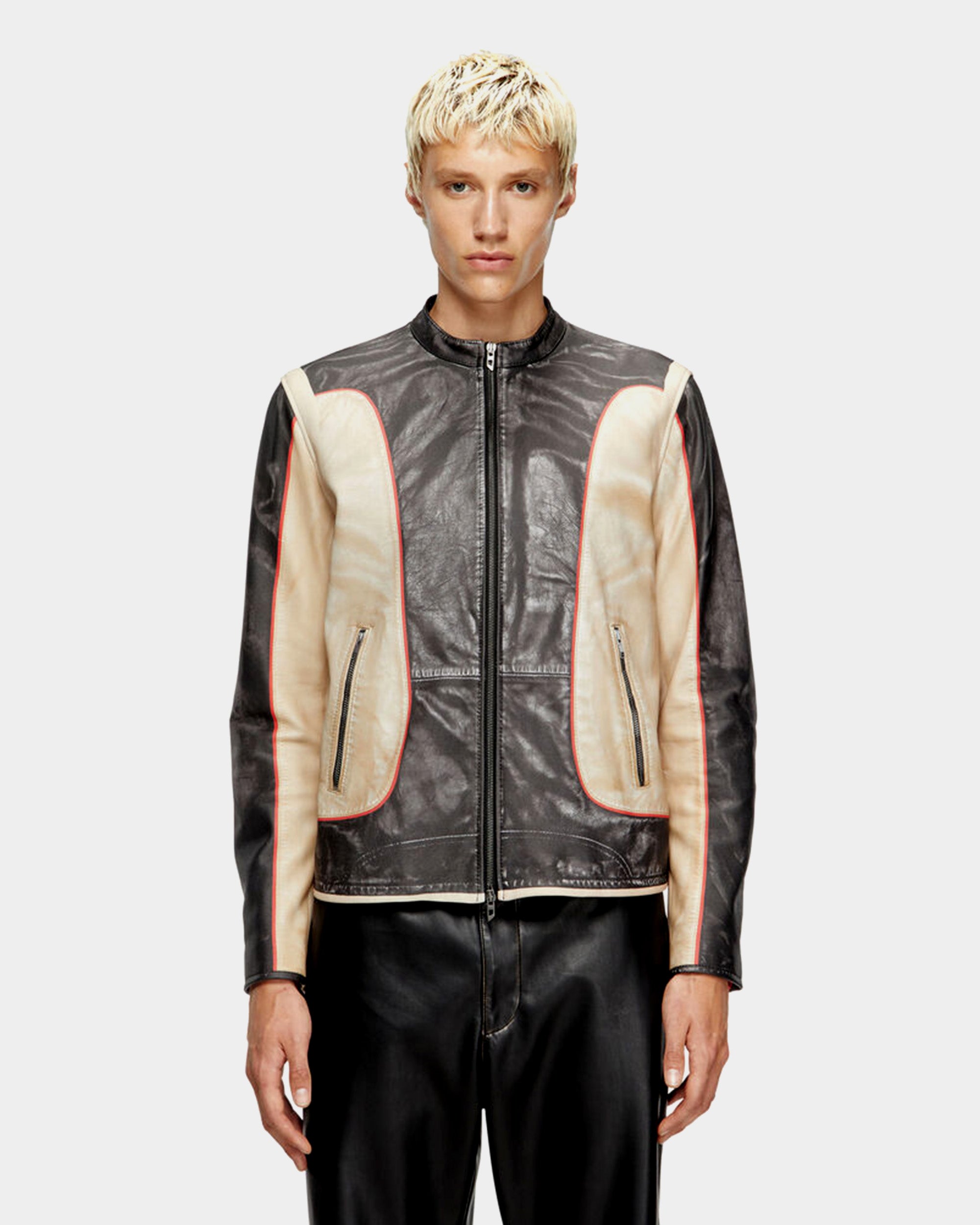 這款夾克採用 100% 羊皮製成,設計上融合了經典的機車元素,如立領設計與大面積的肘部補丁,展現出強烈的街頭風格。夾克正面配有雙向拉鍊開合,側邊拉鍊口袋提供實用性,適合日常穿搭或休閒場合。