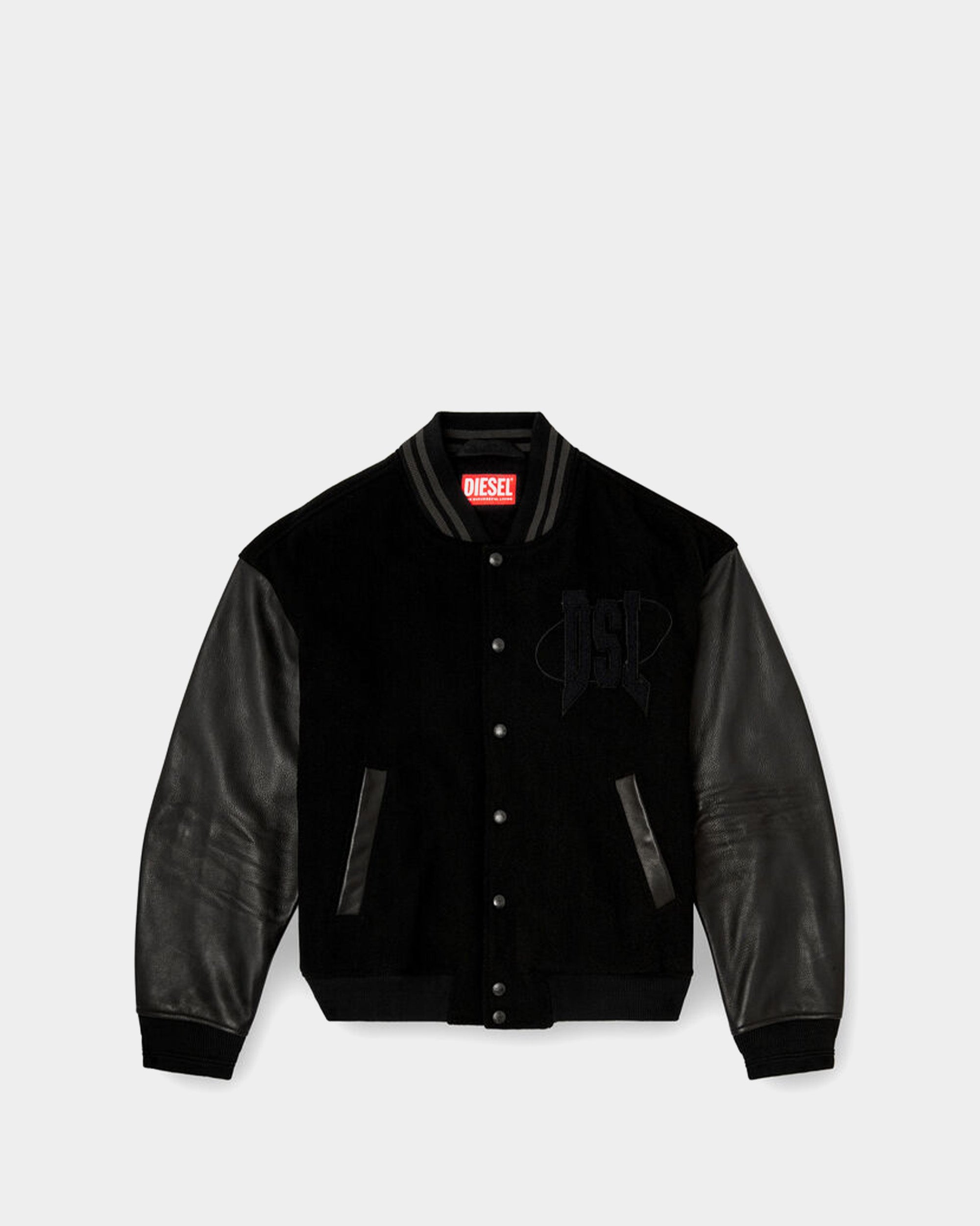 這款L-NYMAN拼接皮革男士飛行夾克,採100%牛皮材質去做袖子拼接部分與條紋羅紋收邊。胸前與背部的校隊感標誌圖案增添觸感細節與品牌特色。