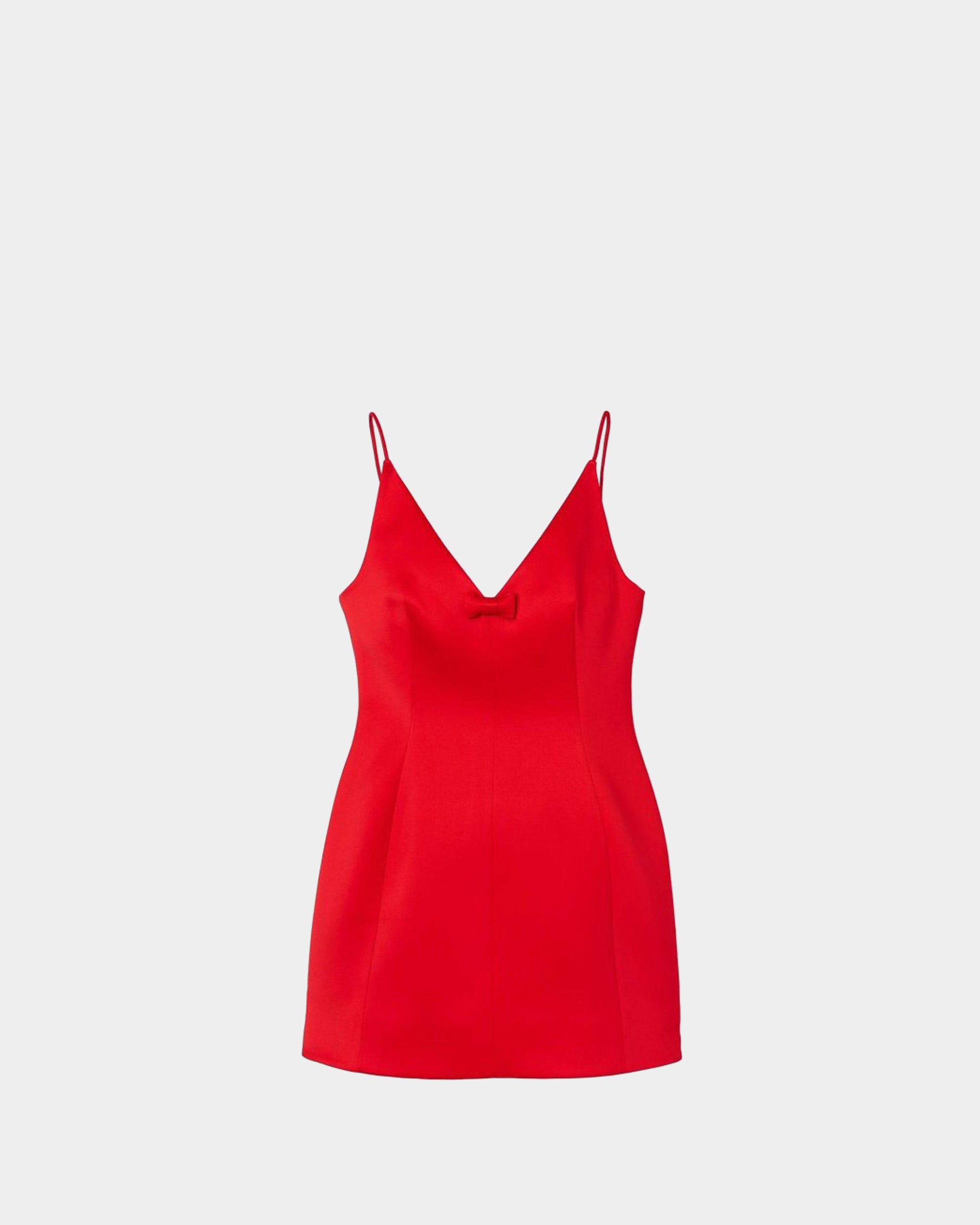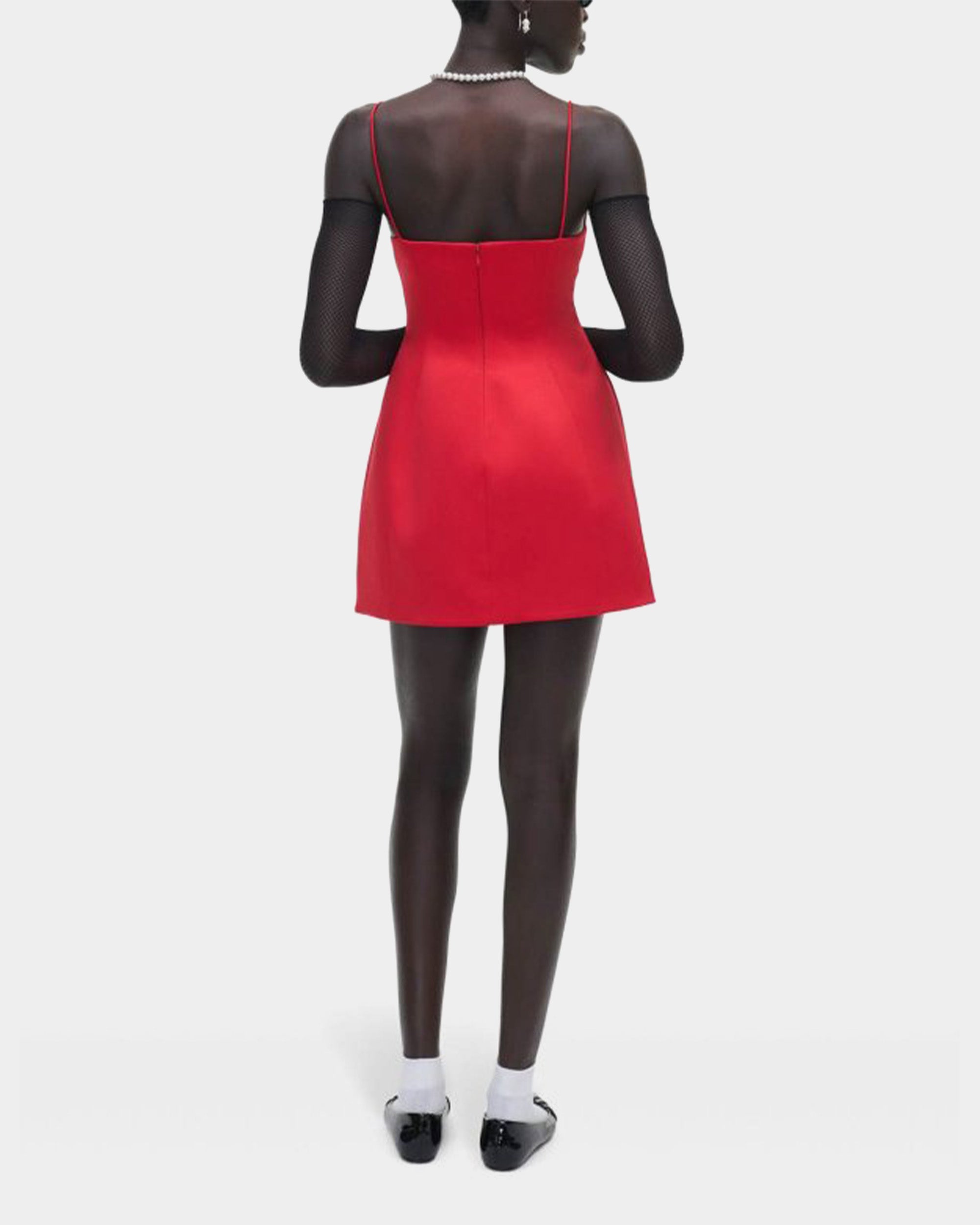 採用絲滑緞面布料設計,搭配精緻的蝴蝶結裝飾,這款洋裝將優雅與浪漫完美結合。適合正式場合與晚宴穿著。