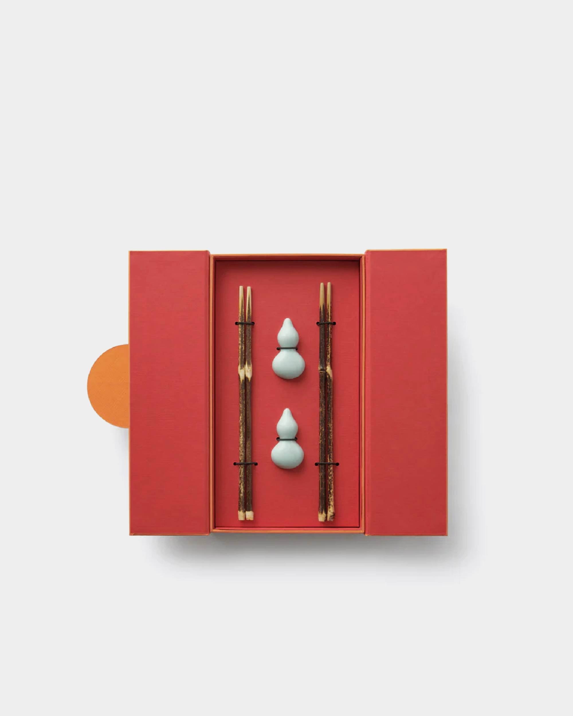 The gift box contains a chopstick holder made of gourd and natural purple bamboo chopsticks, which are made of different materials and have different meanings. The chopstick holder is shaped like a gourd, thin and strong, and has a jade-like glaze. The natural purple bamboo chopsticks are made of bamboo species used in classic Chinese courtyard landscapes, which are carefully polished and slender, comfortable to hold, and easy to lift and put, conveying a good omen of rising step by step.