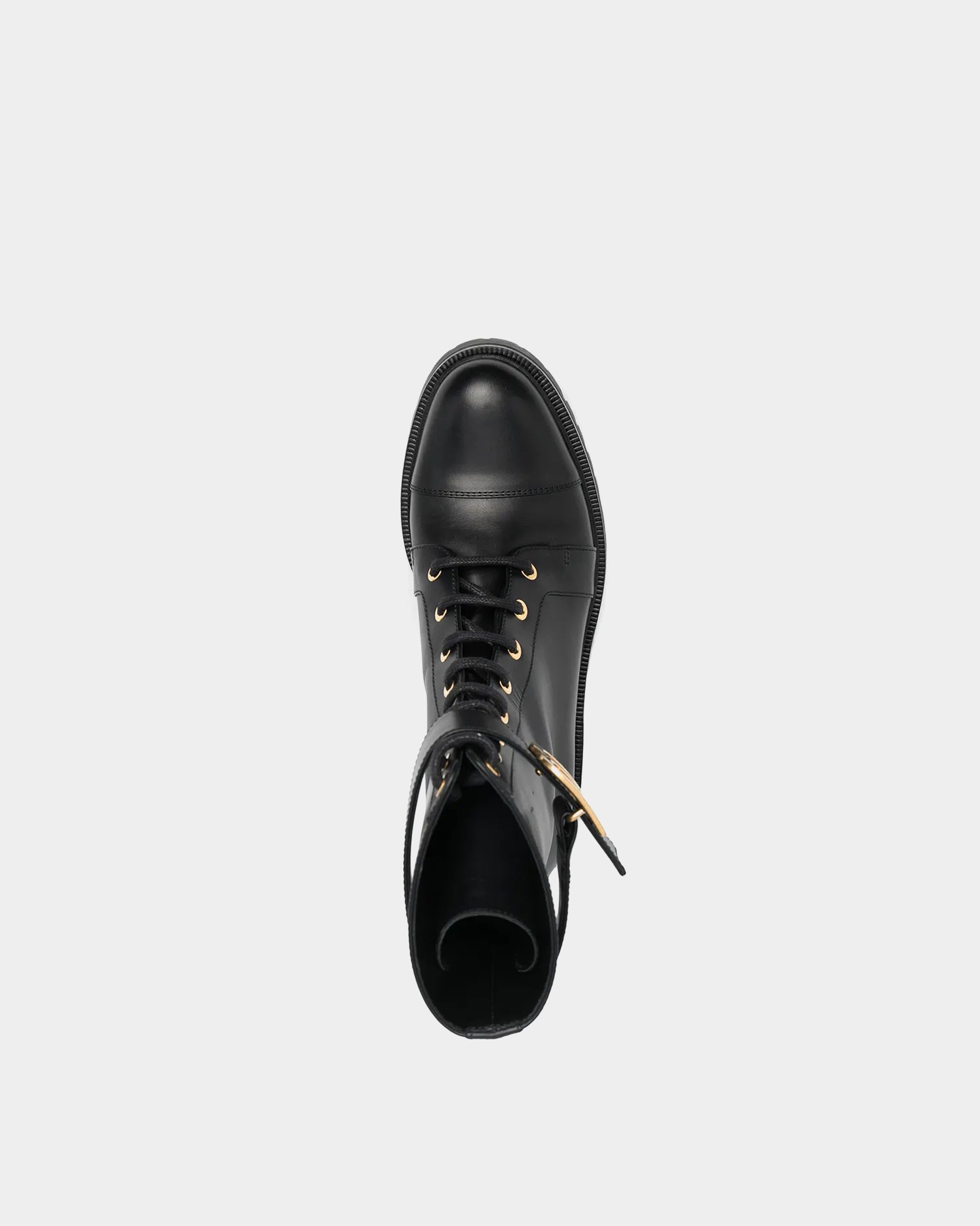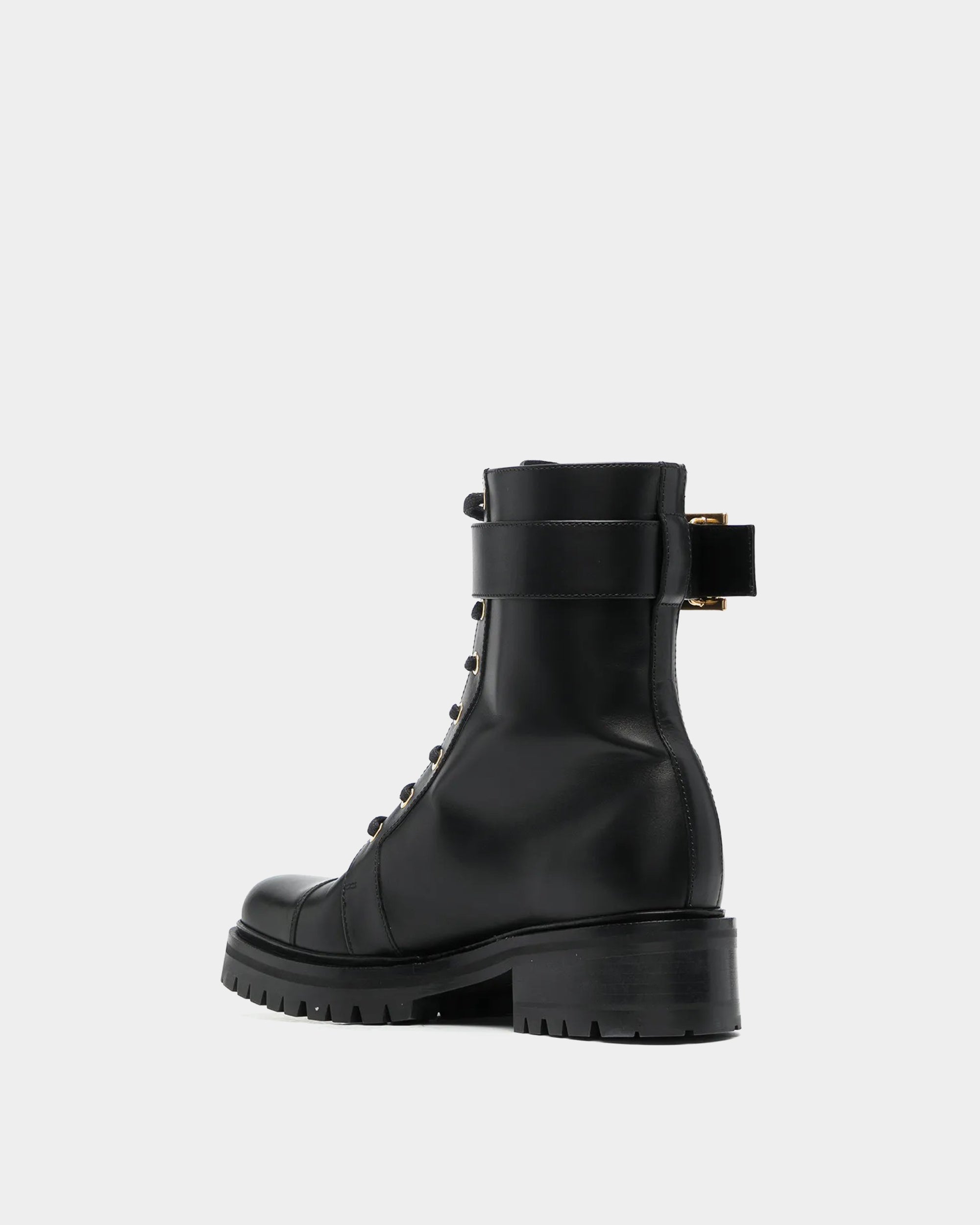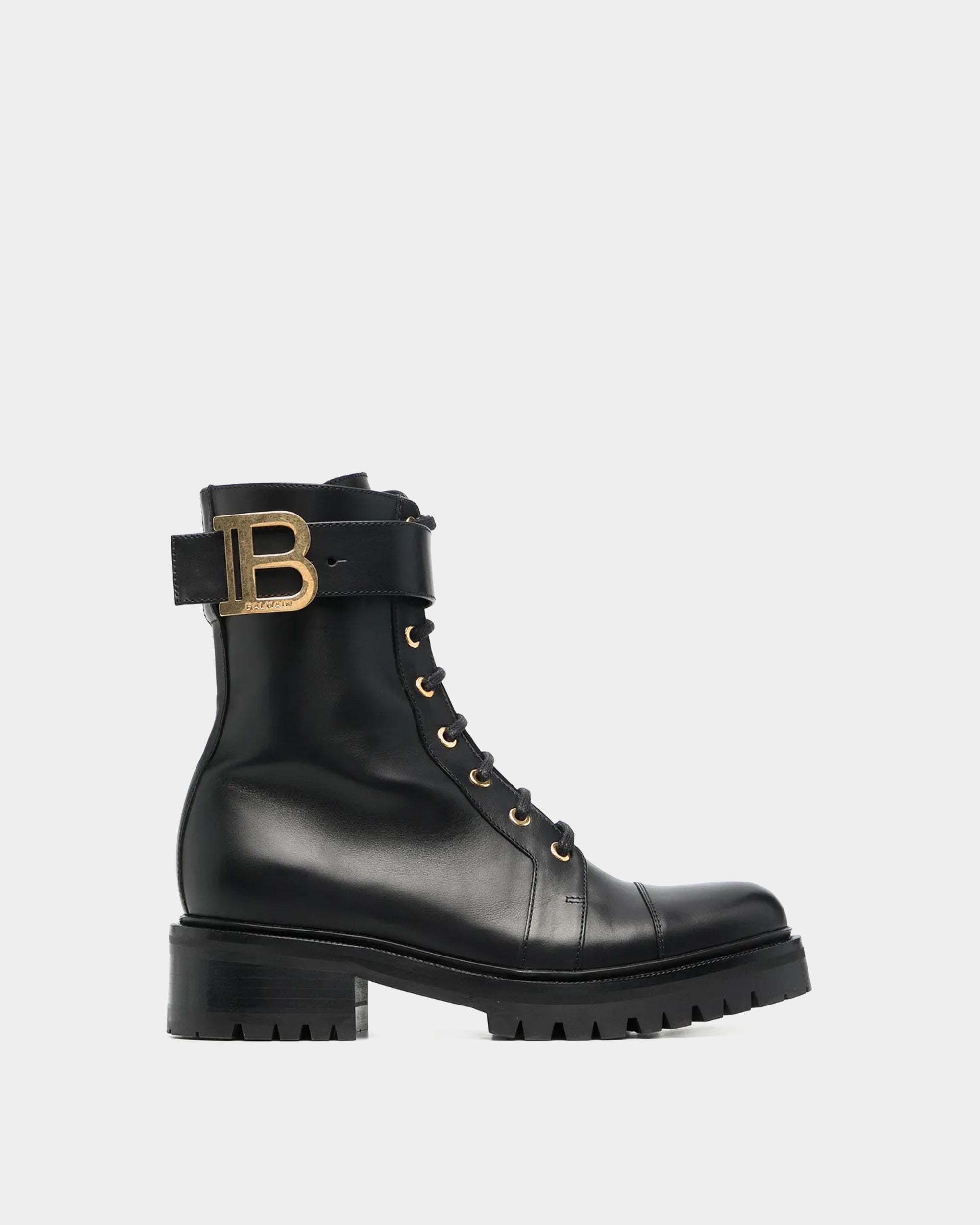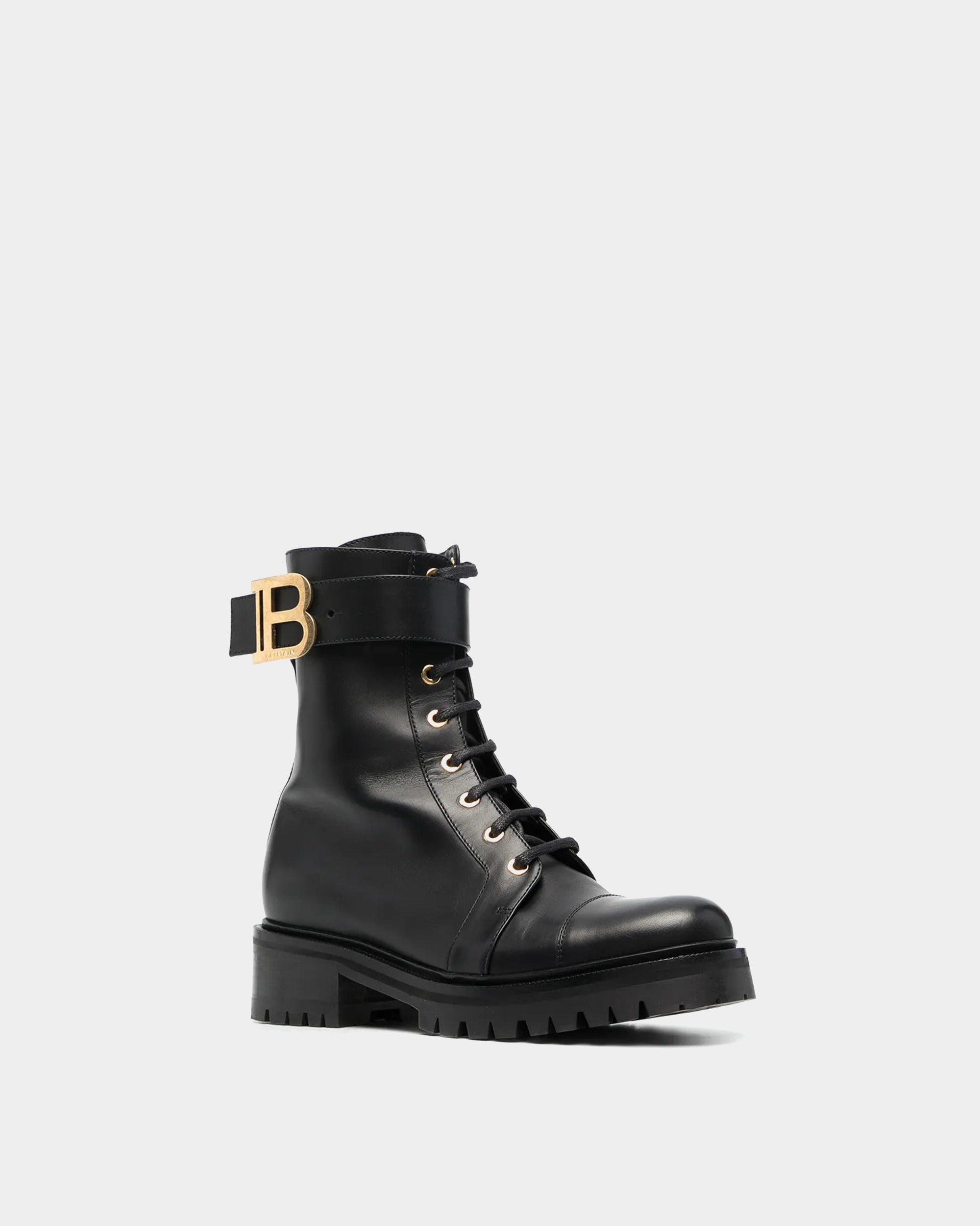 Balmain Ranger, crafted from smooth calfskin, exudes luxurious and practical style. This ankle boot features a lace-up design with gold eyelets for an added touch of sophistication. A large metal B logo buckle secures the ankle strap and features the brand's engraved logo. The boot's hard-wearing rubber outsole adds a modern touch and provides better grip, perfectly combining design and functionality.