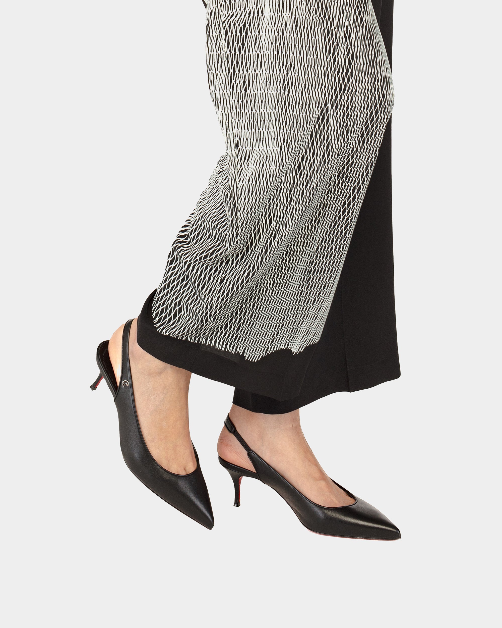 The pointed toe shoes feature a classic open-heel design and a delicate mid-height stiletto heel, providing a perfect balance between everyday wear and formal occasions. The slender shoe last and streamlined silhouette modify the foot shape, while the iconic red sole further demonstrates an elegant and fashionable style.