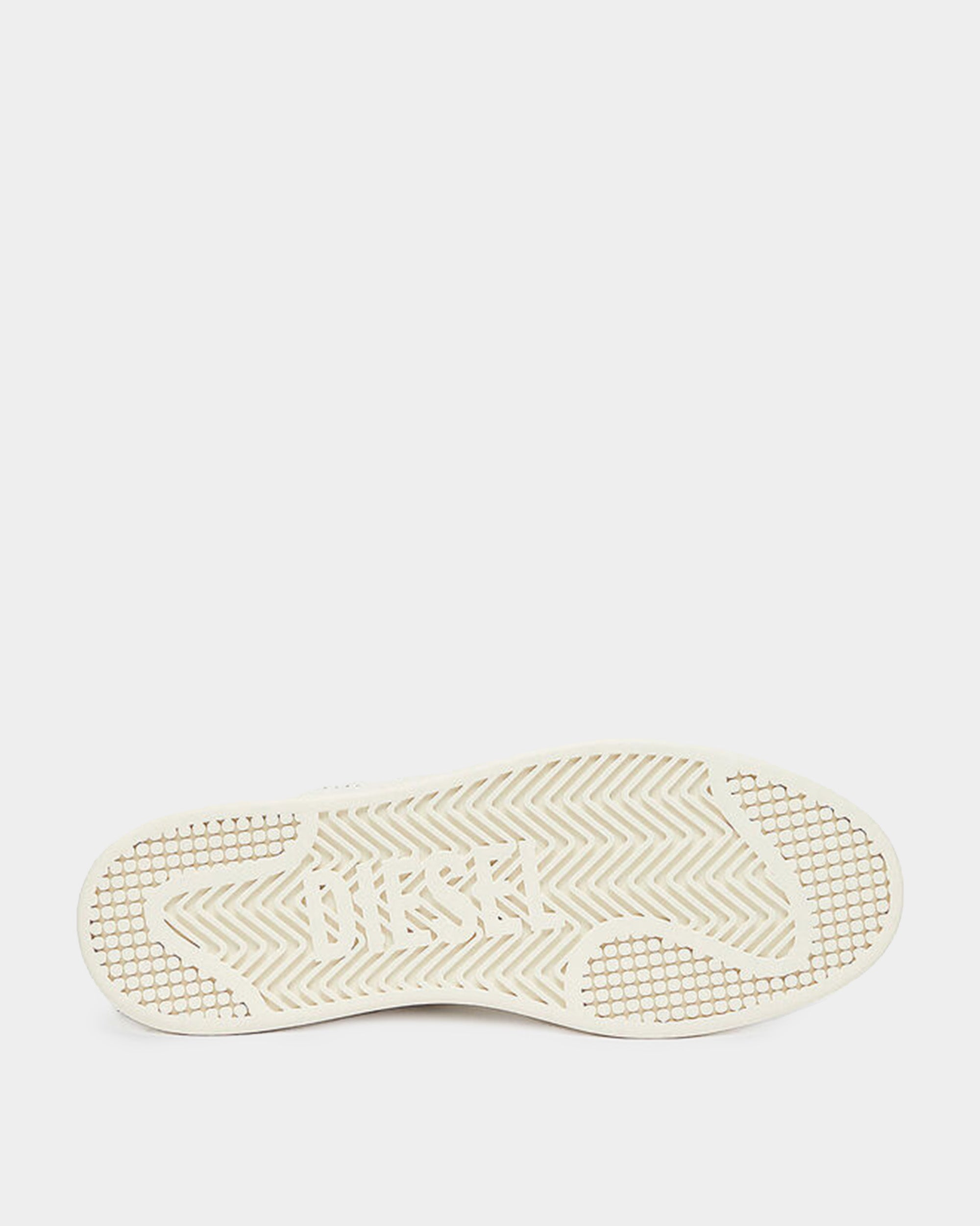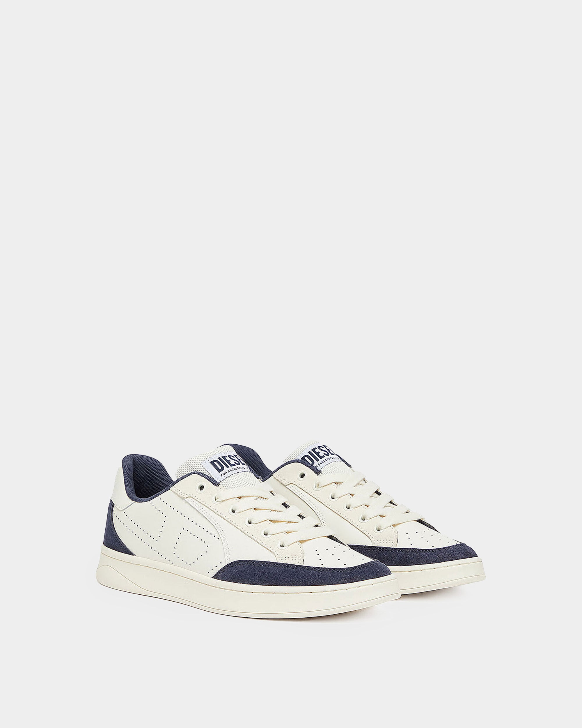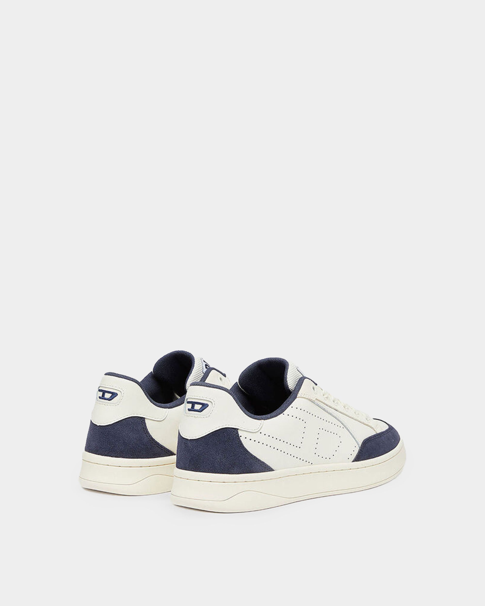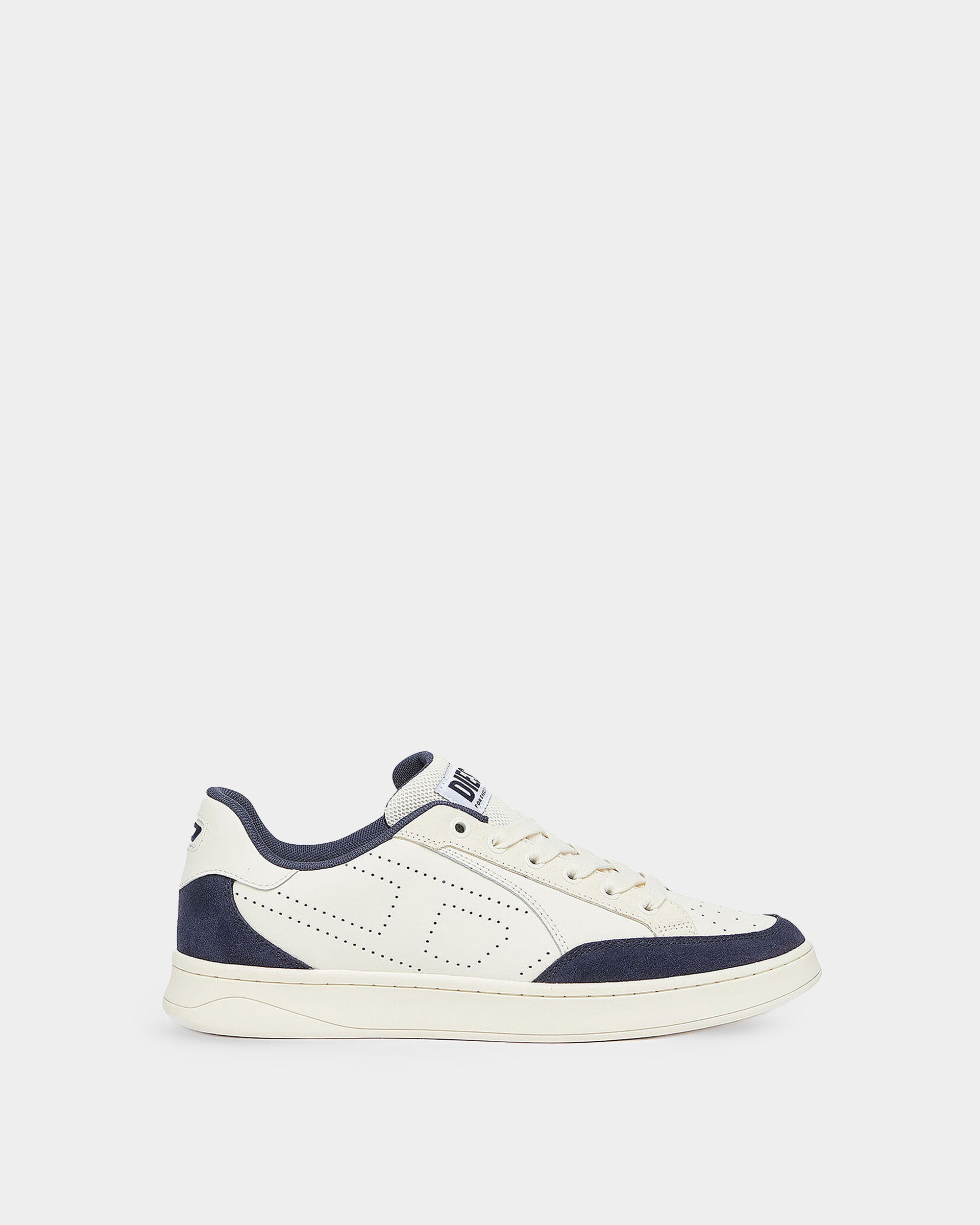 採用柔軟皮革製成,造型以白色與徽藍色拼接方式呈現,鞋面帶有透氣打孔 Diesel 標誌,帶有簡約的質感與品牌特色。鞋底採用橡膠材質,提供舒適抓地力,適合日常休閒或運動穿搭。