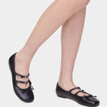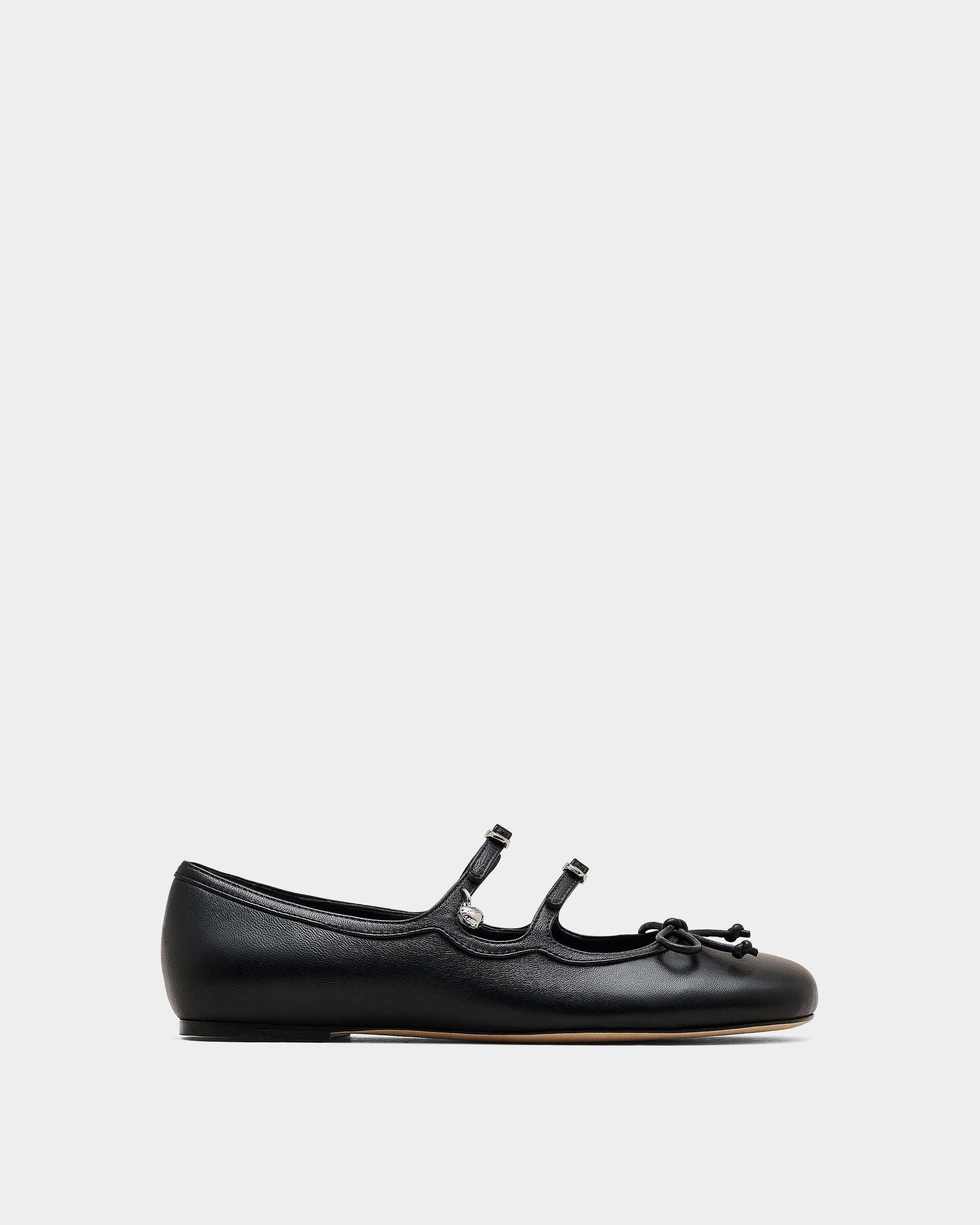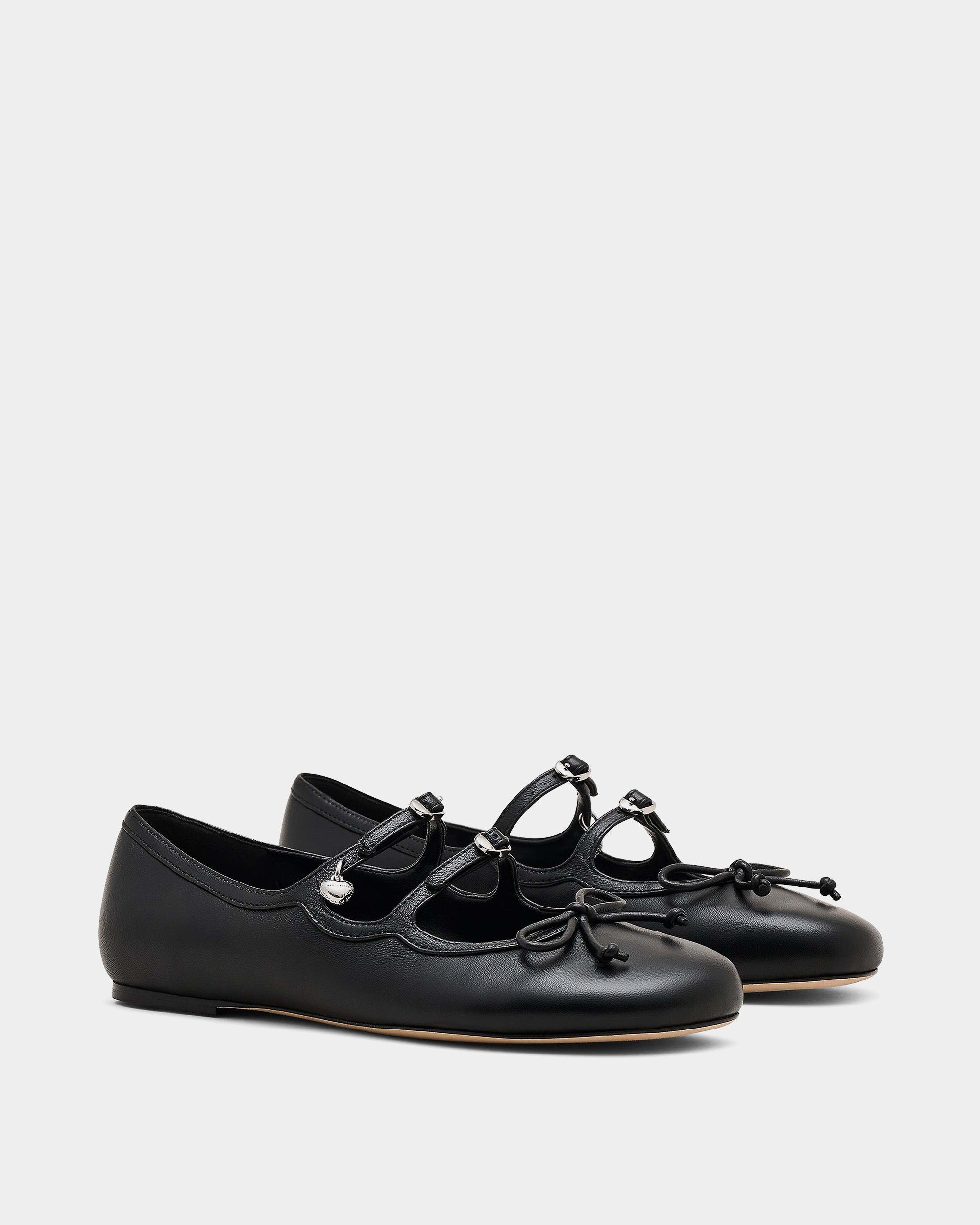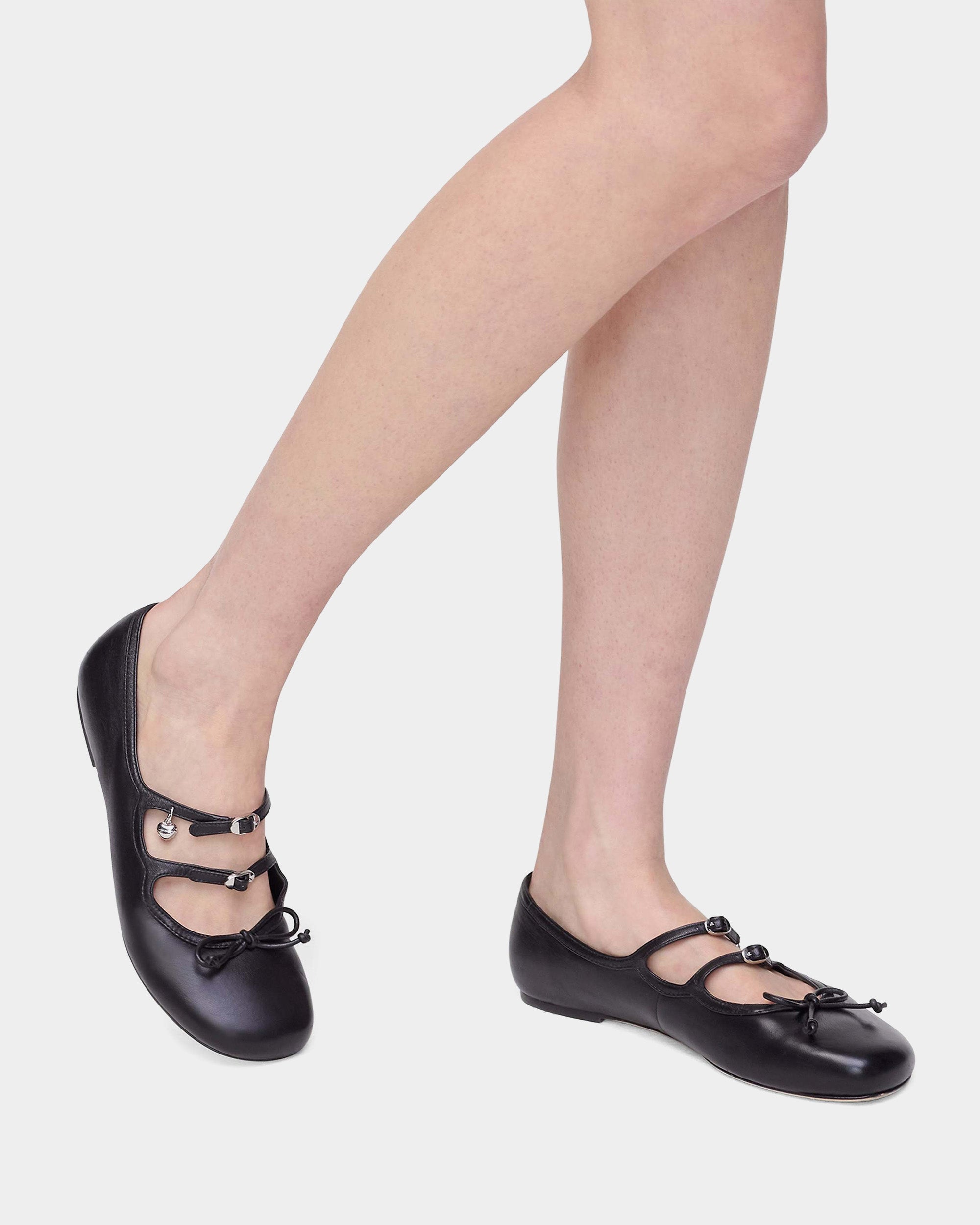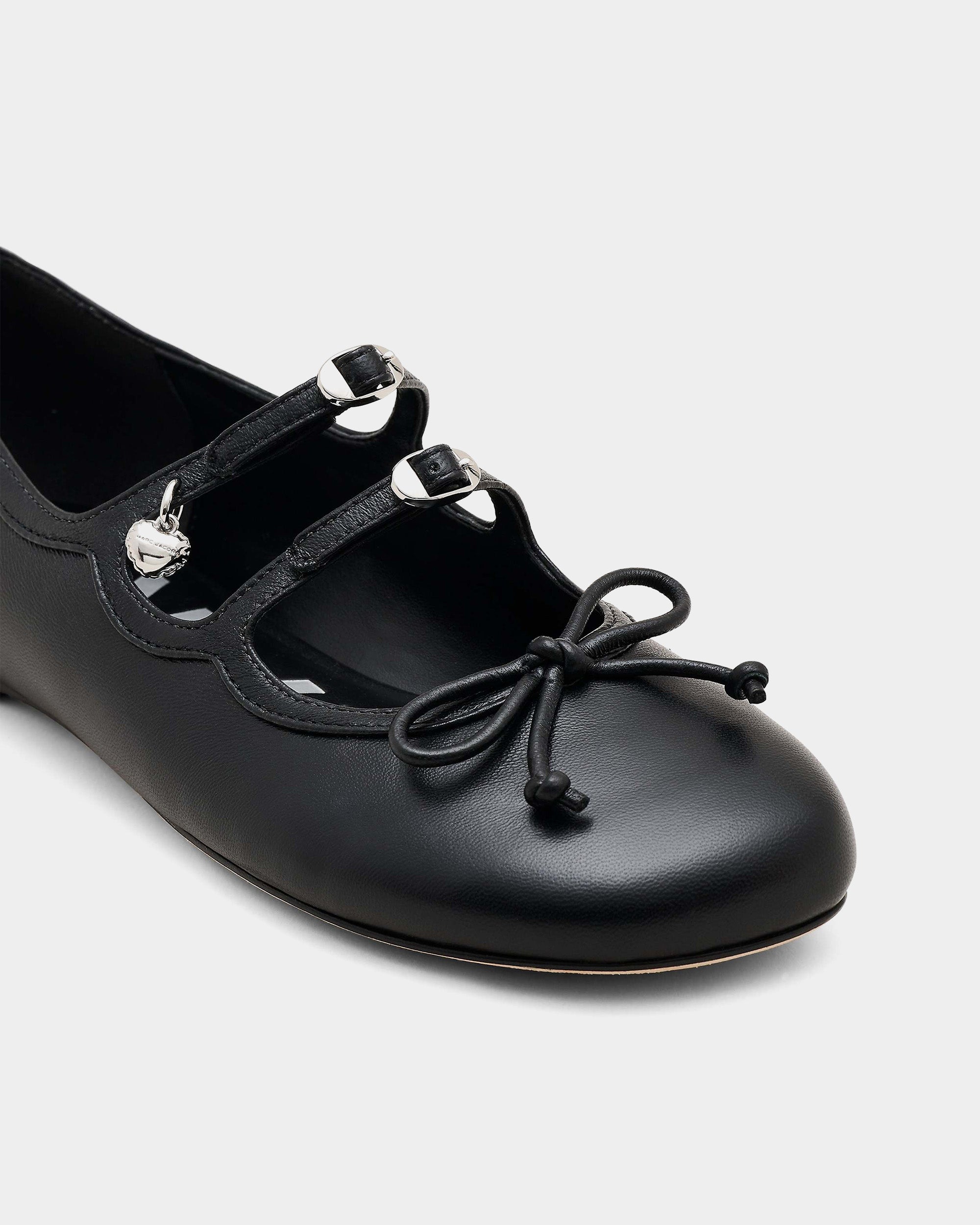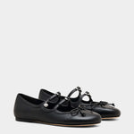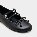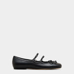 選用光滑皮革打造鞋身,設有多重扣環與品牌標誌性的 Kiki 金屬飾件,前端綴有細緻皮革蝴蝶結,演繹芭蕾鞋風格。鞋型為圓頭平底設計,兼具優雅與日常穿搭實用性。
