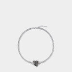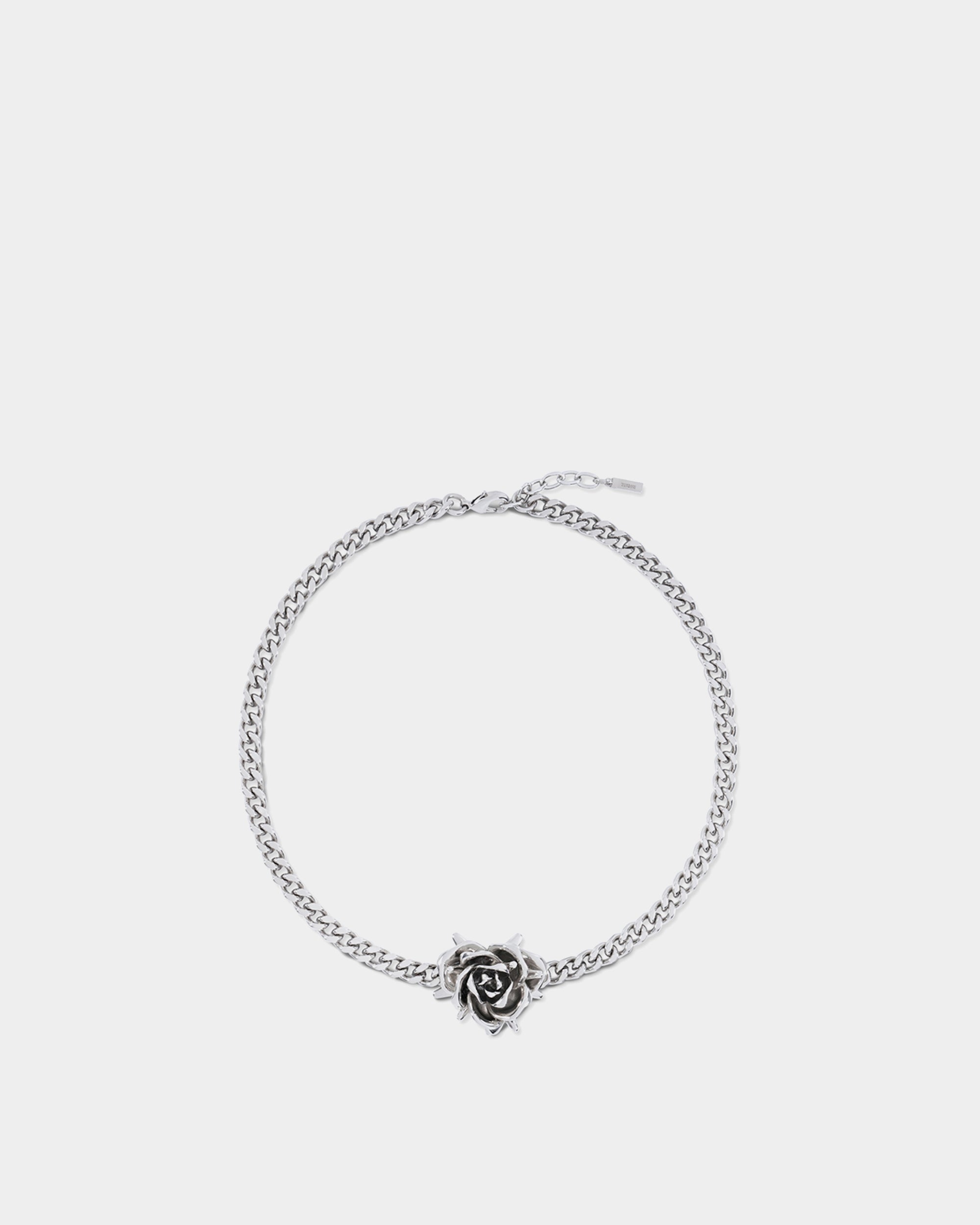 以銀色金屬展現冷調質感,搭配立體玫瑰吊墜,帶出 WE11DONE 標誌性的中性與浪漫反差。簡單一戴就能提升整體造型,為日常加入一點酷又不失精緻的態度。