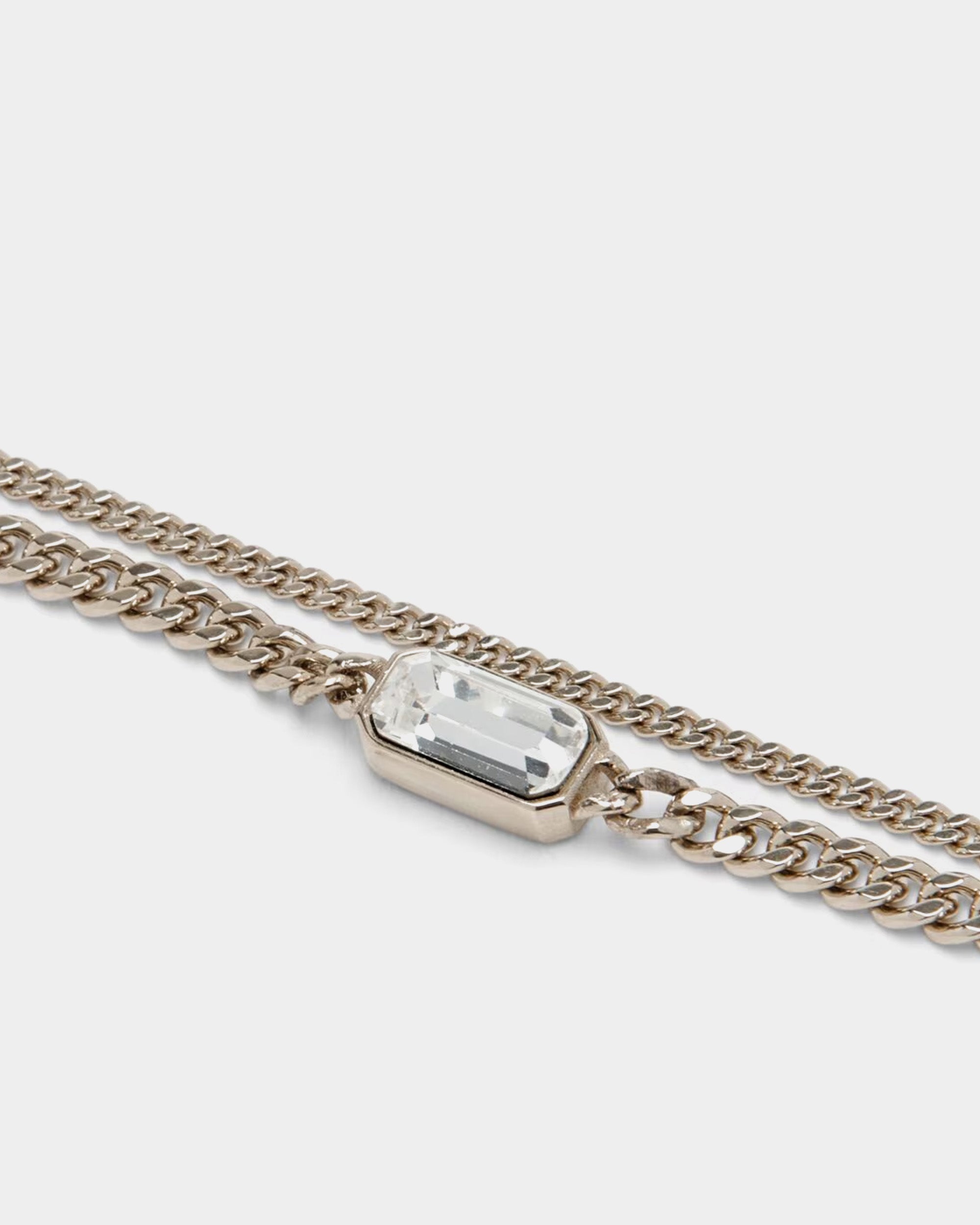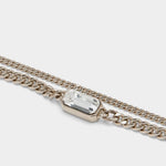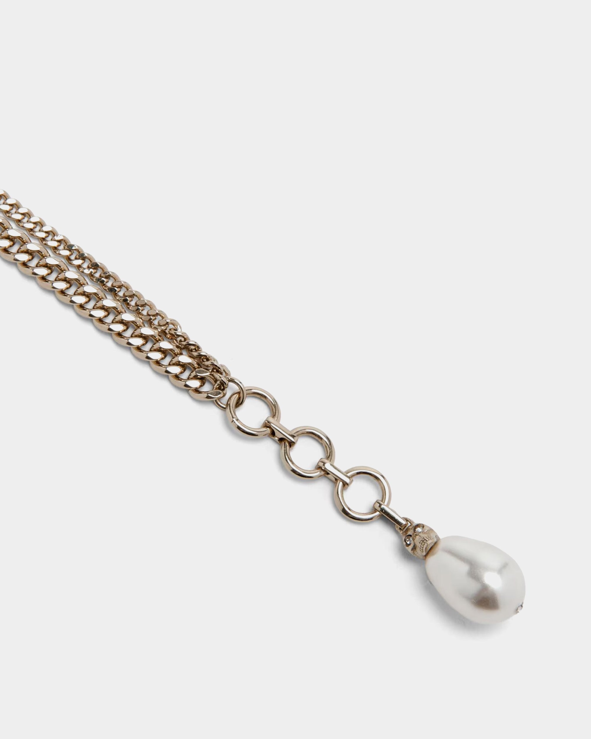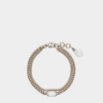 金色飾面黃銅,並手工串接雙層金屬鍊條、長方形切割透明水晶與水滴形仿珍珠,在不同材質質感中構築出充滿張力的視覺層次。經典手鍊設計配有 ALEXANDER MCQUEEN 標誌性的優雅輪廓,此款特別結合了華麗的水晶閃耀與溫潤珍珠。