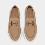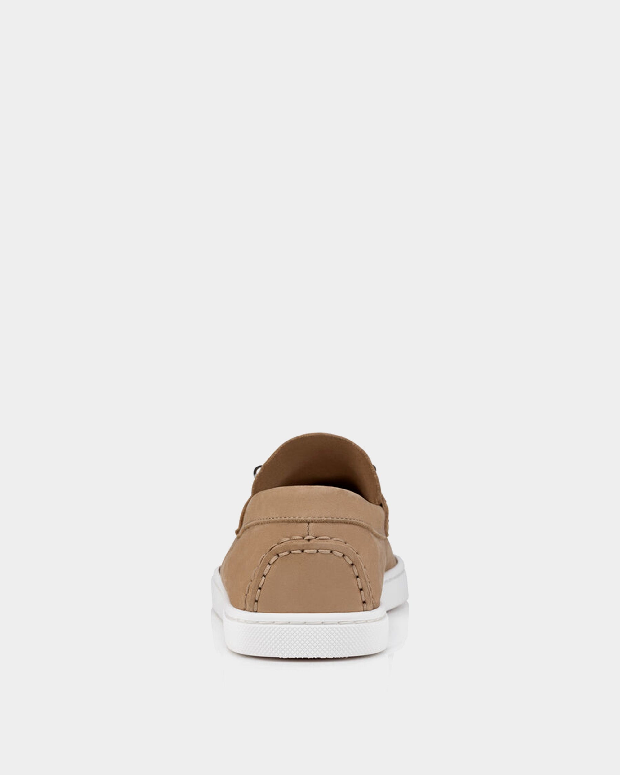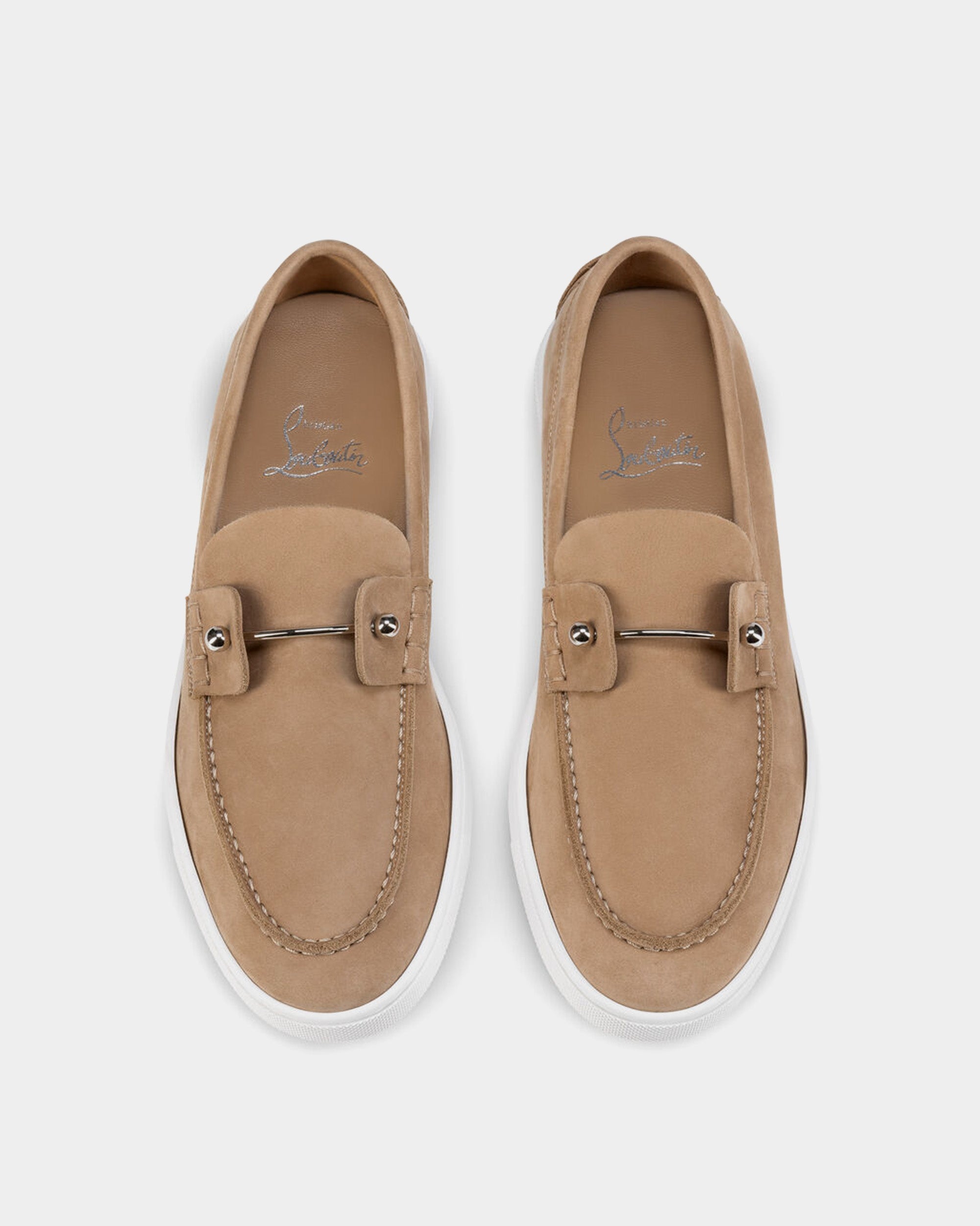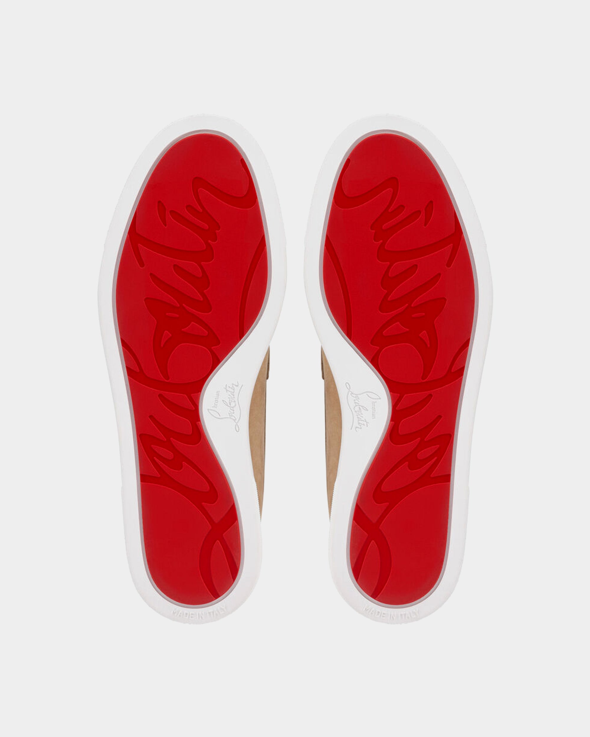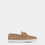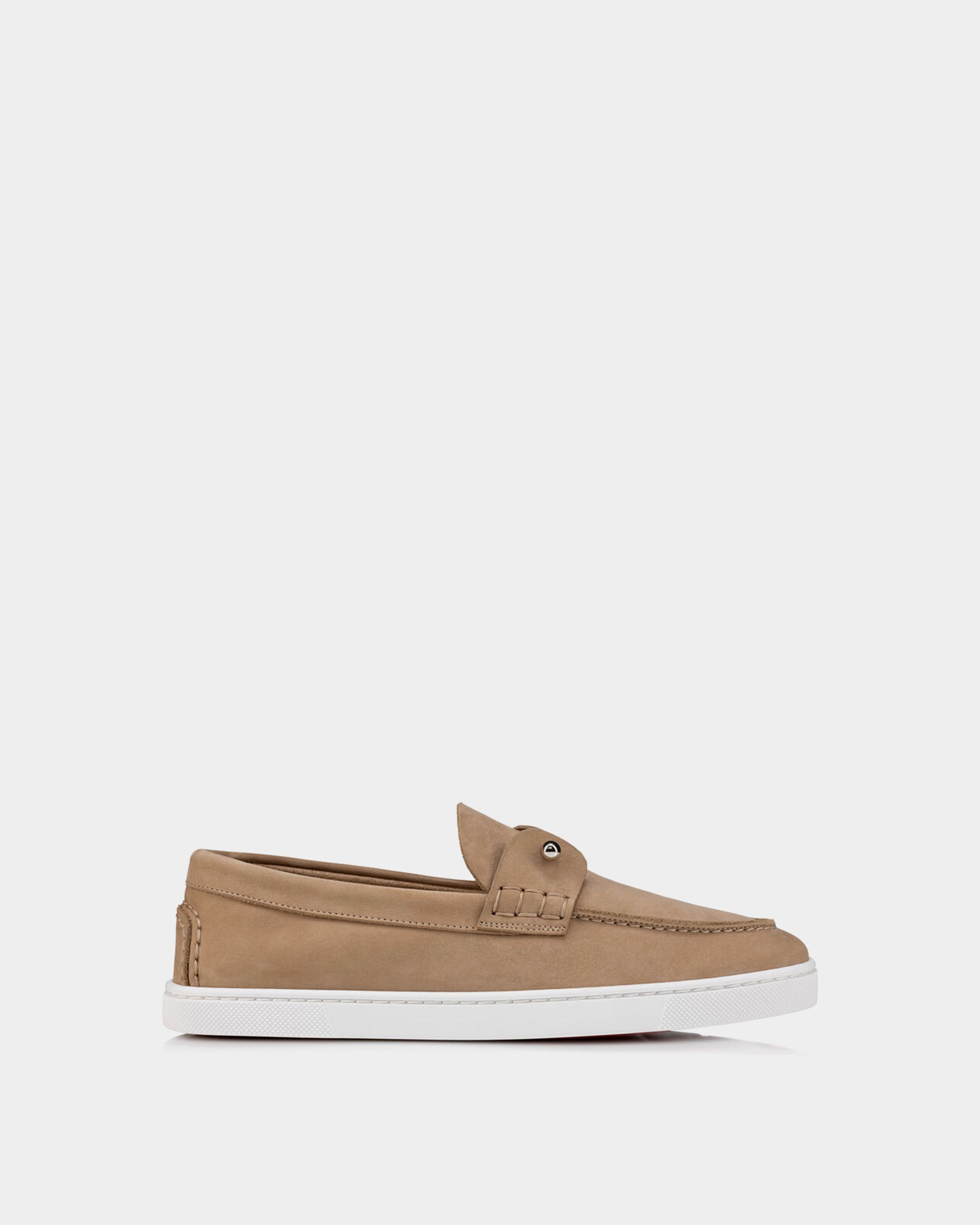 以柔軟麂皮打造,質地輕盈親膚,結合經典船鞋輪廓與休閒橡膠鞋底,展現自在舒適的日常氛圍;米色調百搭耐看,搭配標誌性紅底細節,讓這雙鞋成為日常通勤、休閒出遊甚至度假造型的理想選擇,完美平衡簡約實穿與奢華格調。
