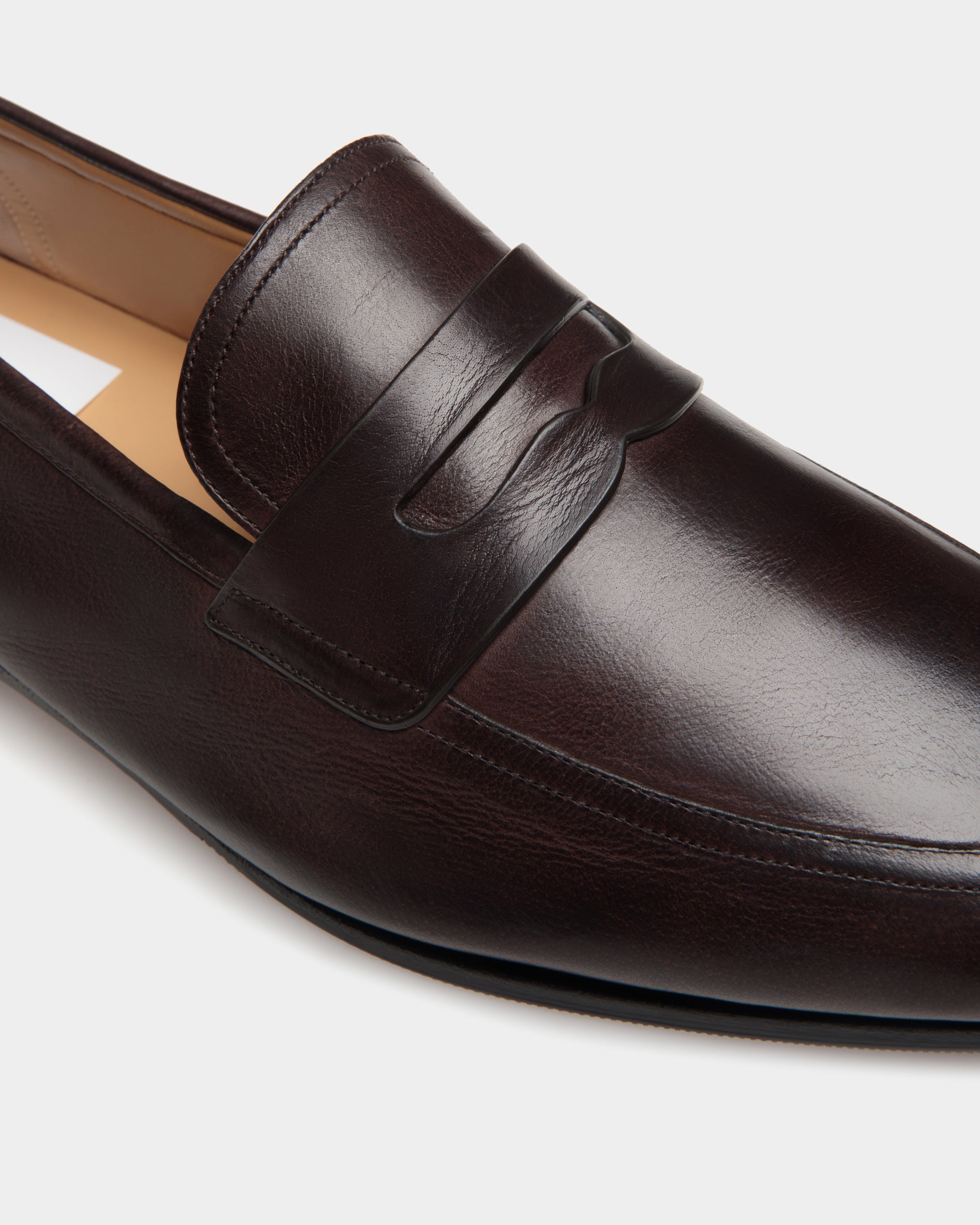 Essential Plume loafers in soft, vegetable-tanned buffalo leather in a rich Ebano brown. The flat leather sole is detailed with rubber inserts for added comfort and flexibility.
