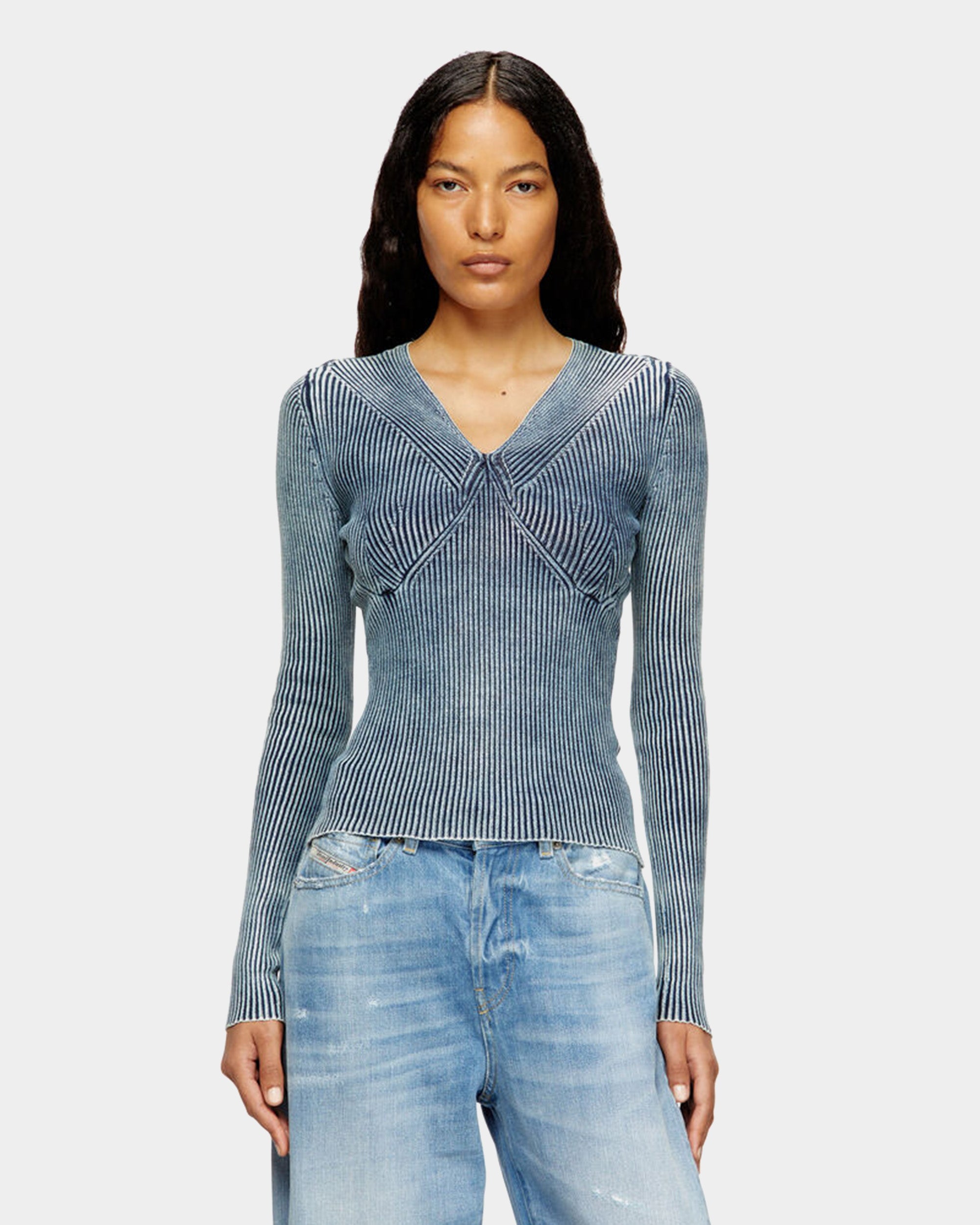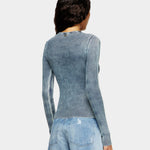 此款針織上衣採用 100% 棉質牛仔紗編織,經石洗處理呈現大理石紋理,並覆以透明金屬箔層,增添光澤感。V 領設計與修身剪裁強調頸部線條與身形,背部飾有金屬「Oval D」標誌,彰顯品牌特色。
