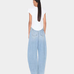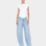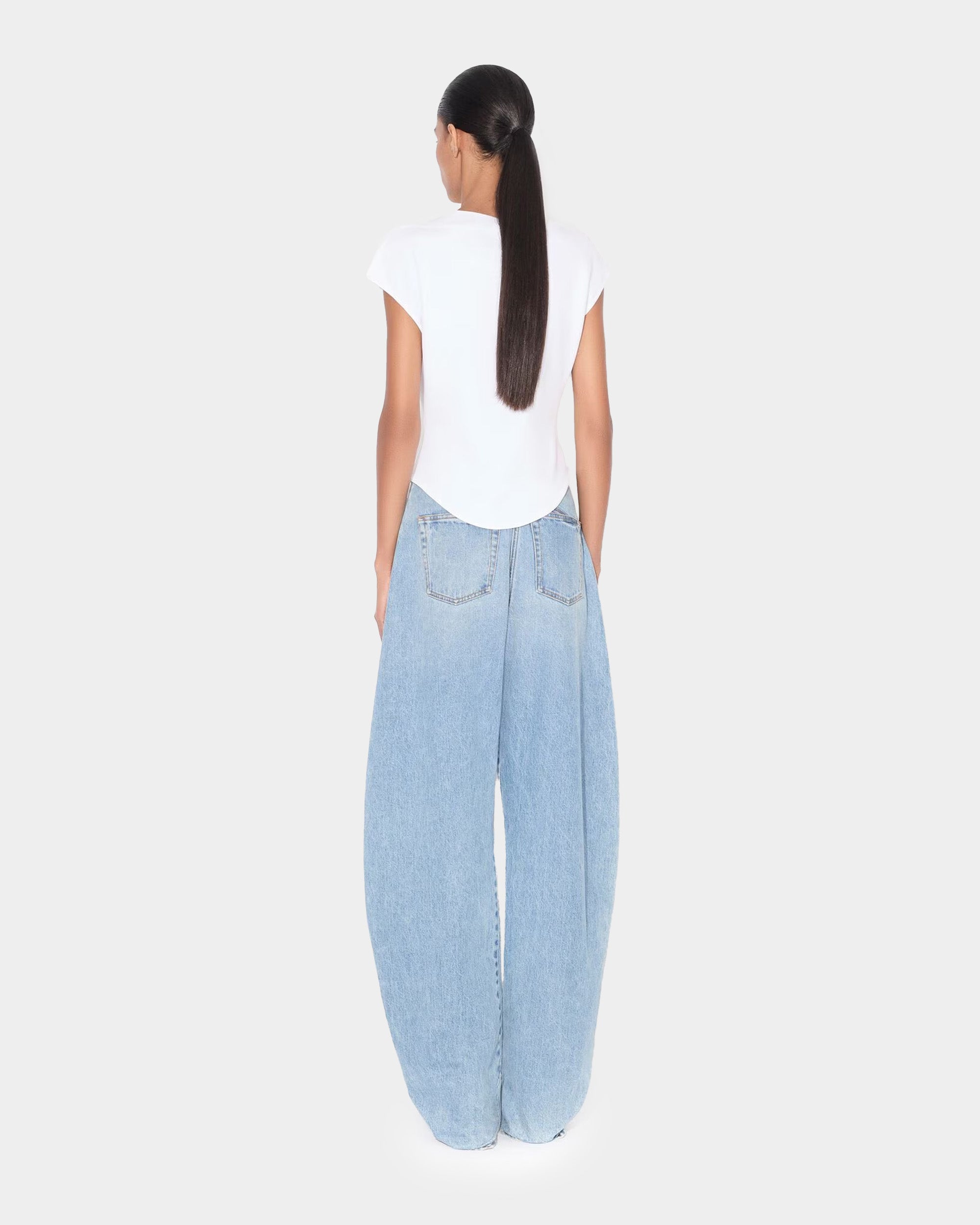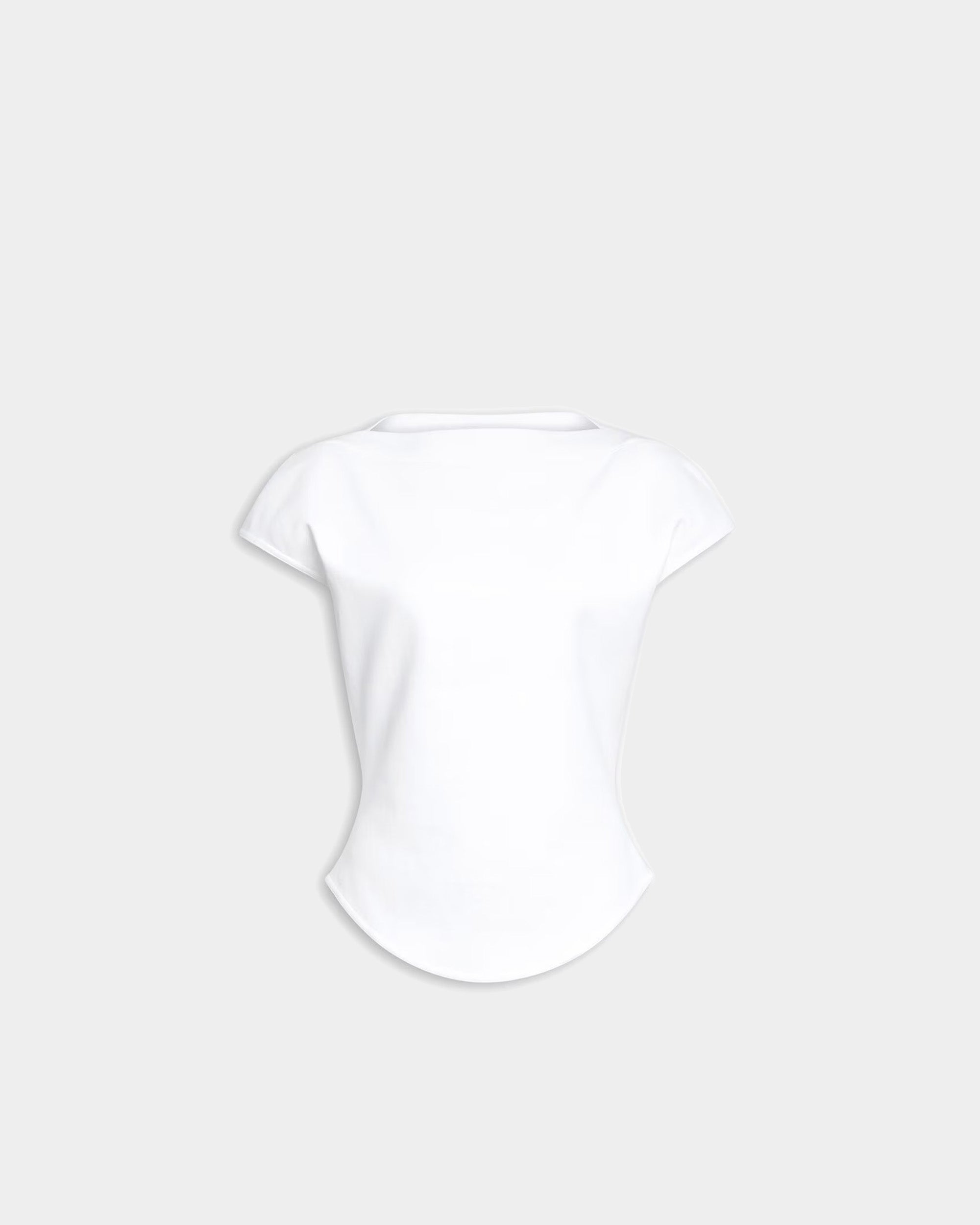 頂級親膚棉質面料,將經典的 T-shirt 重新解構。獨特的連袖短袖剪裁勾勒出優雅的肩線輪廓,搭配精緻的船型領口,展現簡潔洗鍊的氣質。最引人注目的是其圓弧狀下擺設計,不僅能巧妙修飾腰臀比例,更為簡約的單品注入了品牌標誌性的結構美學,是打造高級鬆弛感穿搭的必備基礎款。