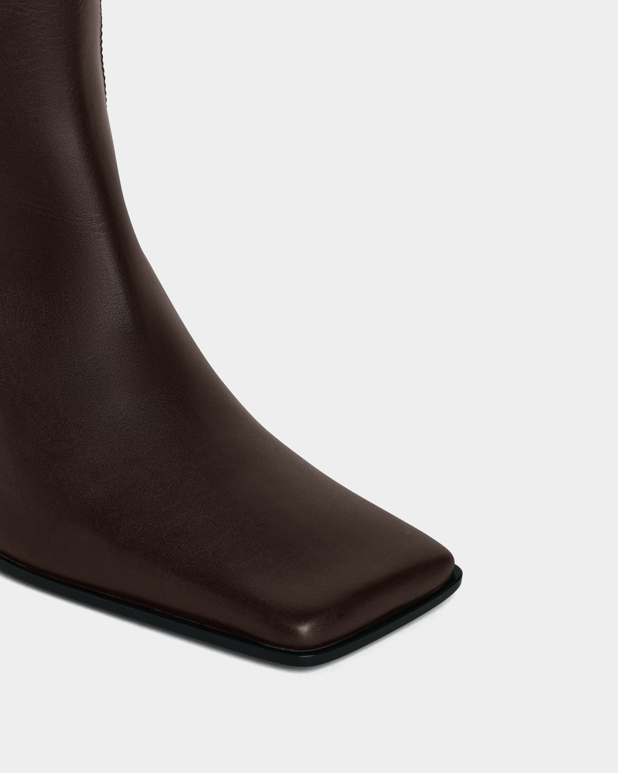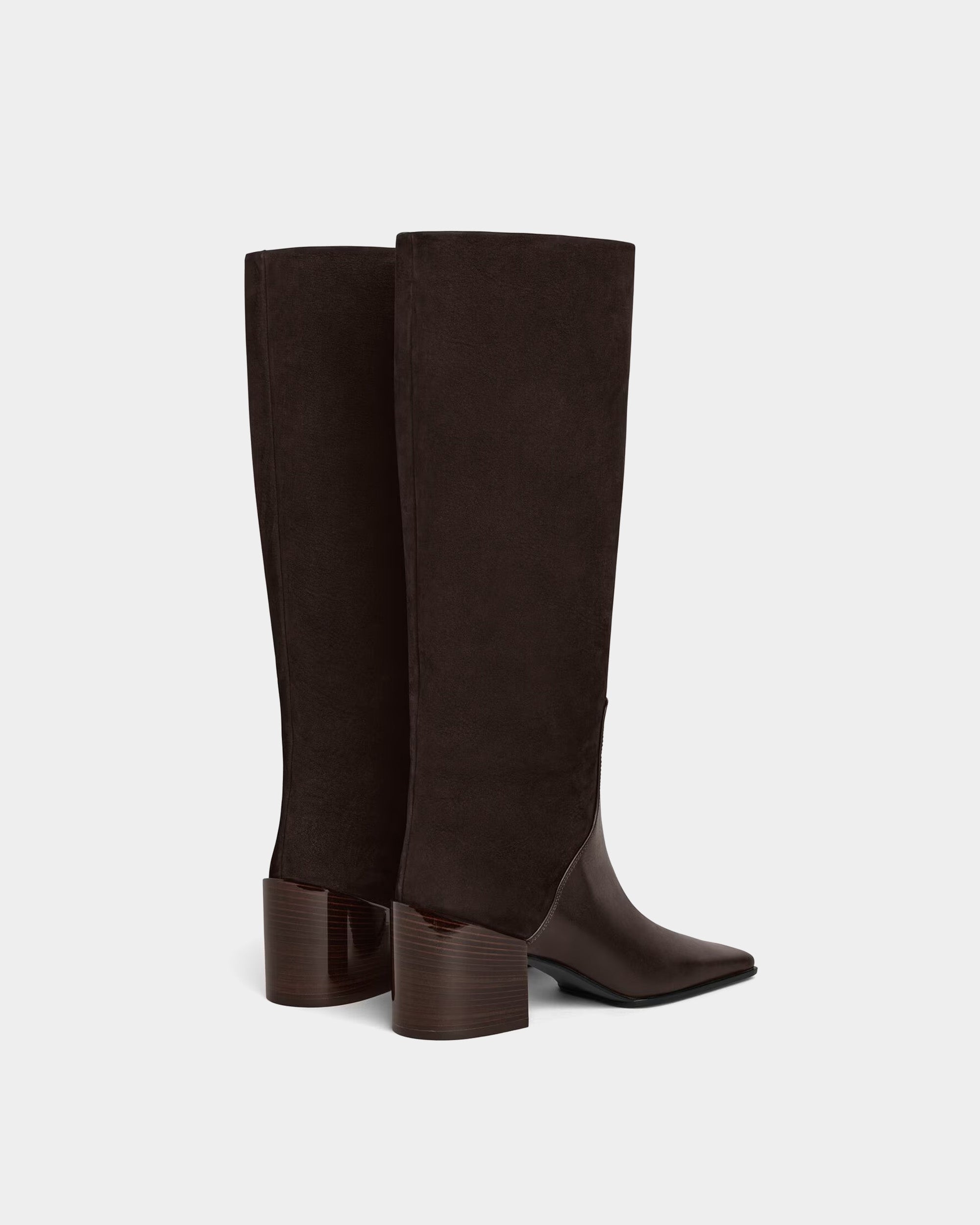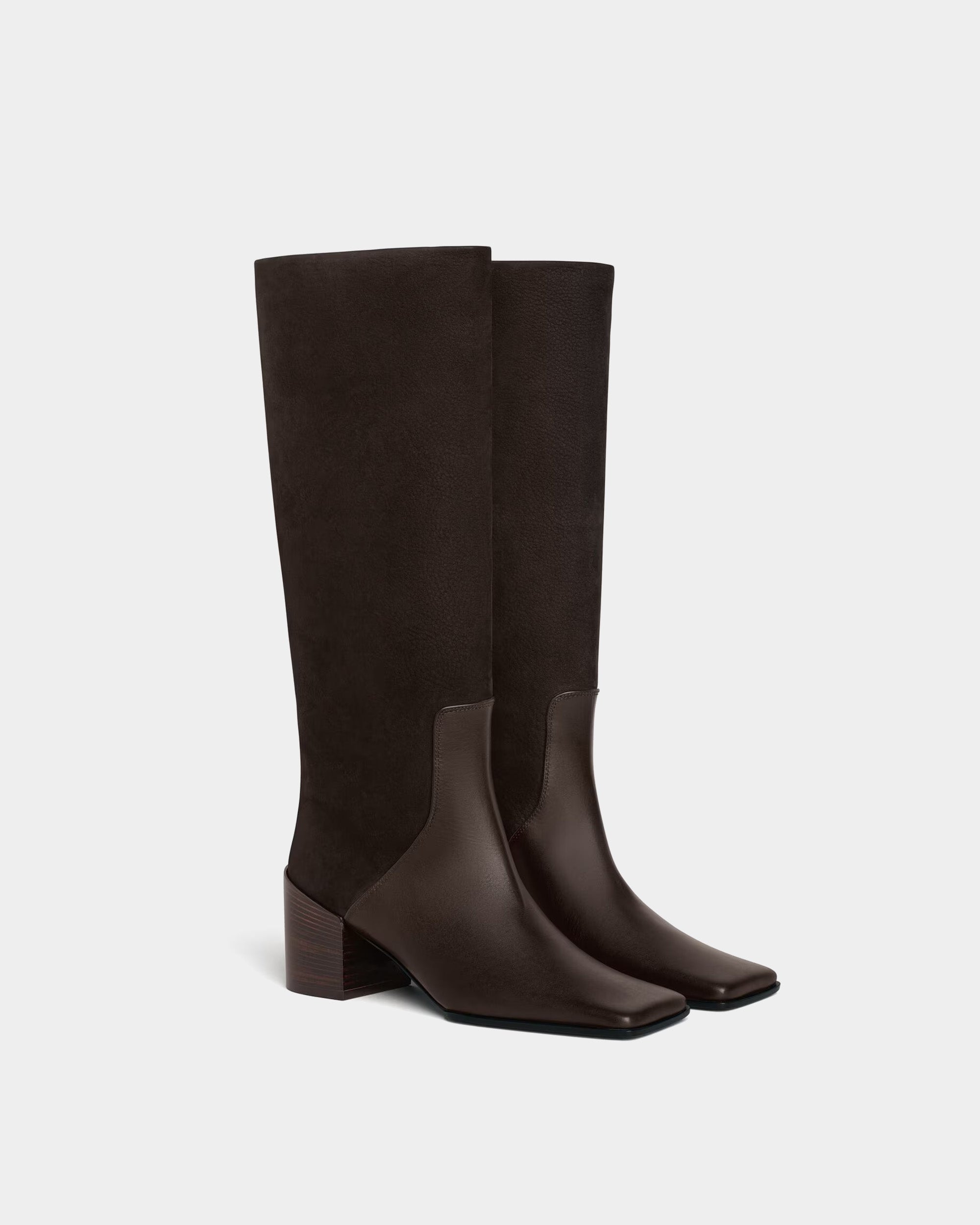 頂級細緻皮革,巧妙運用麂皮與平滑牛皮的異材質拼接,在沈穩的深咖啡色調中交織出層次感。俐落的及膝長度搭配現代感十足的方頭楦頭,加上穩固且具設計感的粗高跟,不僅能修飾腿型曲線,更能在行走間散發自信優雅的時尚氣場,是秋冬衣櫥不可或缺的經典單品。