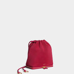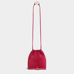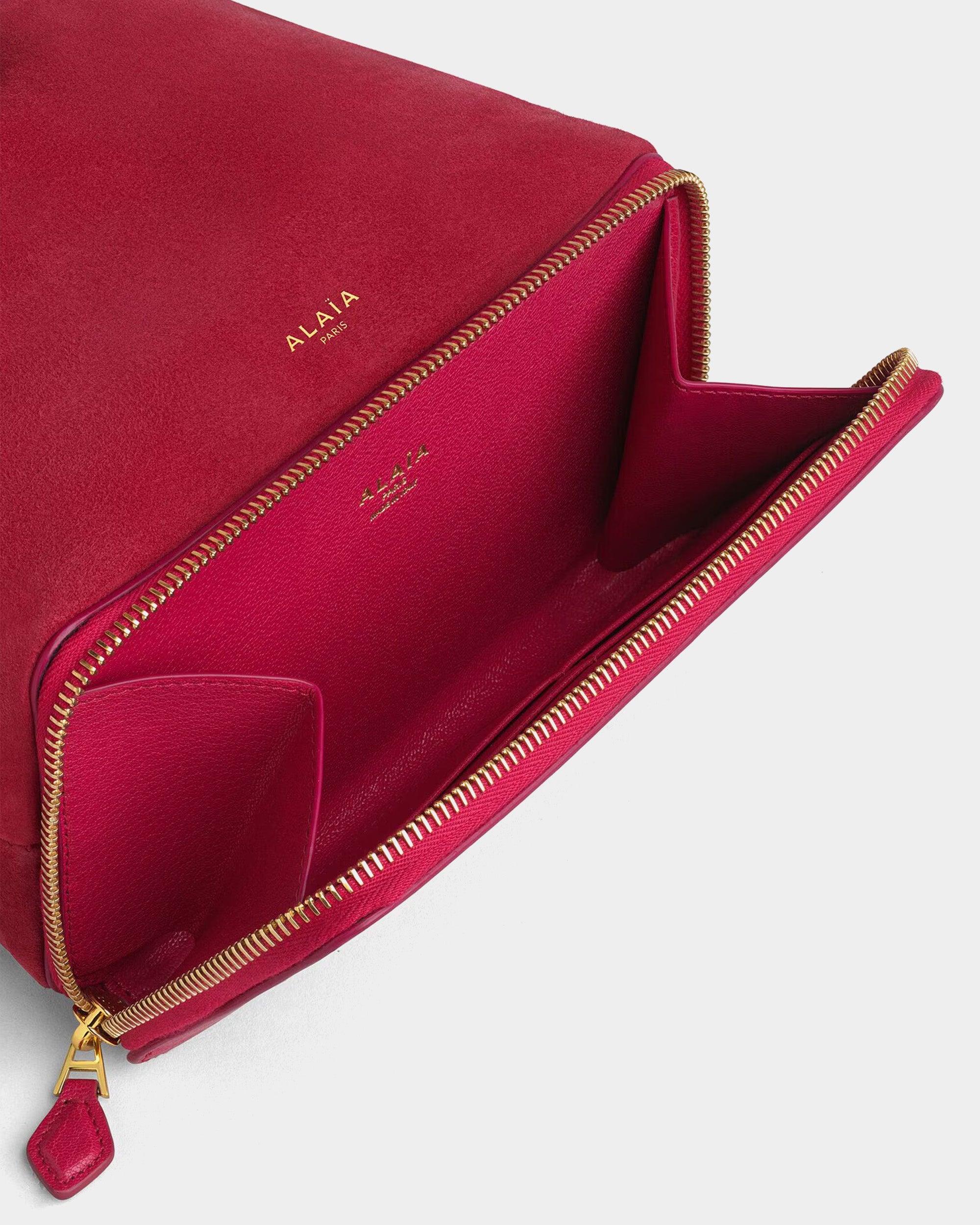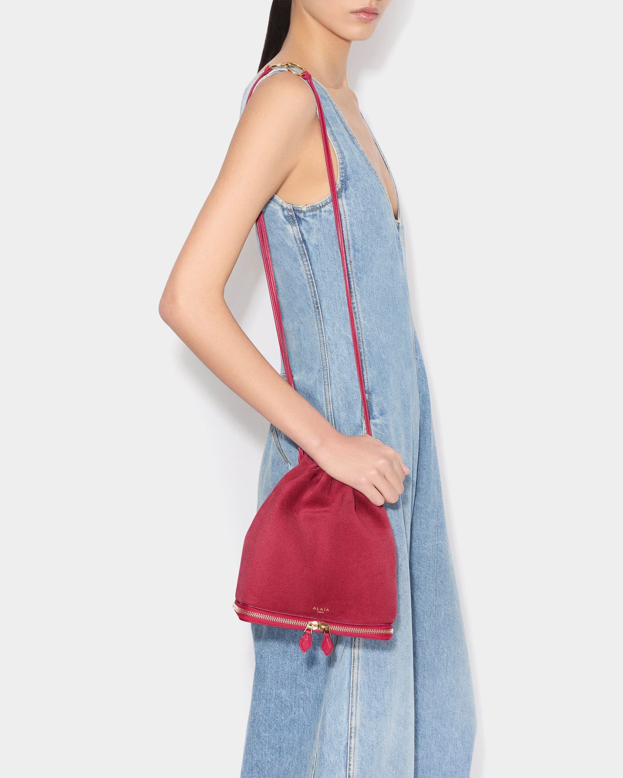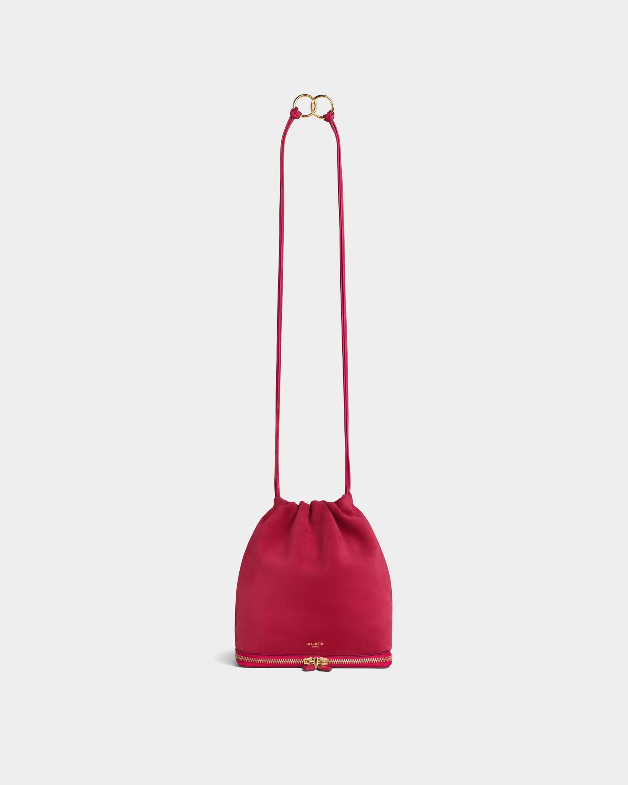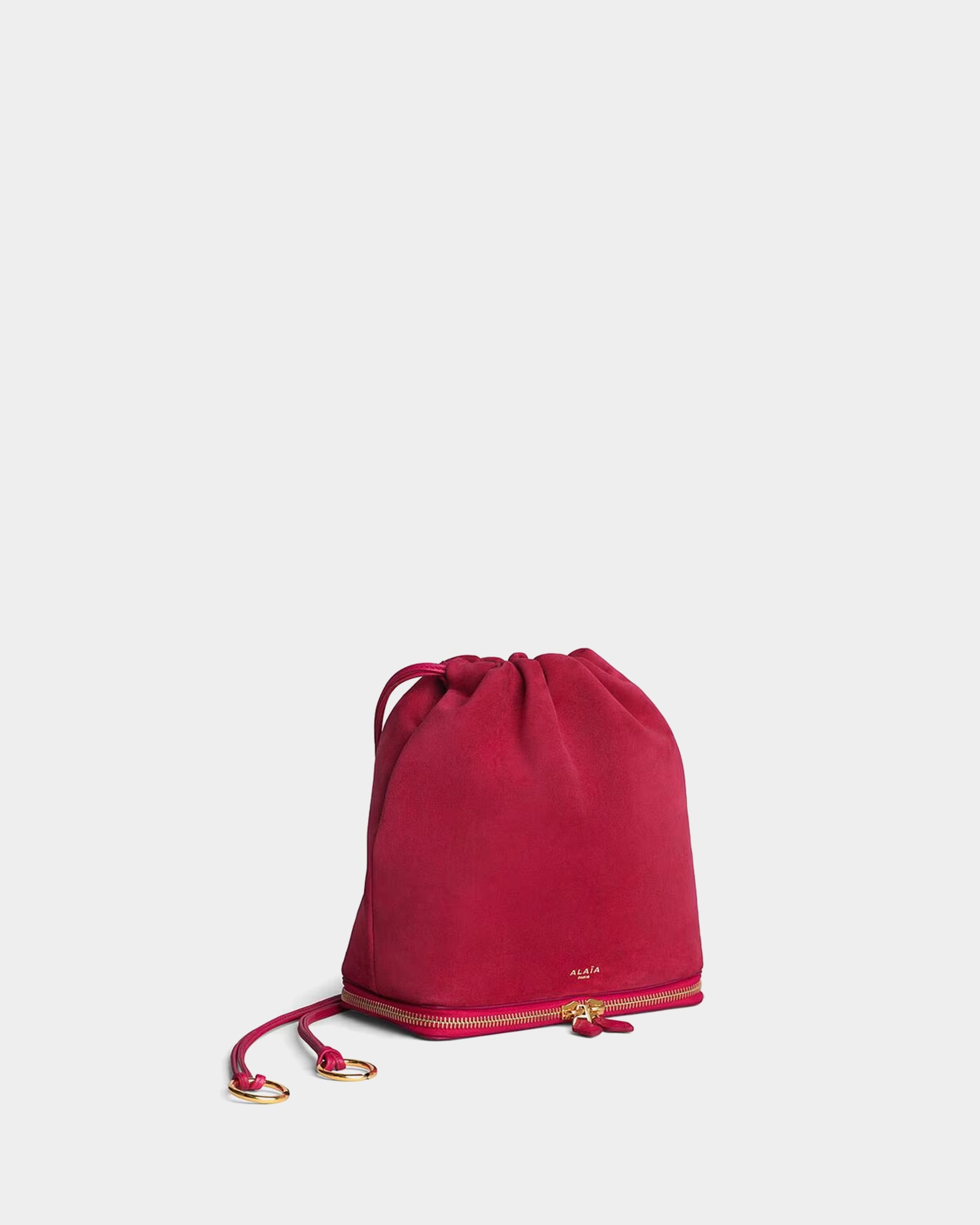 採用頂級麂皮材質打造,ALAÏA 獨具巧思地將柔軟的抽繩束口袋結構與俐落的幾何底座結合。包身線條圓潤優雅,底部配有精緻的金屬拉鍊細節,展現出品牌對結構美學的極致追求。紅色的麂皮觸感細膩且富有層次,能為日常穿搭注入一股迷人而內斂的法式氛圍。