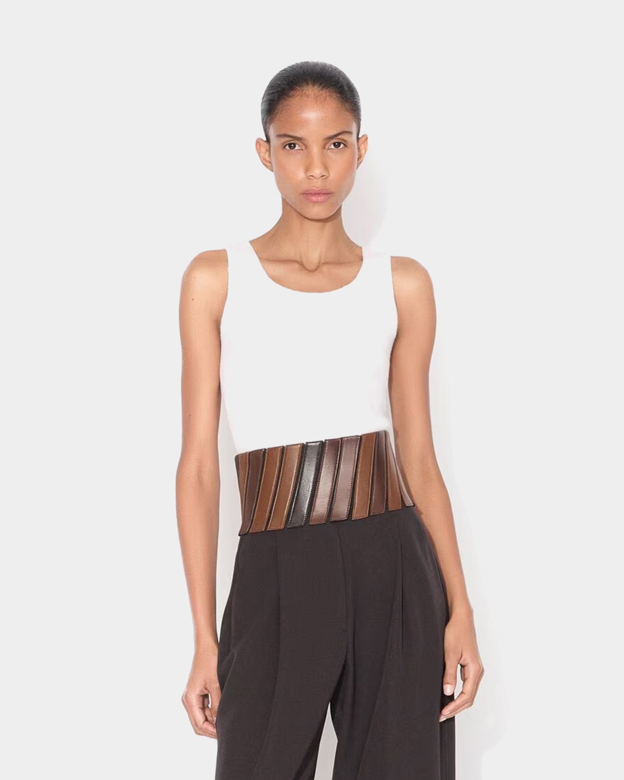 選用頂級親膚羊毛面料,將品牌標誌性的雕塑美學完美實現在日常單品中。這款背心採用獨特的馬甲式結構線條,透過精緻的織法在腰際勾勒出曼妙曲線,不僅展現了洗鍊的建築感,更賦予基礎背心無與倫比的高級感輪廓。簡潔的圓領設計平衡了結構的張力,無論是單穿或作為內搭,都能散發自信優雅的法式氣場。