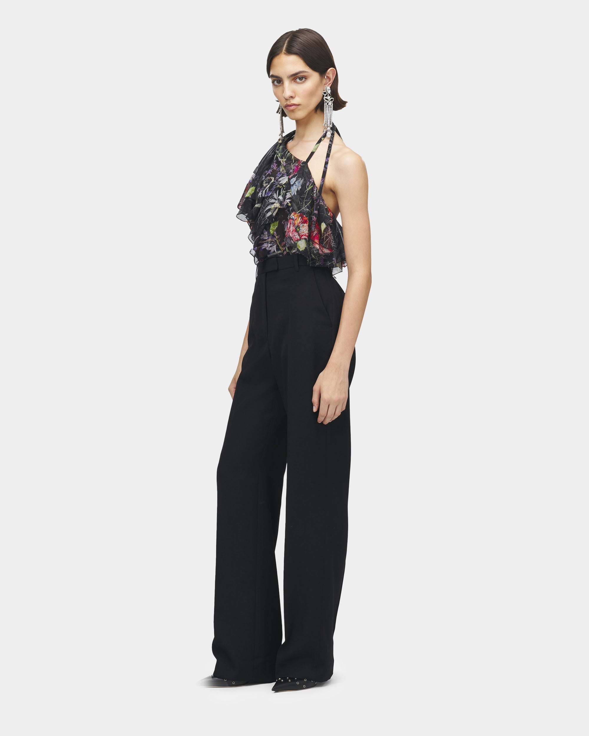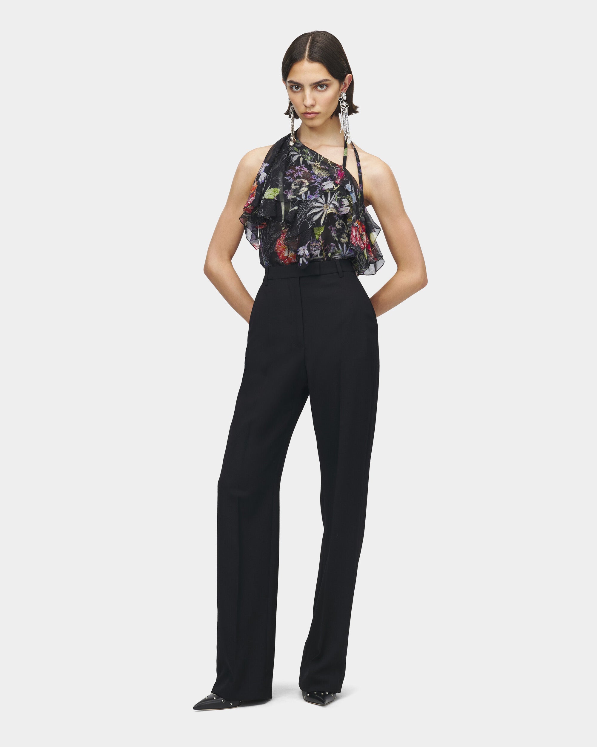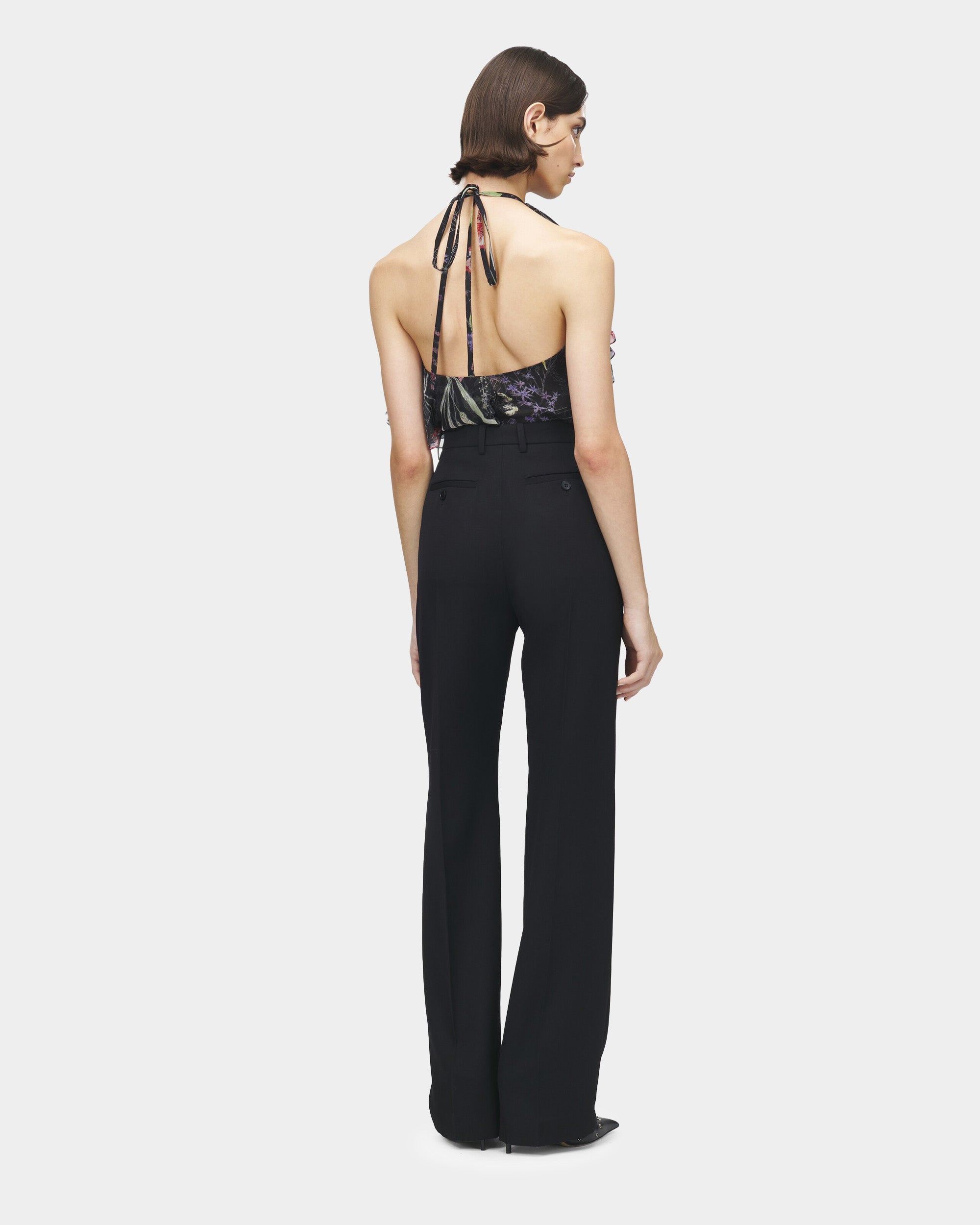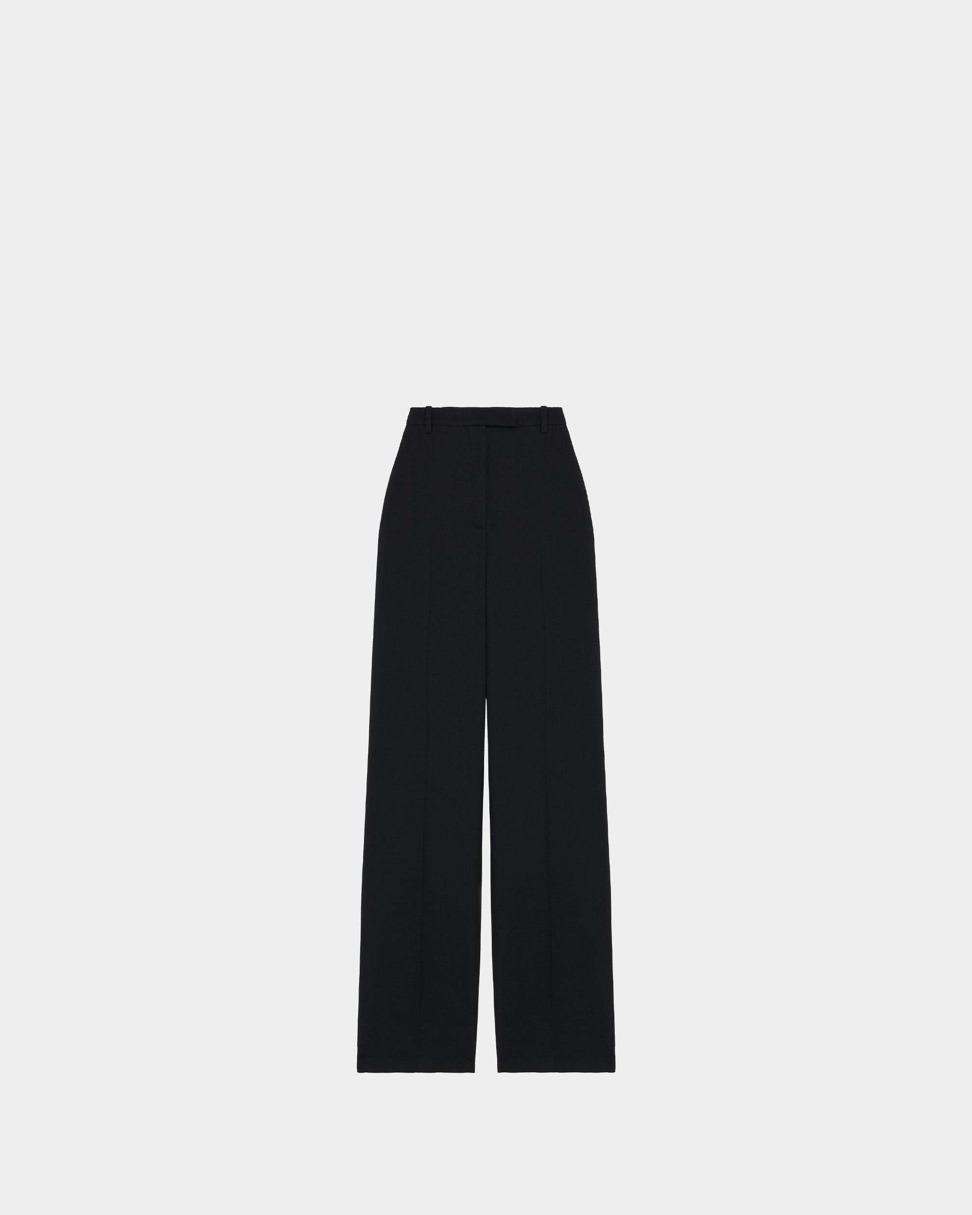 這款黑色高腰西裝褲採用細膩的羊毛裁製,修飾腰線的高腰剪裁搭配直落褲型,結合隱藏式拉鍊與鉤扣門襟設計,兩側俐落口袋與後方雙貼袋細節提升實用性與視覺層次感,是典雅剪裁與日常摩登風格兼具的精品長褲。