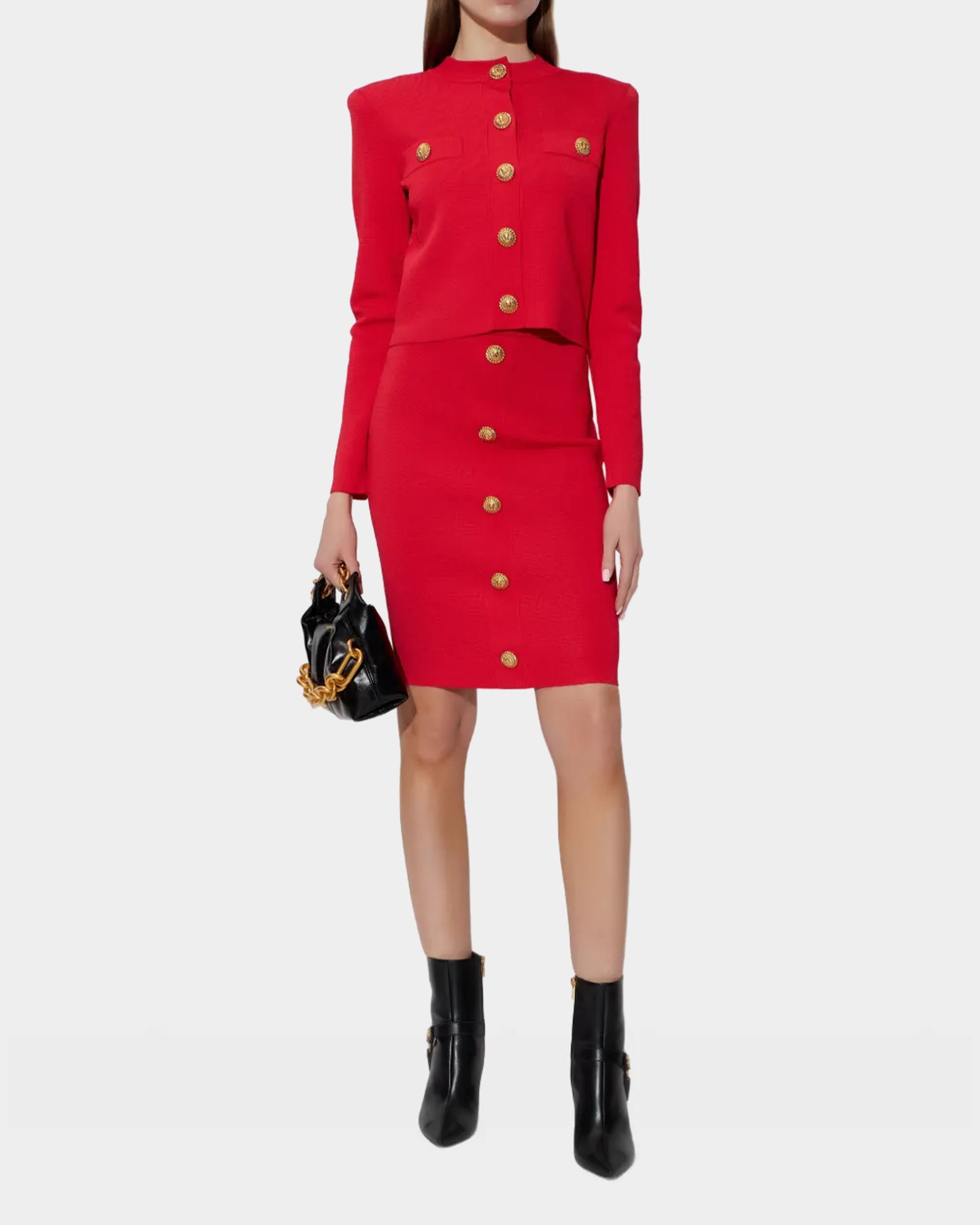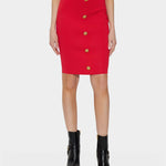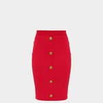 膝長裙以緊緻嫘縈混紡材質製作,整體線條俐落,展現簡潔而成熟的輪廓。正面鈕扣細節為造型增添層次感,背面拉鍊設計則兼顧穿脫便利性