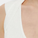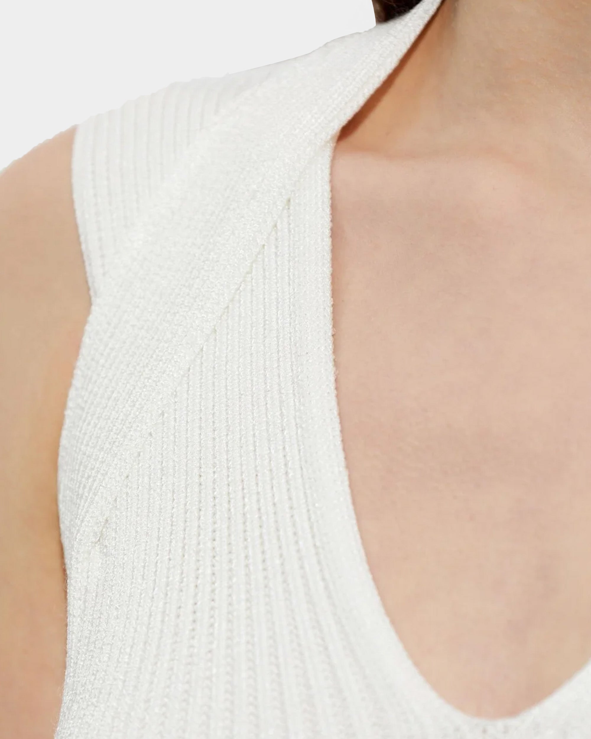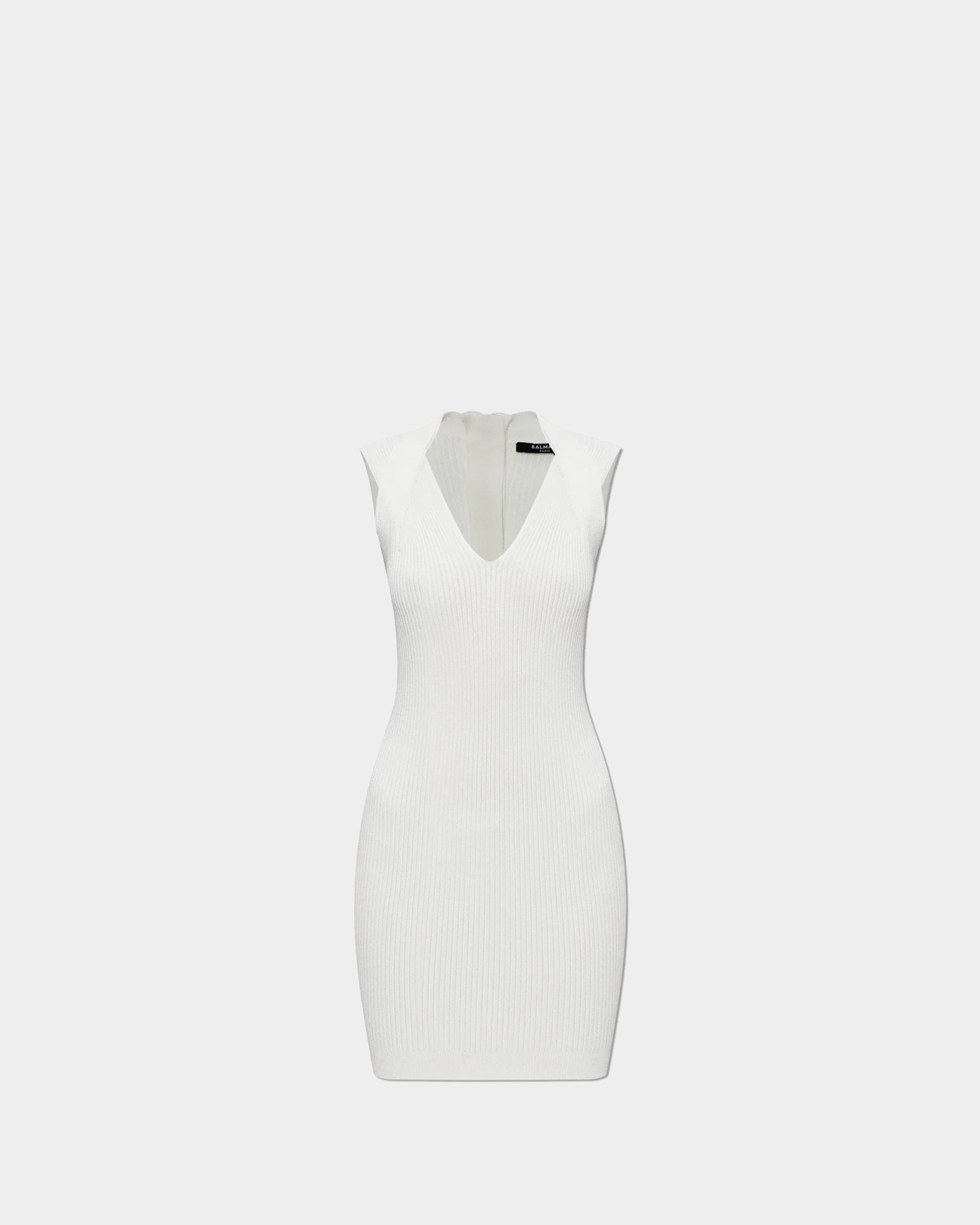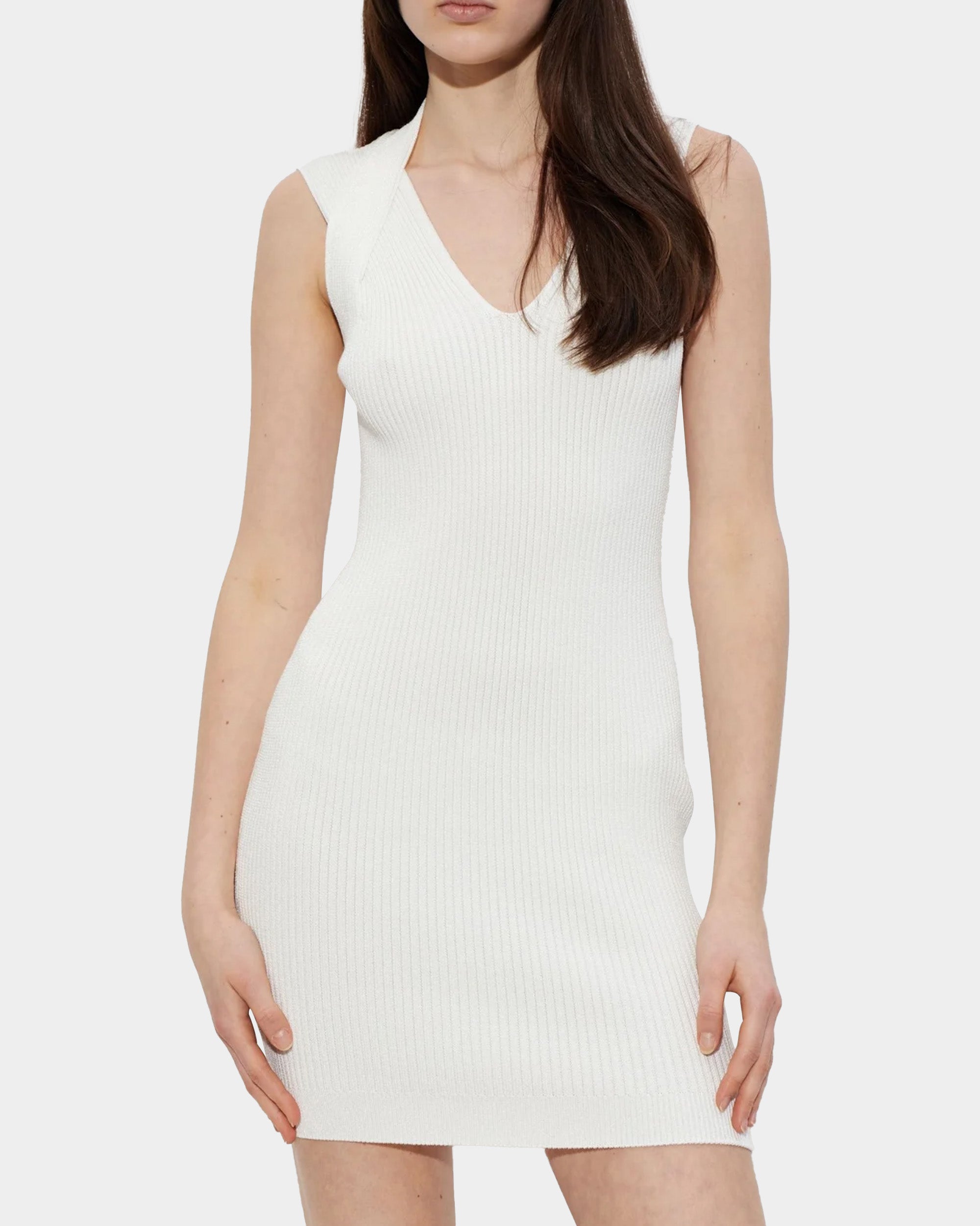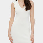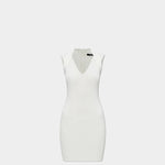 修身迷你連身裙以細緻的羅紋紋理呈現,搭配純淨的象牙白色調,整體線條俐落而優雅。無袖剪裁與 V 領設計自然修飾身形,展現輕盈且具女人味的輪廓。設計簡約不繁複,卻能靈活因應不同場合,無論日常聚會、晚宴或現代感派對造型,都能輕鬆駕馭。