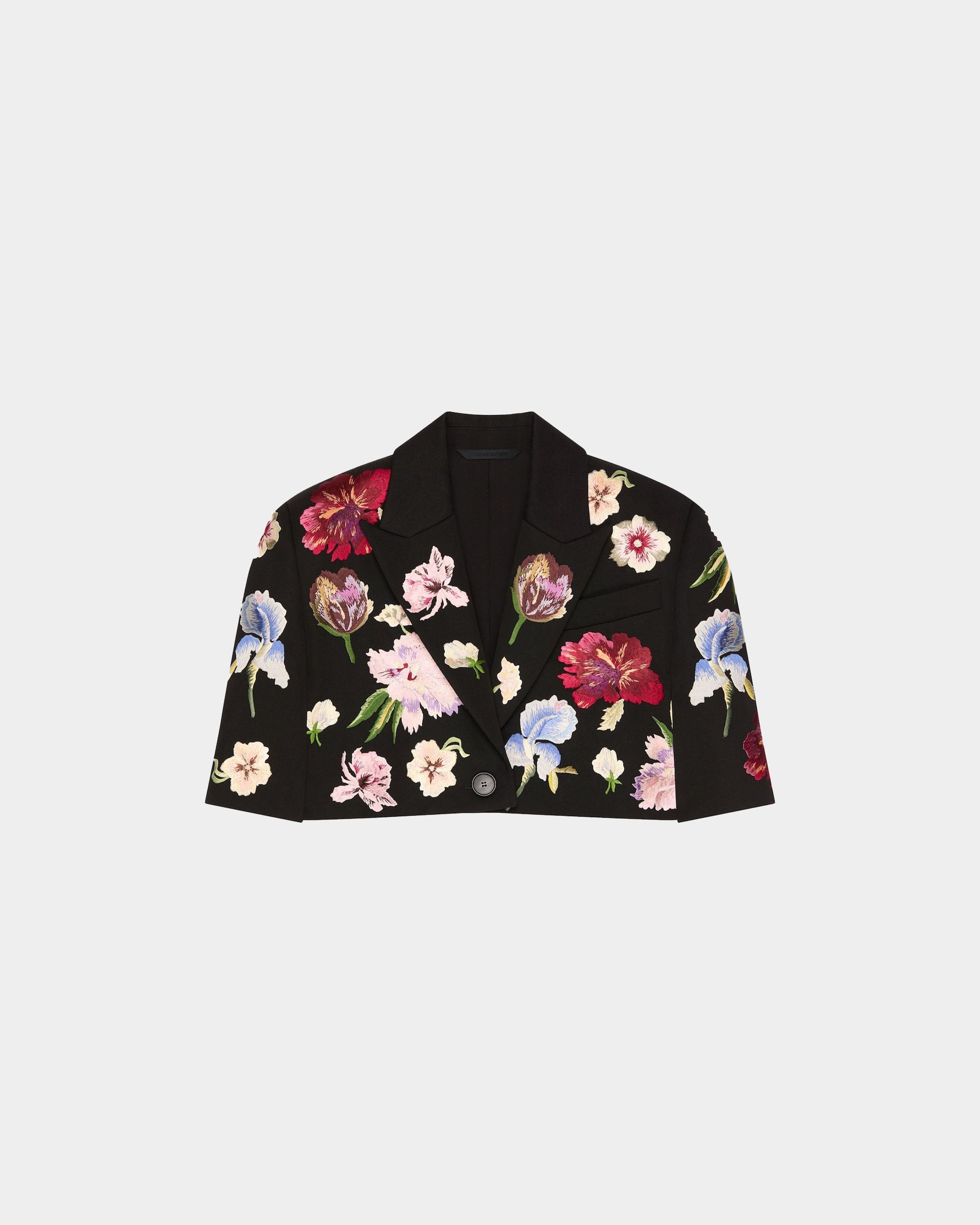 這款 Givenchy 黑色短版外套採用羊毛製作,搭配精緻的花卉刺繡細節,短袖剪裁結合俐落的單排扣設計與尖翻領,胸前口袋與緞面內裡提升質感,整體剪裁結構分明又兼具優雅時尚感。