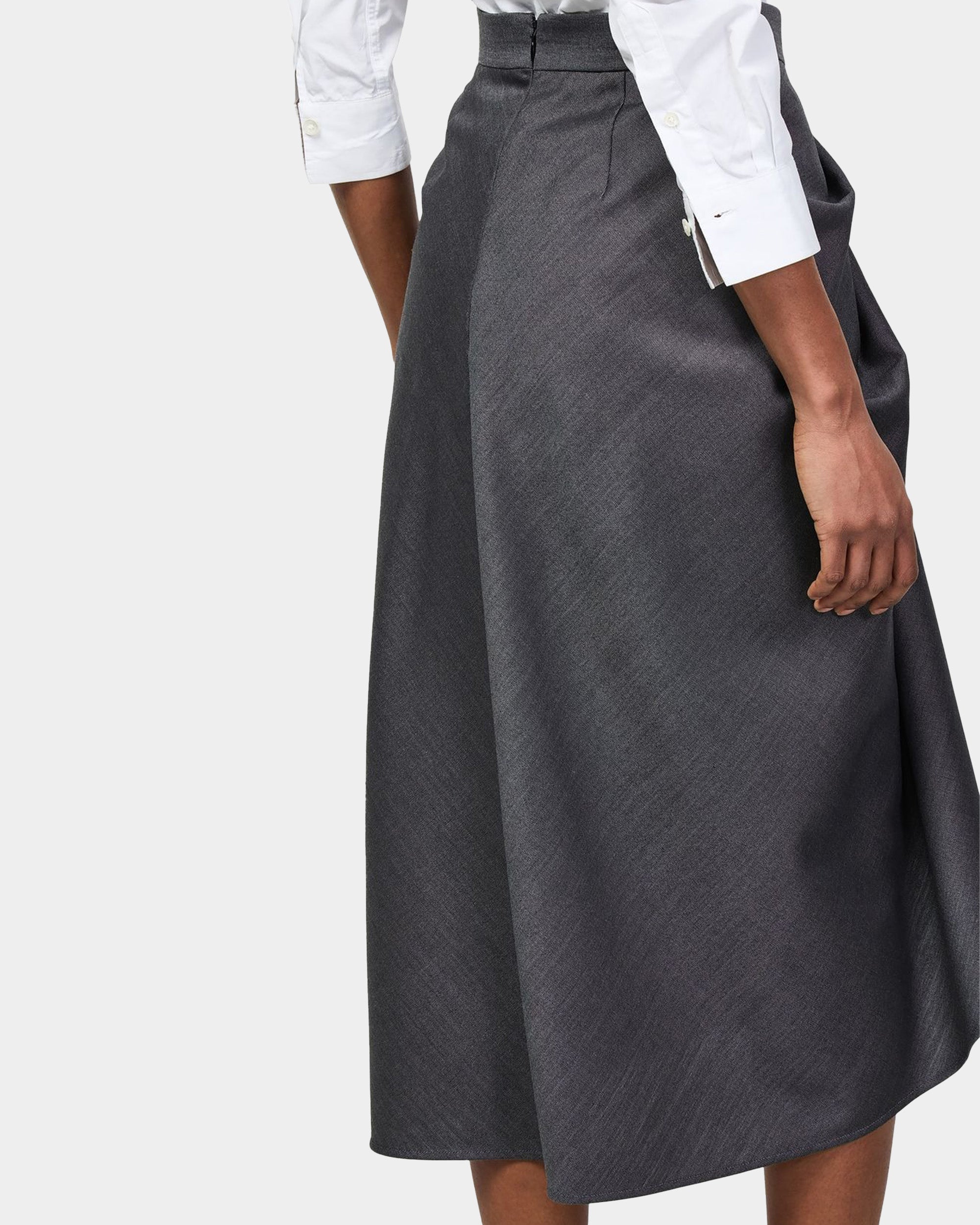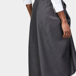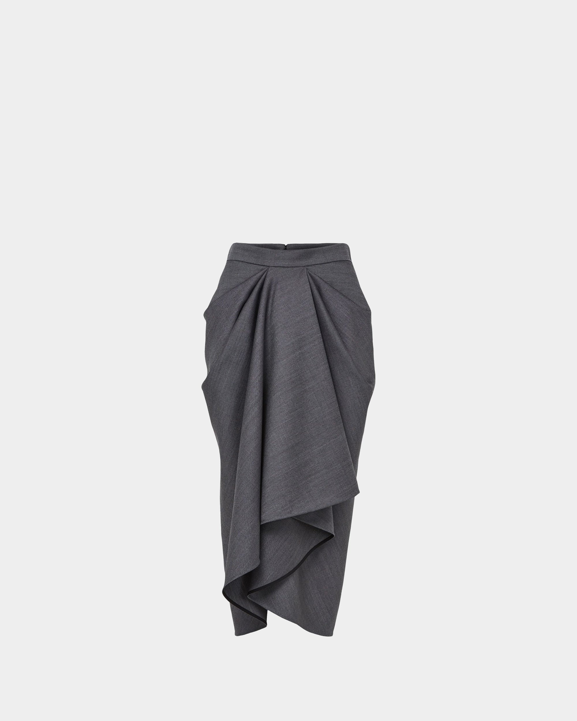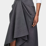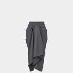 這款 Givenchy 灰色中長裙以羊毛製作,裙前片呈戲褶垂墜效果,靈感源自將皮革外套隨意披掛在模特身上的姿態;布料在身上扭轉環繞,散發性感線條感。前片開衩與口袋設計增添動感與率性態度,後側配有隱形拉鍊方便穿脫,整體兼具摩登優雅與高級質感。