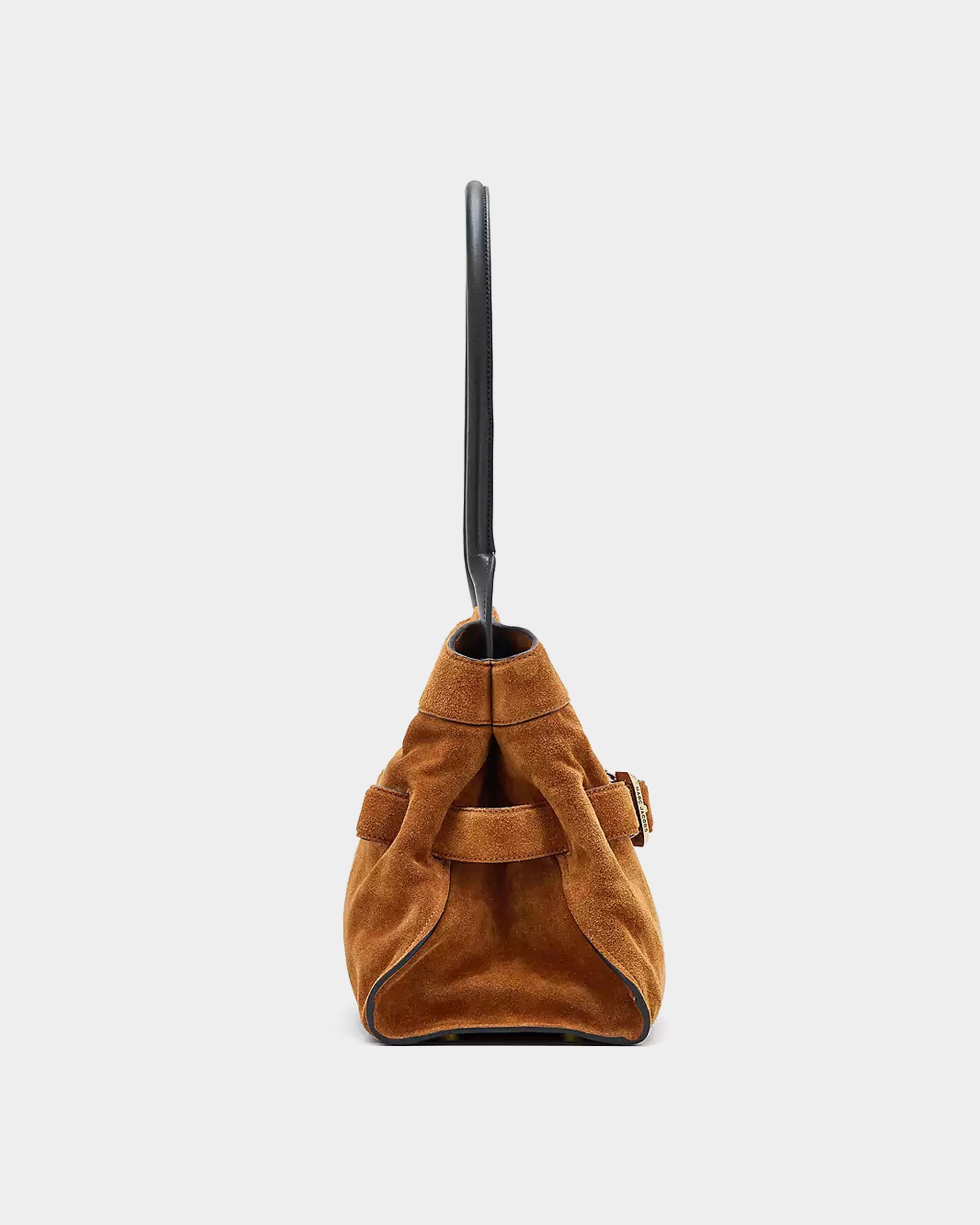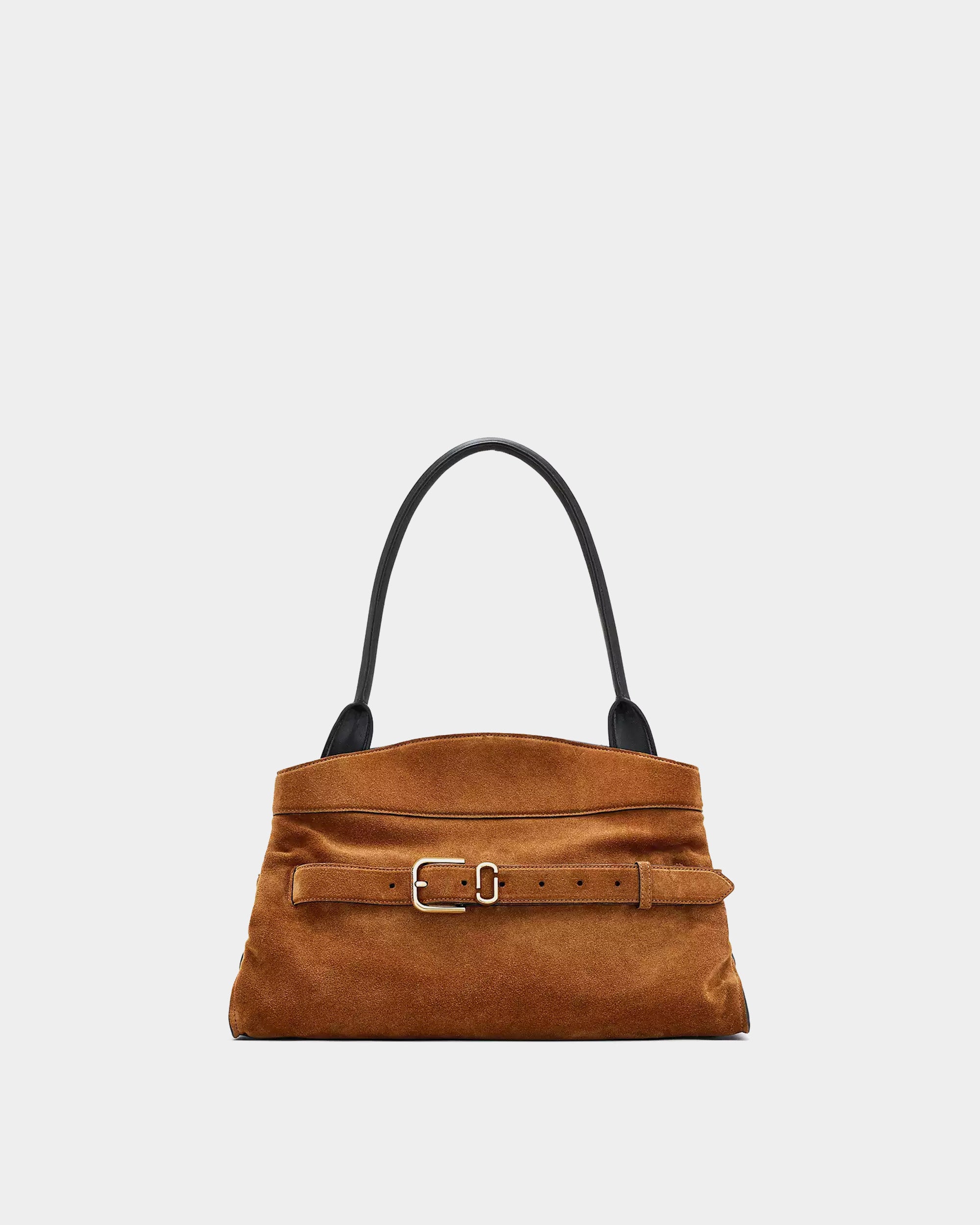 柔軟高級麂皮打造,呈現自然垂墜的優雅線條。包身以可調式皮革腰帶與金屬釦環點綴,展現復古與都會並存的風格。寬敞包內空間附有拉鍊口袋與多層收納,搭配光滑皮革手把,兼具實用與高級質感,為秋冬造型增添一抹沈穩魅力。