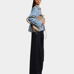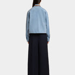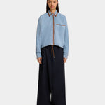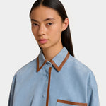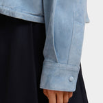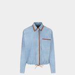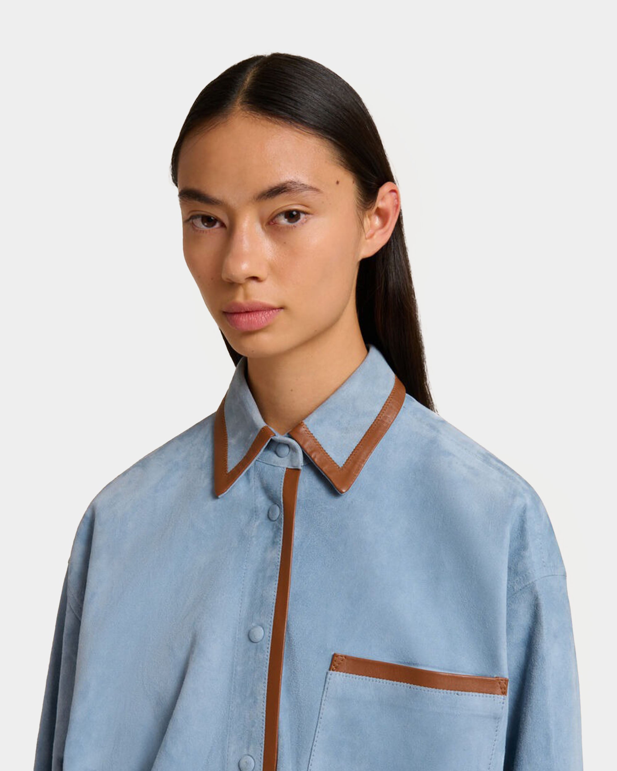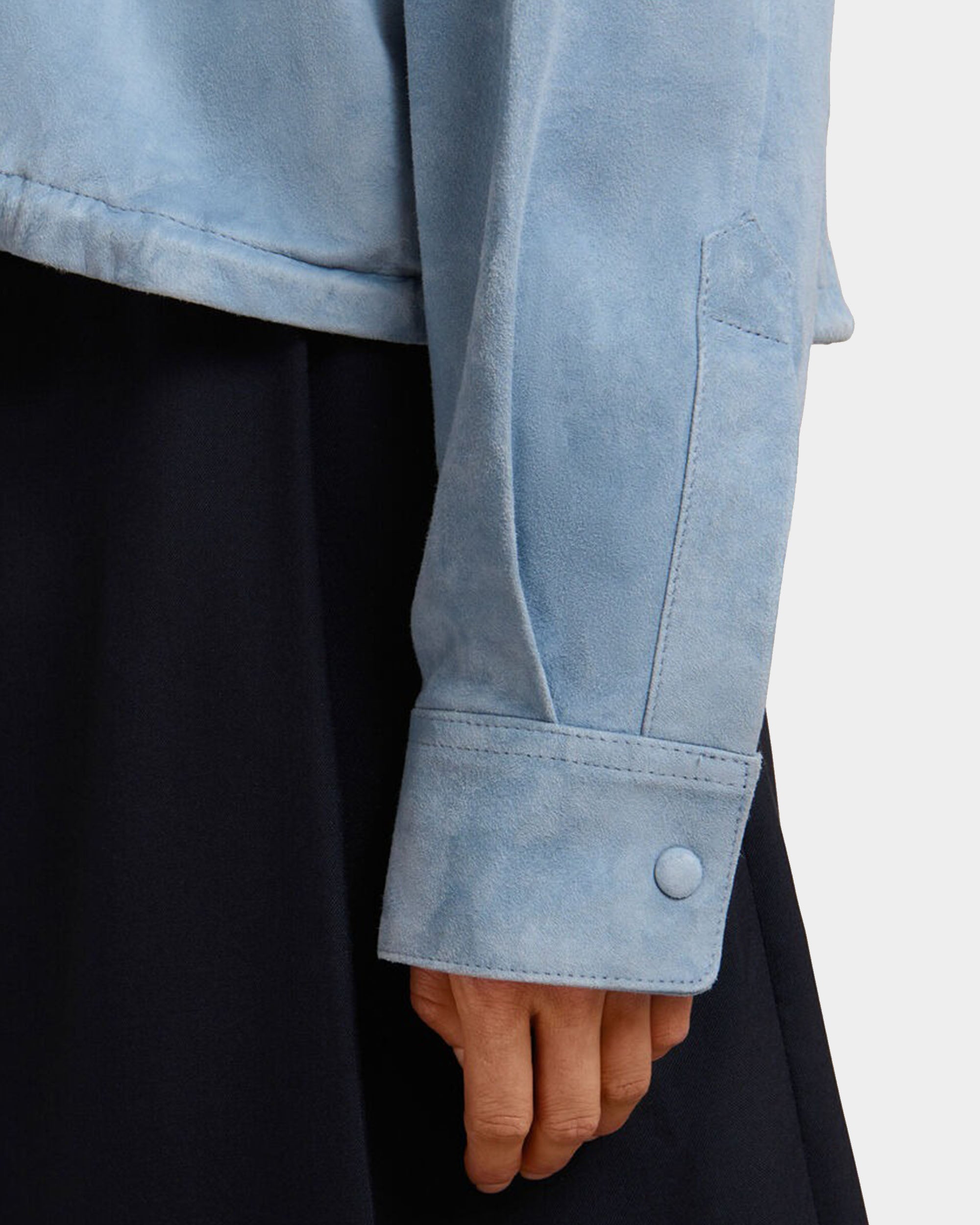 採用 100% 小羊絨絨面皮革製作,搭配對比色 Nappa 皮革滾邊細節。剪裁為 落肩長袖襯衫,下擺可調抽繩,前胸口袋與同色鈕扣,背部壓印品牌標識,義大利製造。