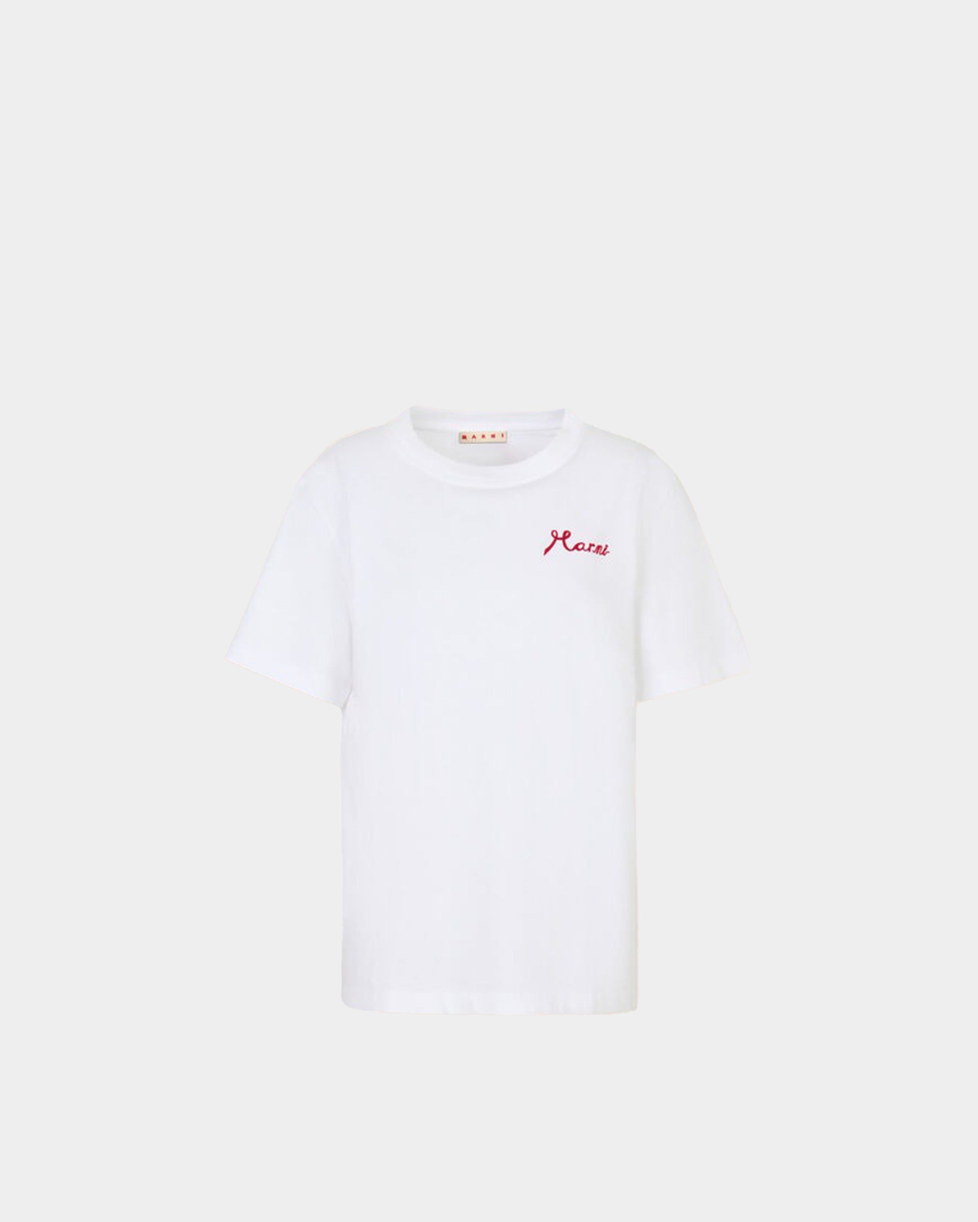 白色棉質短袖T恤,採用 100% 棉,胸前 絨面立體 Marni 標識,圓領剪裁,舒適休閒,義大利製造。
