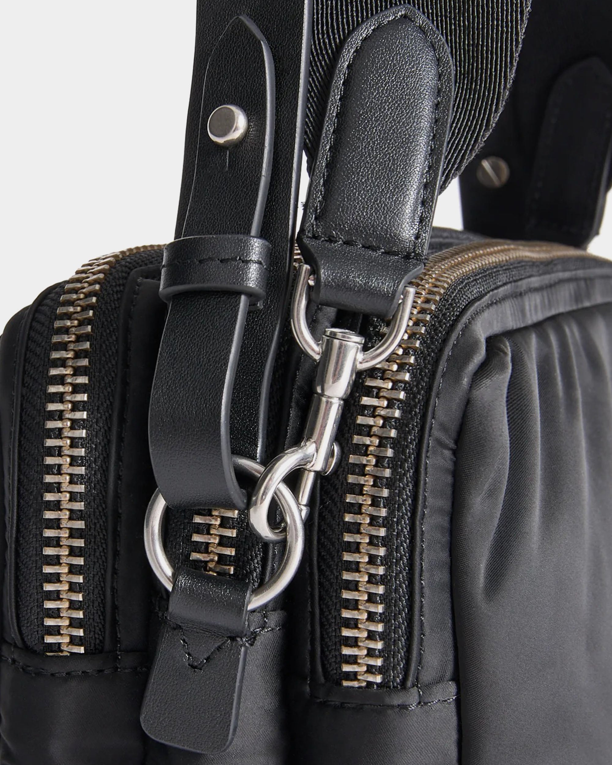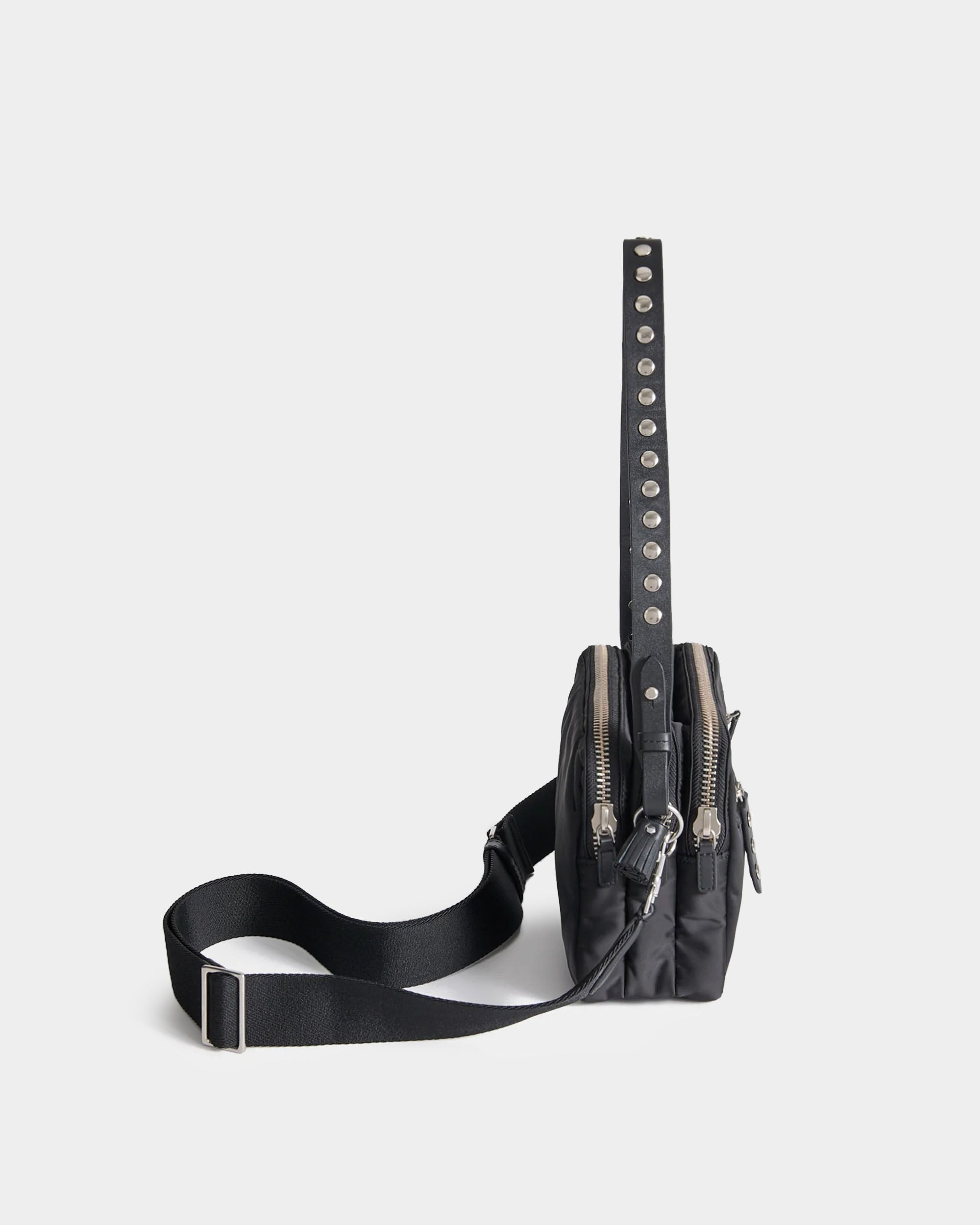 此款斜背包以實用收納為核心設計,適合日常通勤或旅行使用。採用再生鋪棉緞面材質製作,質地輕盈柔軟,兼具環保理念與時尚風格。包身以三個拉鍊隔層為主要結構,其中一個隔層搭配手工流蘇拉鍊頭,增添細節層次。寬敞空間可收納手機、皮夾與化妝品等隨身物品,前側標示口袋則方便整理耳機與鑰匙。搭配鉚釘肩背帶與長版織帶斜背帶設計,可依需求自由切換背法,兼具造型與機能。